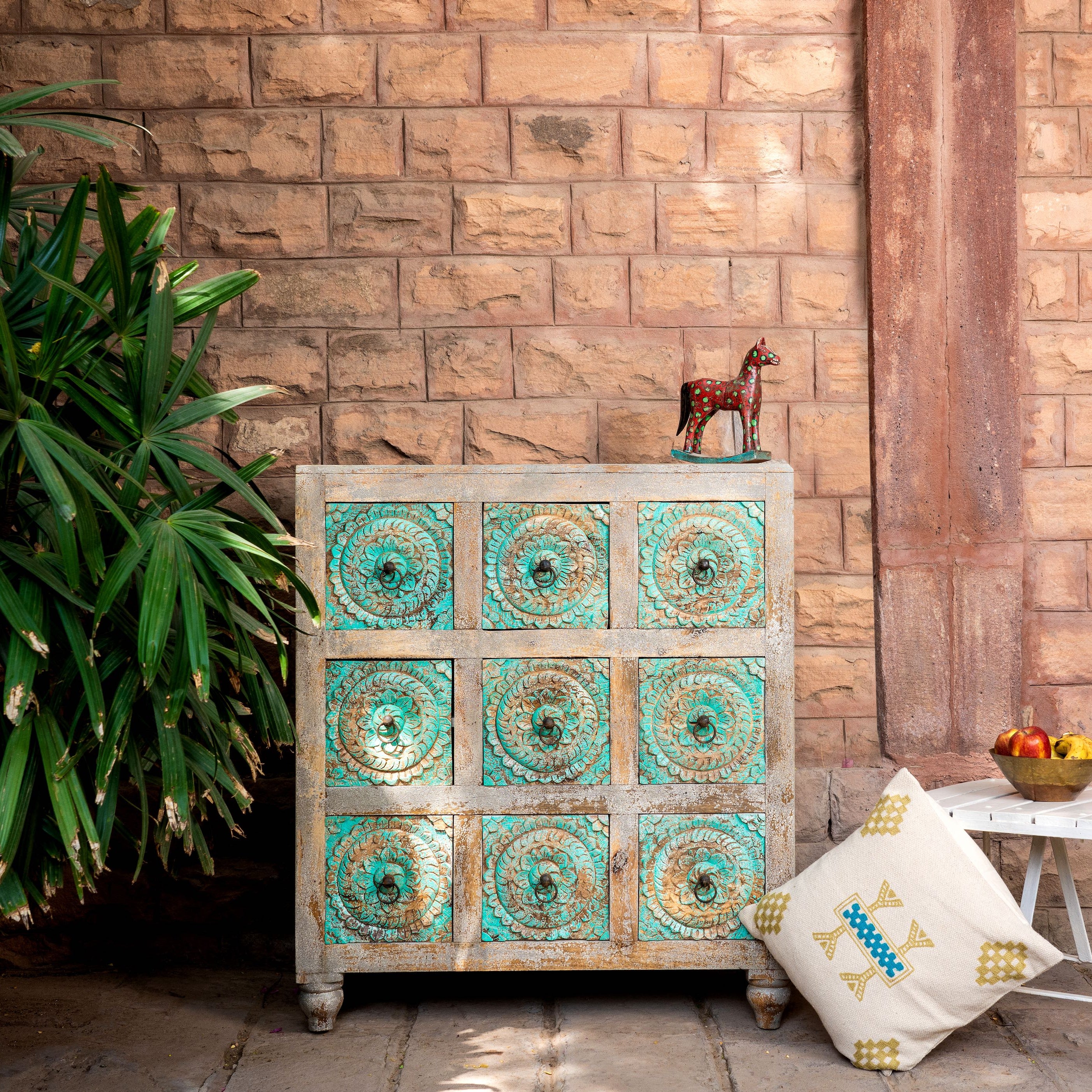 Indian craftsmanship is evident in the production of our solid wood furniture. The elaborately decorated cabinet fronts are hand-painted and surprise with their interplay of colours. Intricate floral motifs adorn the entire surface of individual cabinets, ensuring that your solid wood furniture looks like cabinets. But that's not all: the unique combination of robust wood and delicate painting creates a special contrast. Store your belongings in fine solid wood furniture and create your own unique style with our offers.