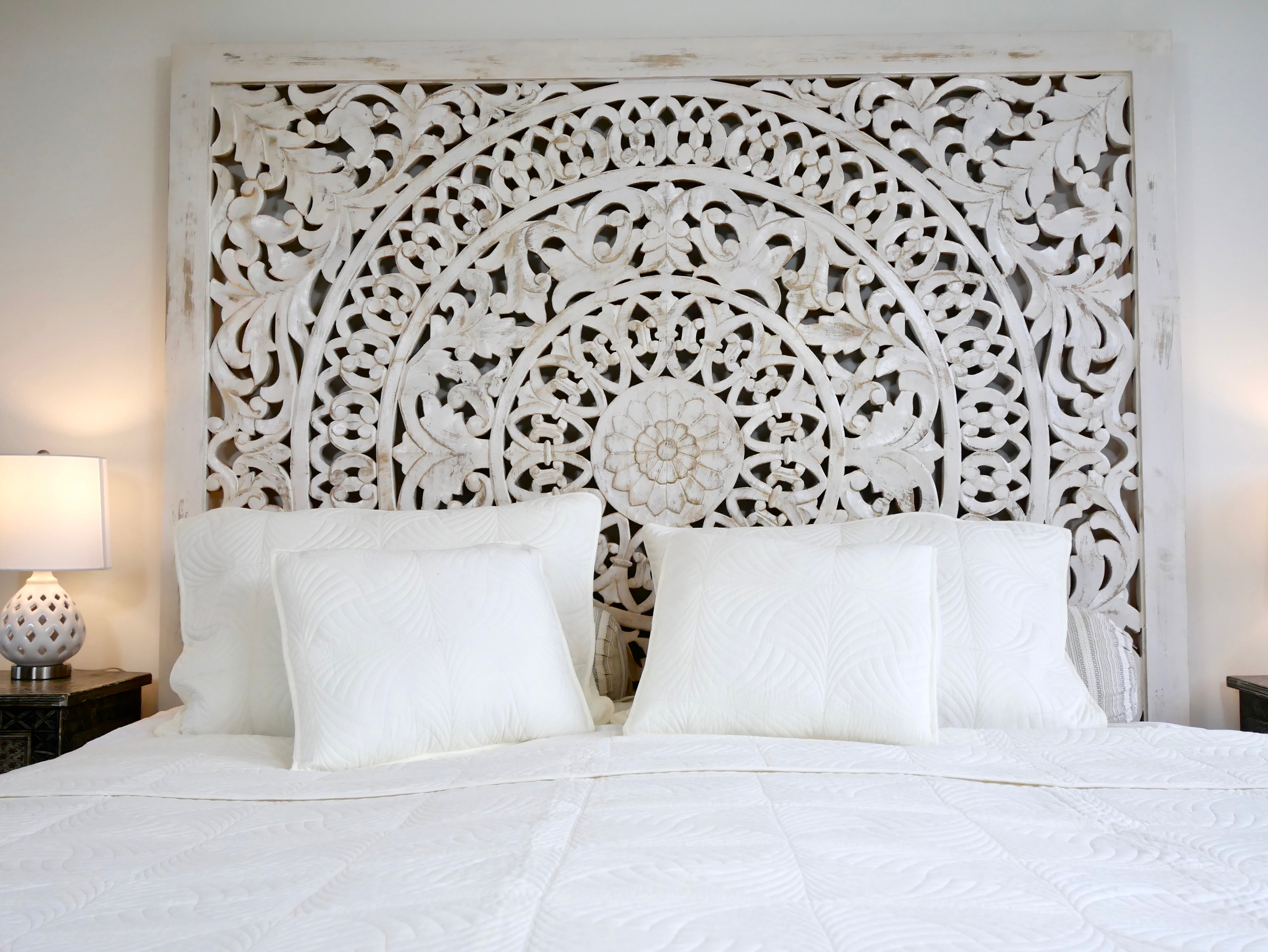 This bed cover made of 100% unbleached natural cotton is richly embroidered and comes in a set with two with 2 small and 2 large pillowcases.