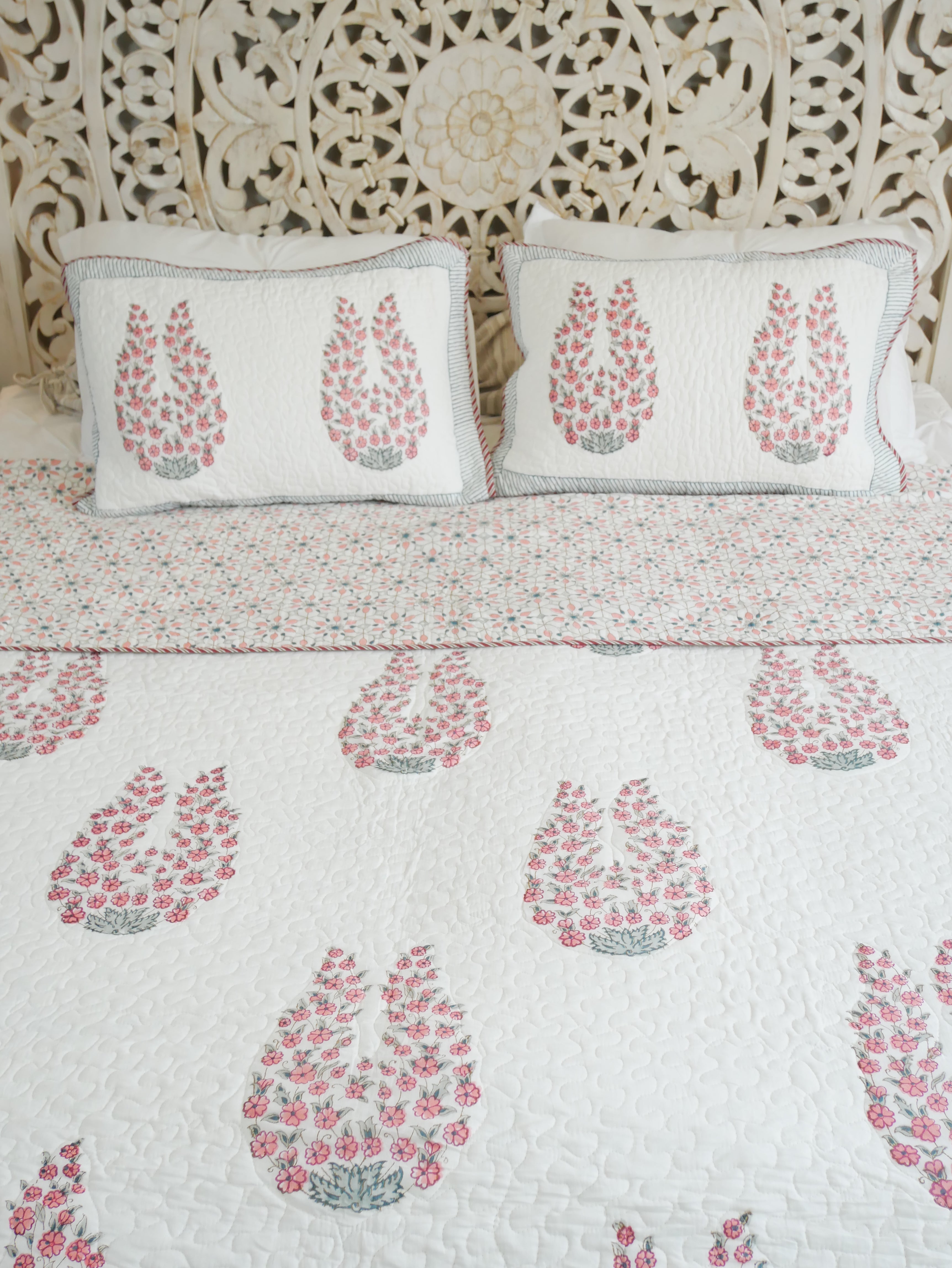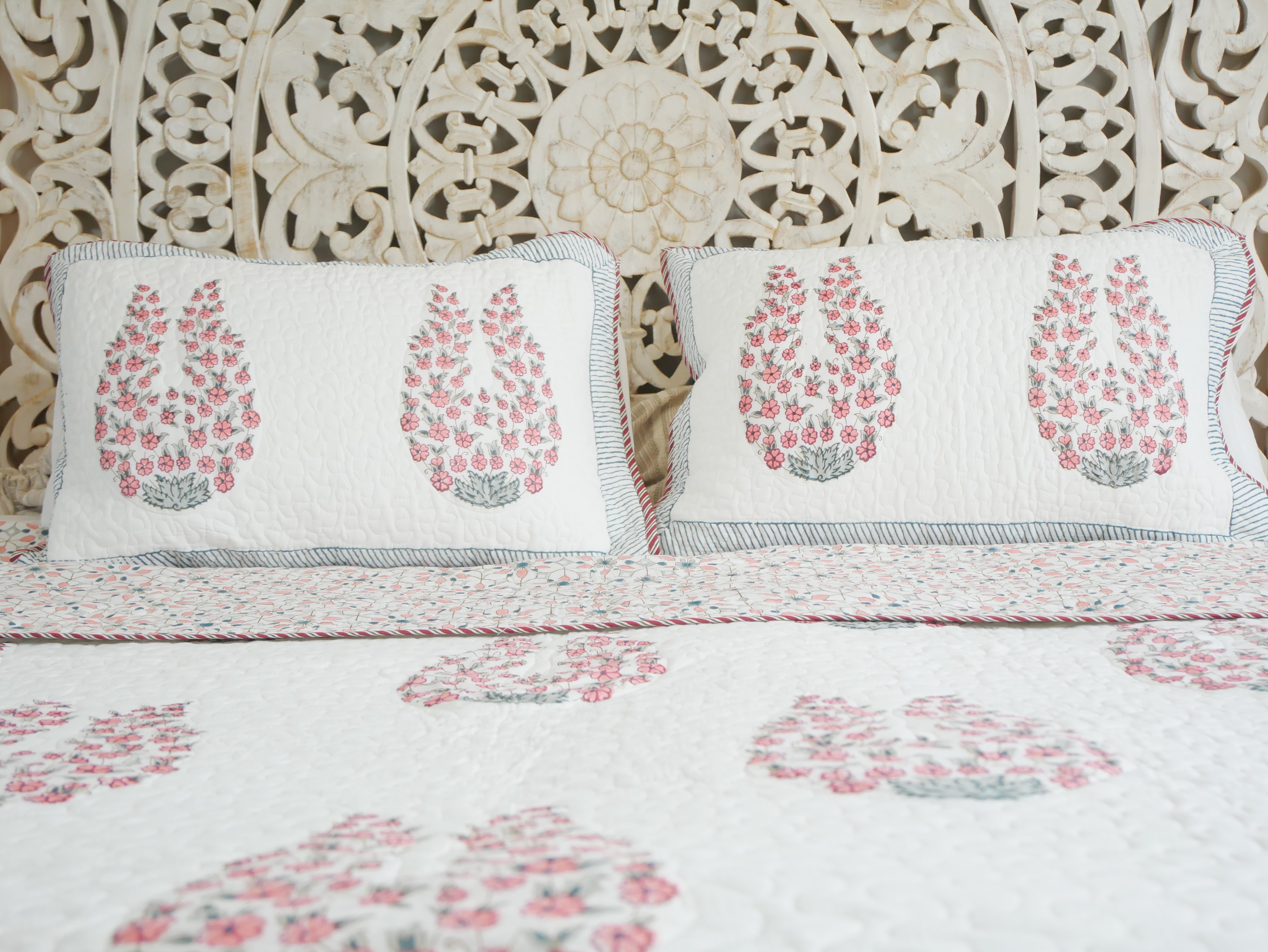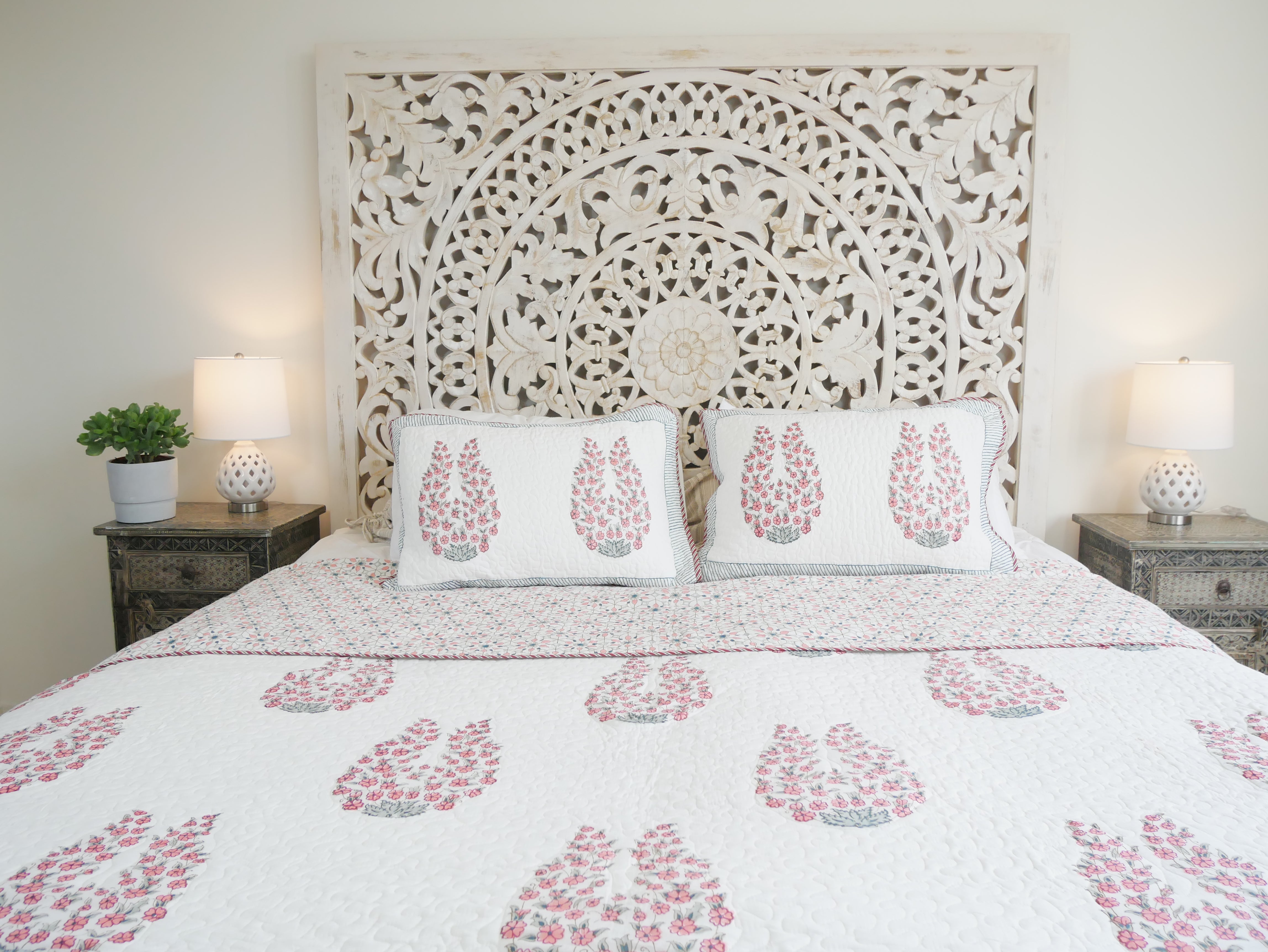 This beautiful handmade 220x250 cm block print bedspread is printed on both sides and can be twisted into two different pattern combinations. The bedspread comes with two 50x70 cm pillowcases.