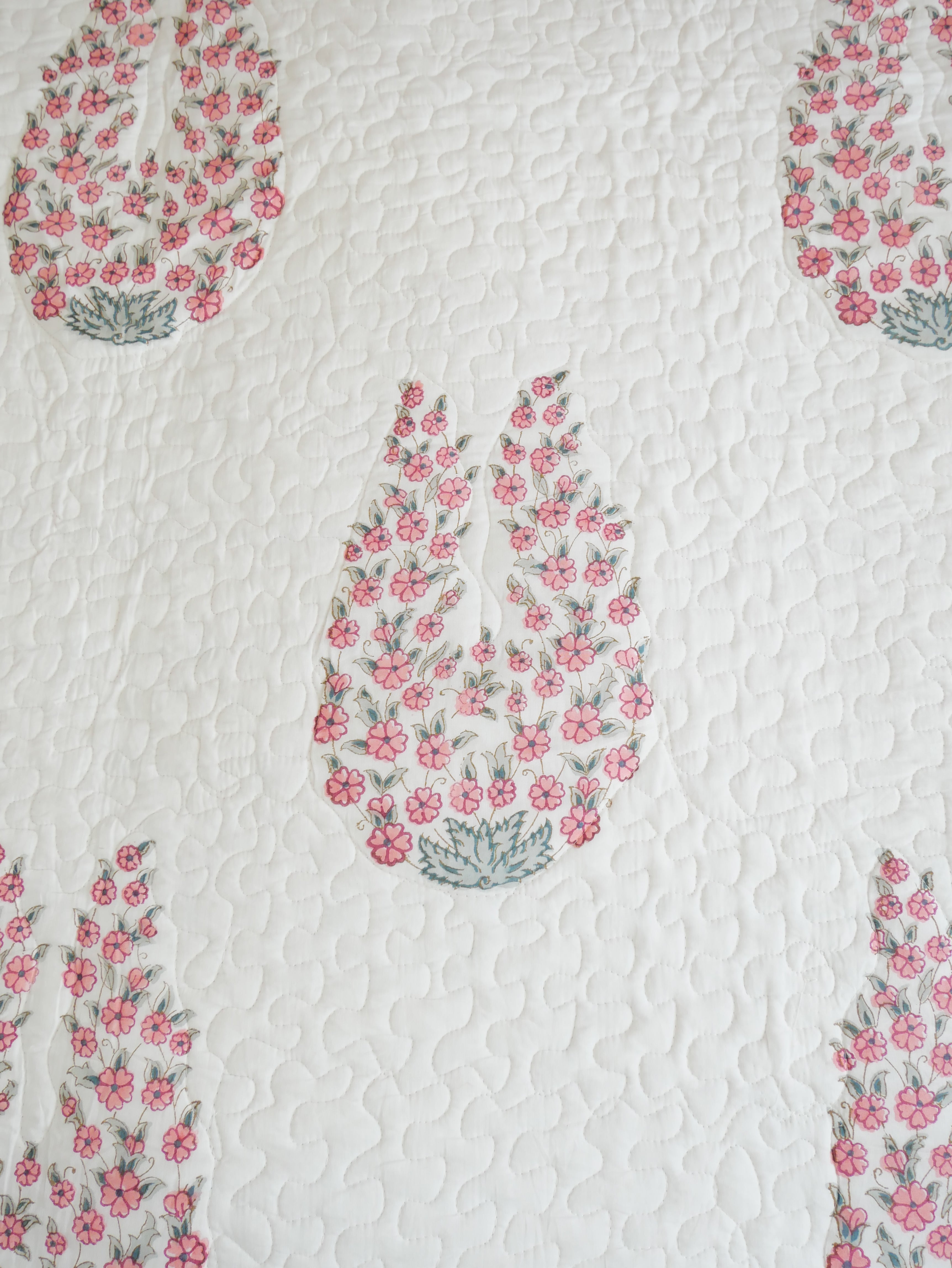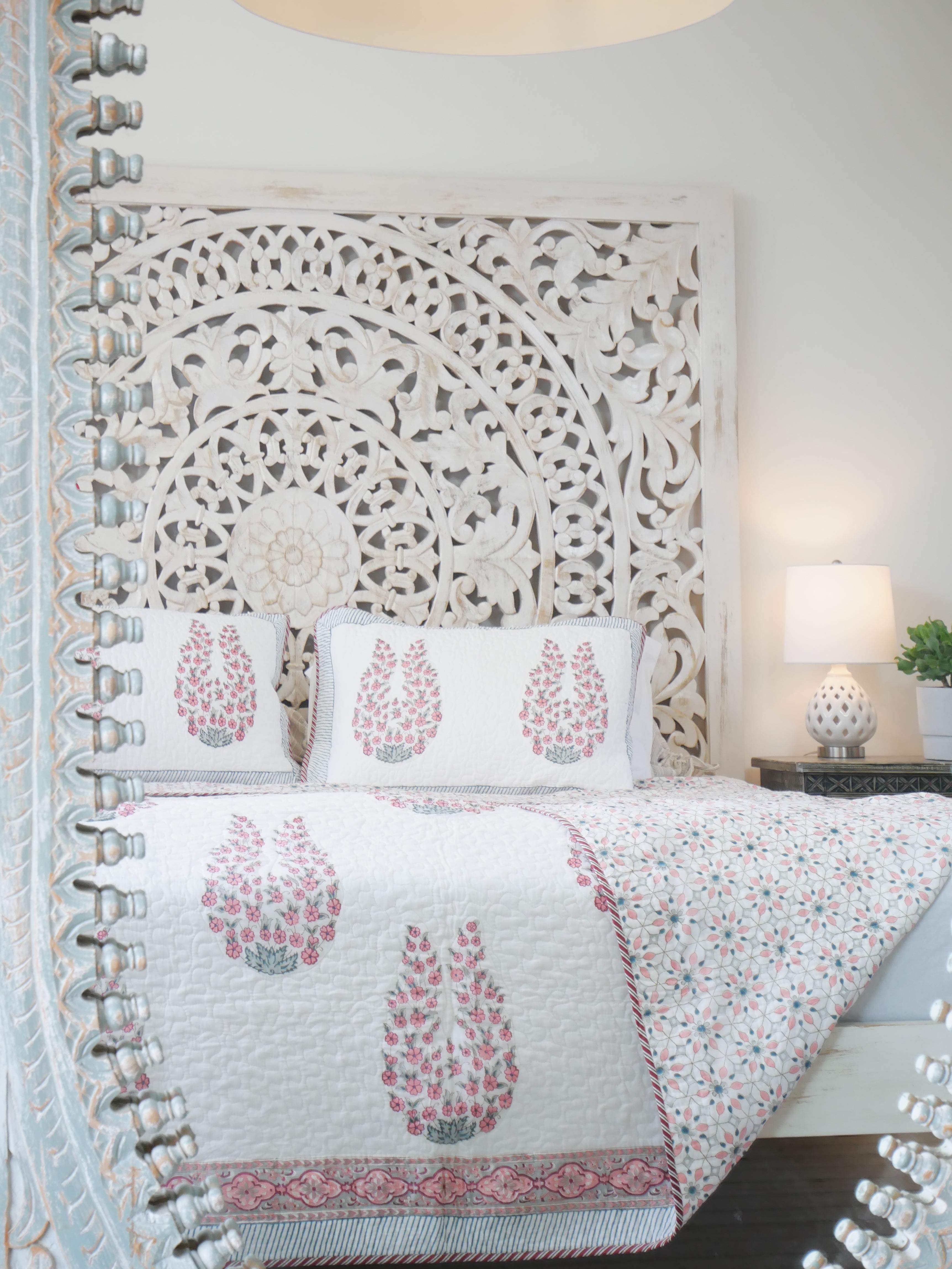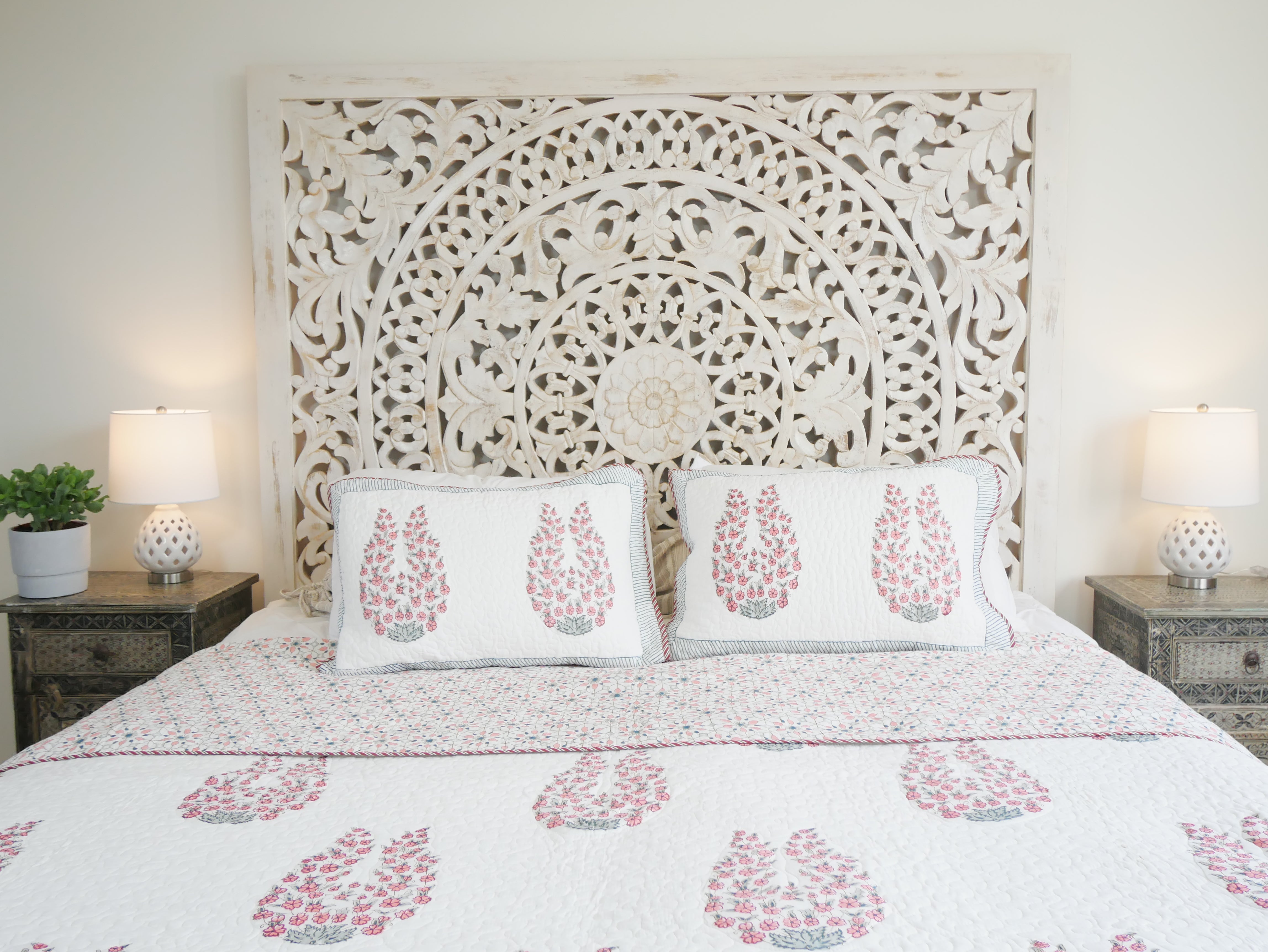 This beautiful handmade 220x250 cm block print bedspread is printed on both sides and can be twisted into two different pattern combinations. The bedspread comes with two 50x70 cm pillowcases.
