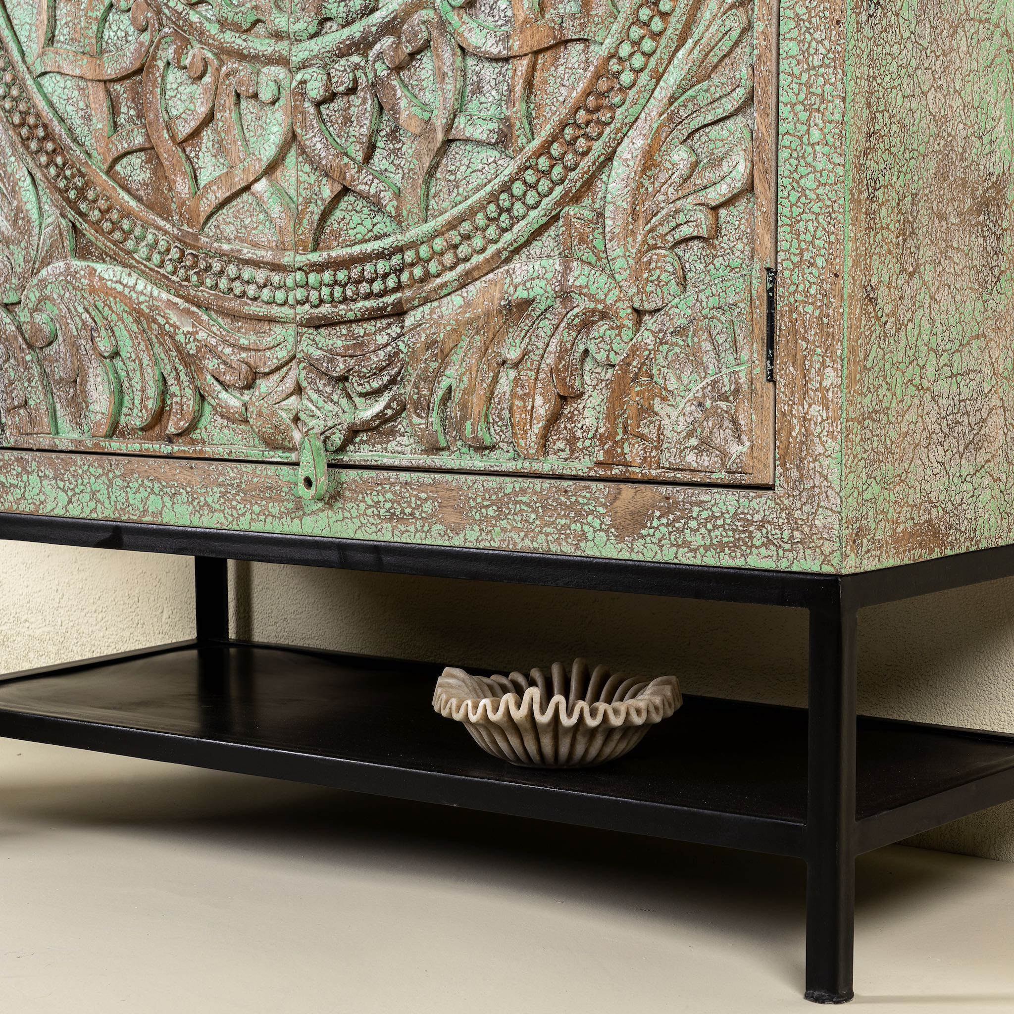 Design: Carved mango wood cabinet with intricate floral motifs and multi-layer distressed finish