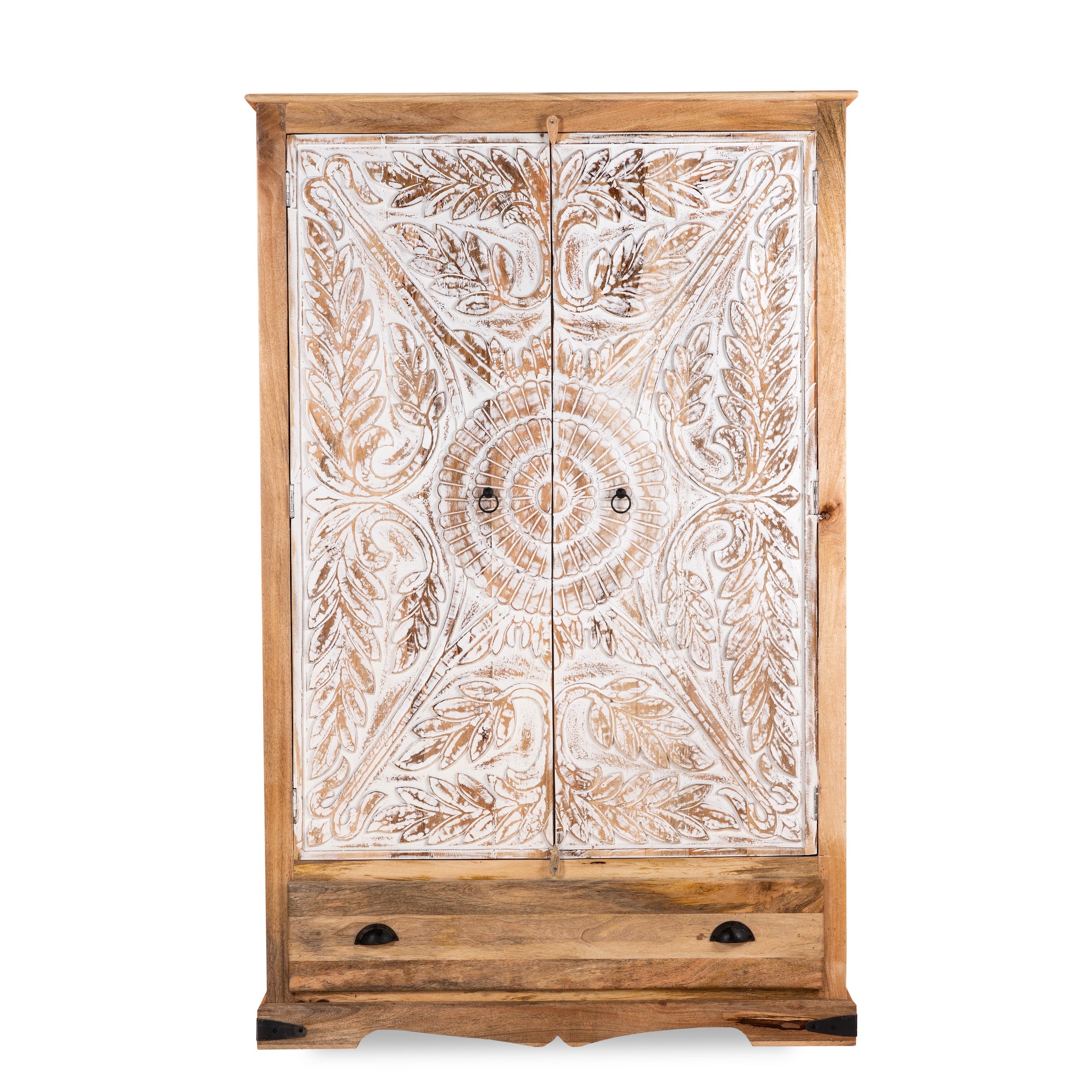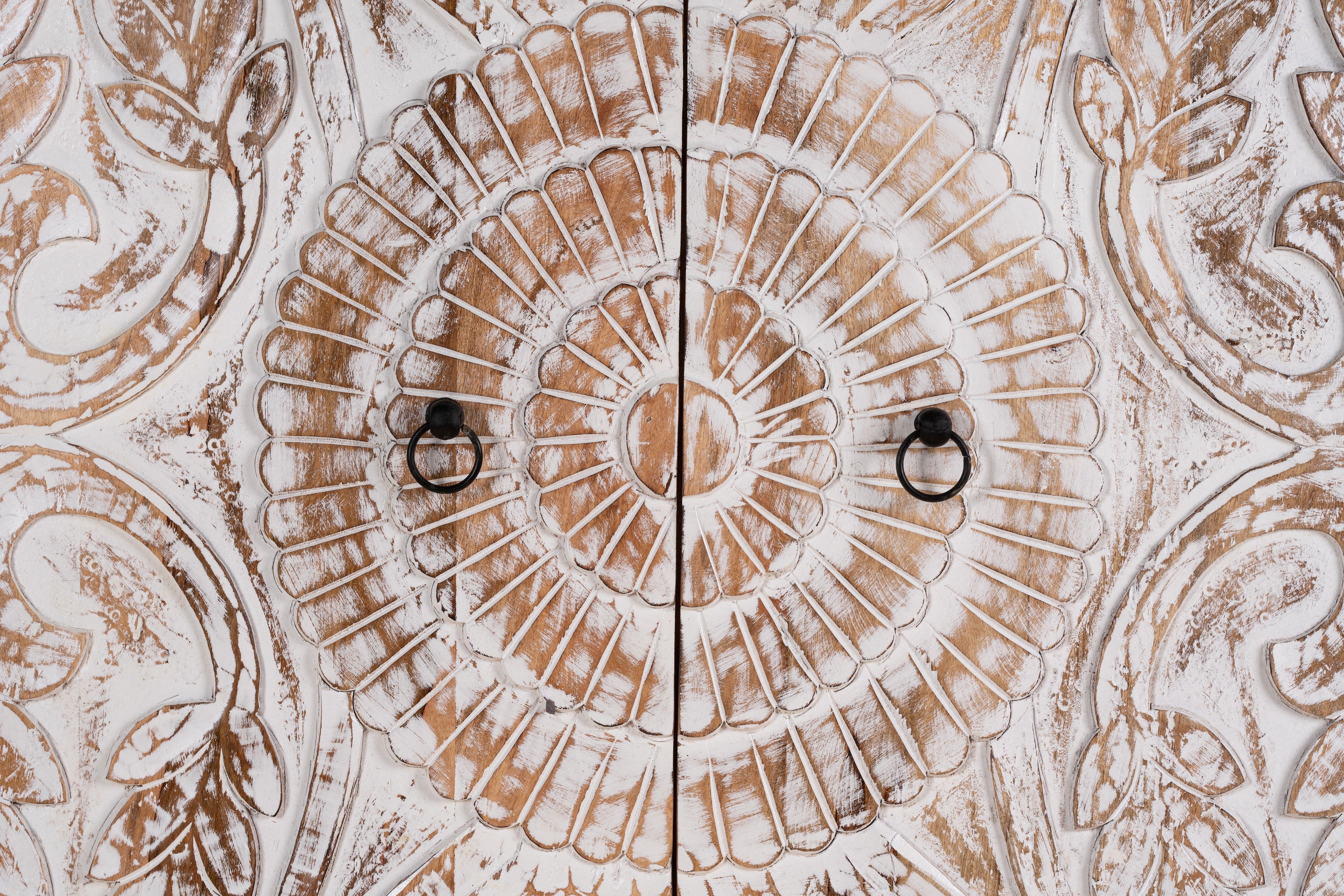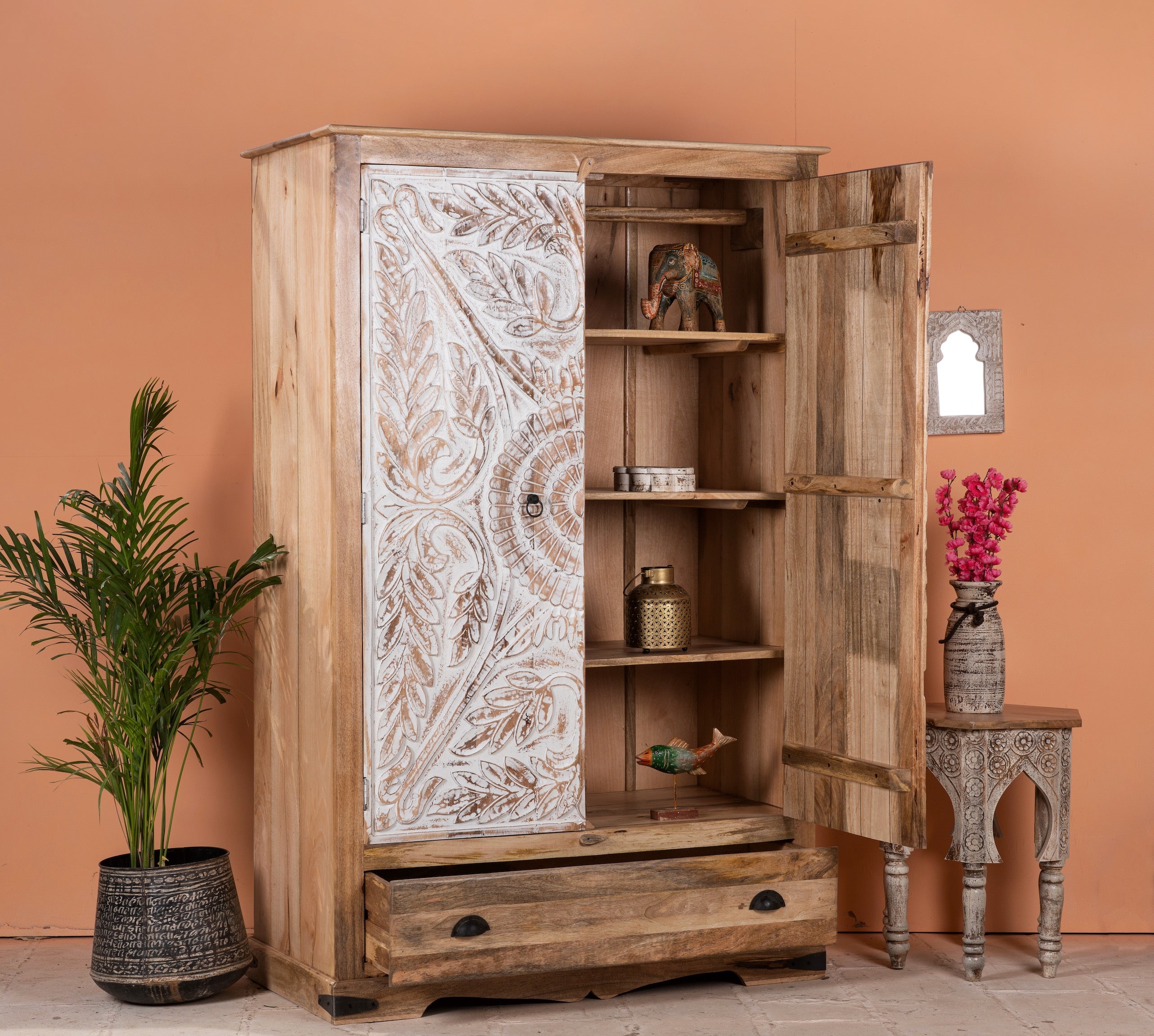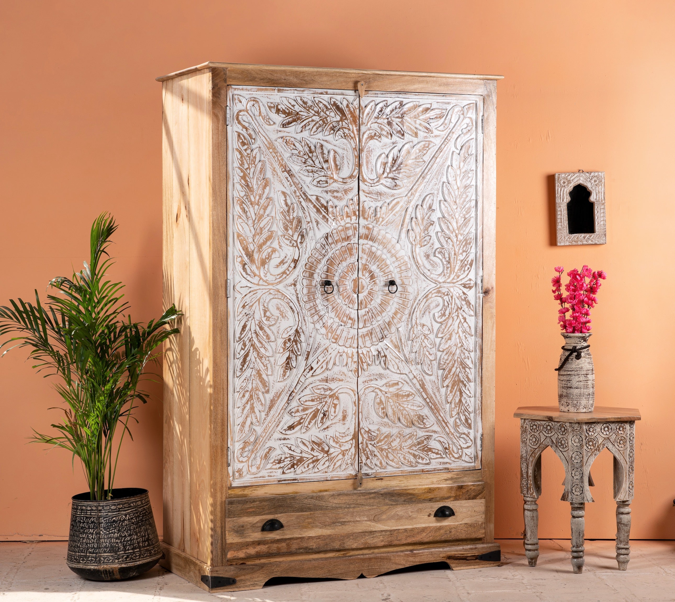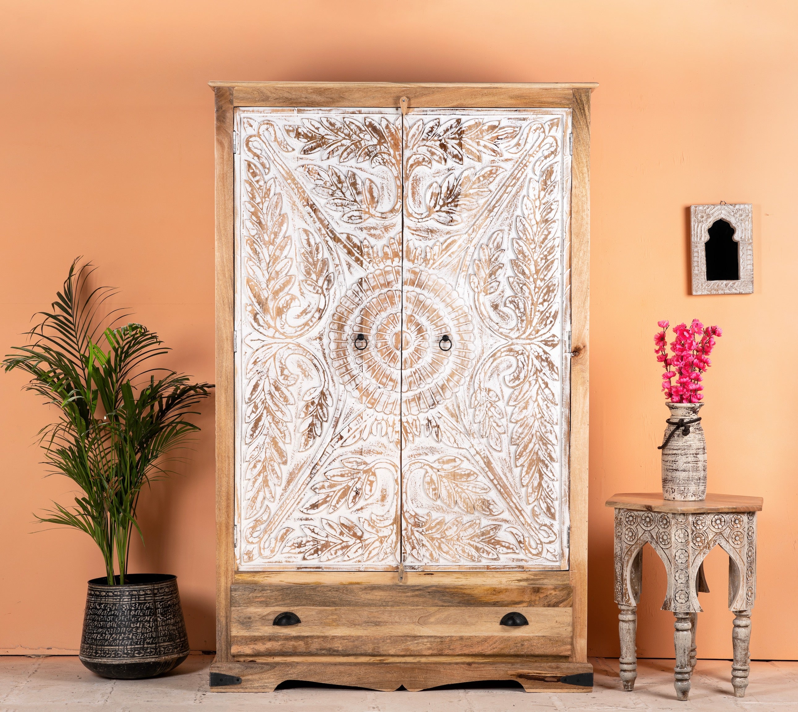 Experience the exquisite craftsmanship of the "Cheyyur" Indian handcrafted Wardrobe, a true masterpiece that effortlessly blends elegance and functionality. The grandeur of this piece is defined by its grand white washed doors adorned with intricate hand carved engravings, showcasing the skill and artistry of Indian artisans.