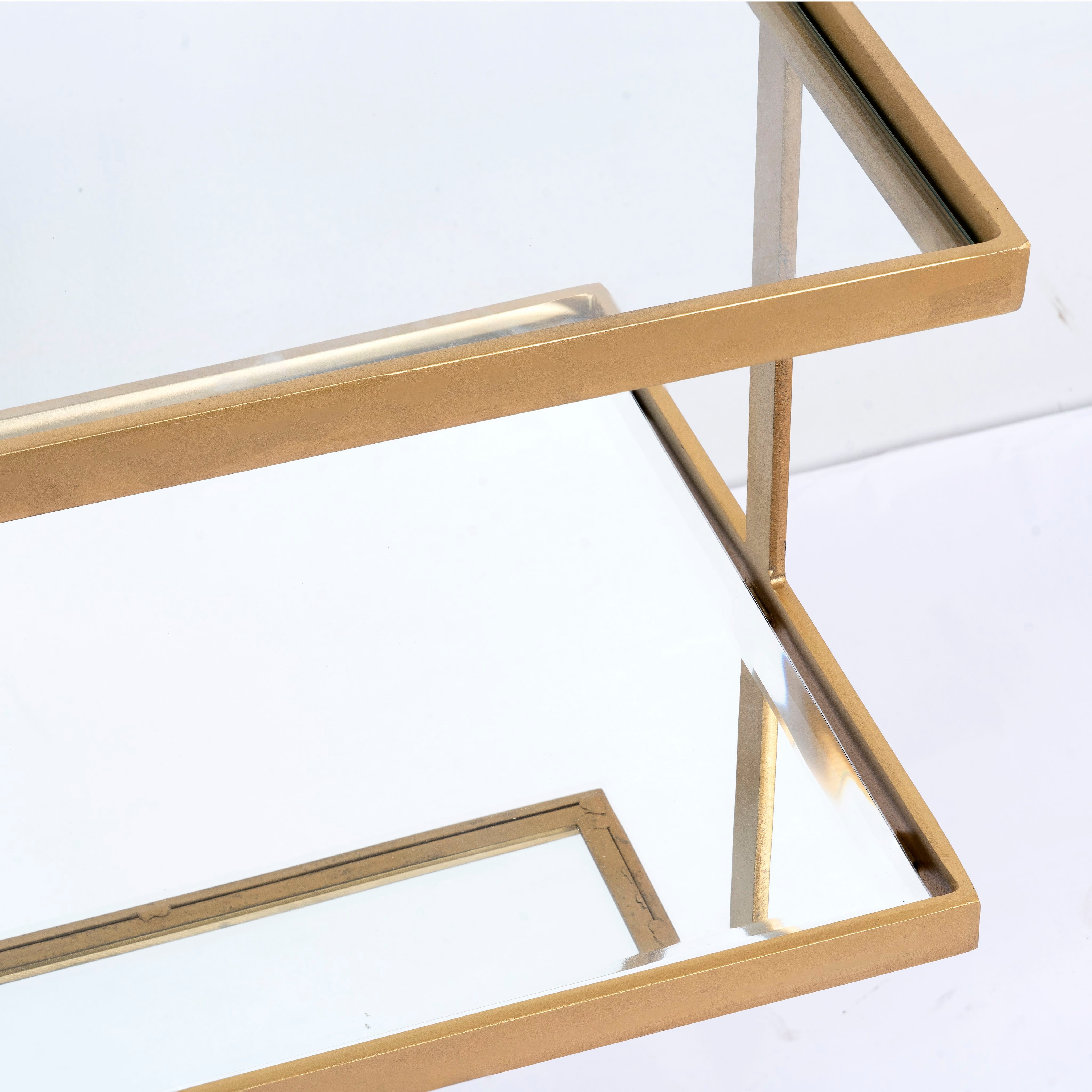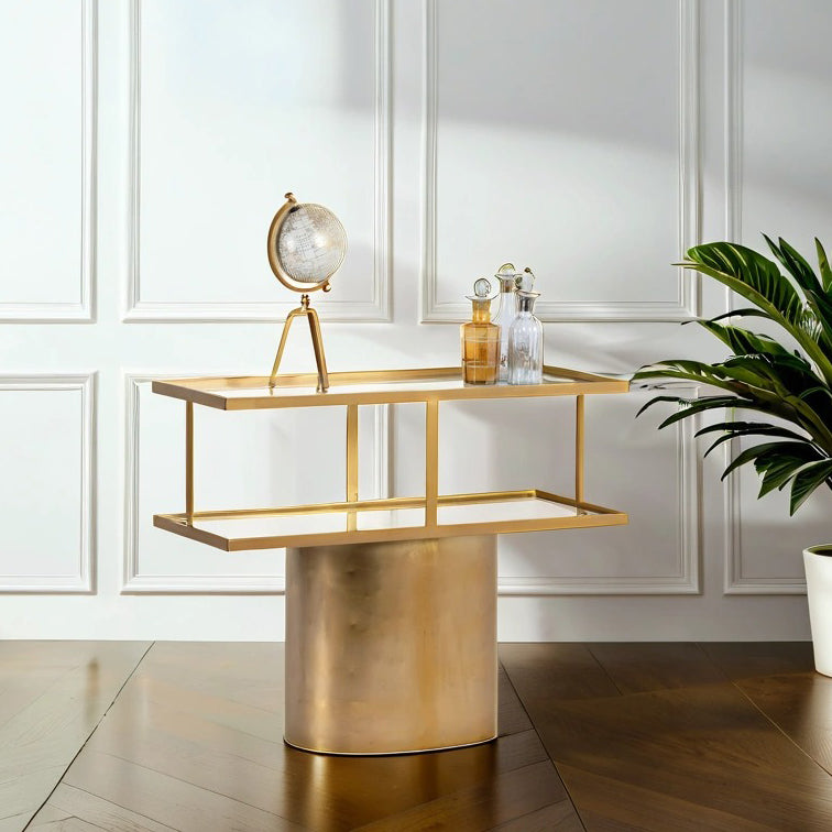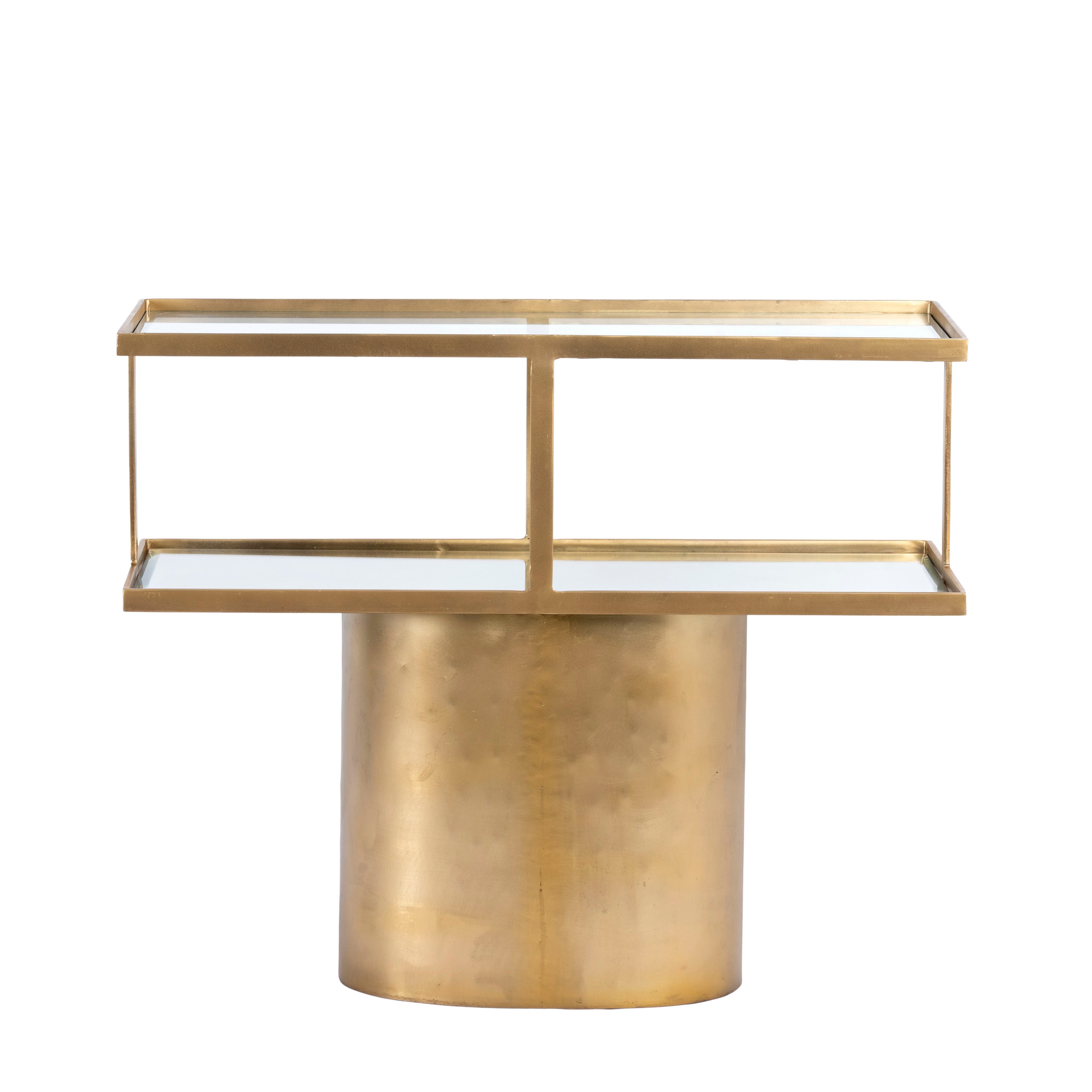 This side/ bar table in antique brass is a real eye-catcher and fits harmoniously into any interior. Whether in the living room, dining room or bar, it gives every room a luxurious and cozy atmosphere.