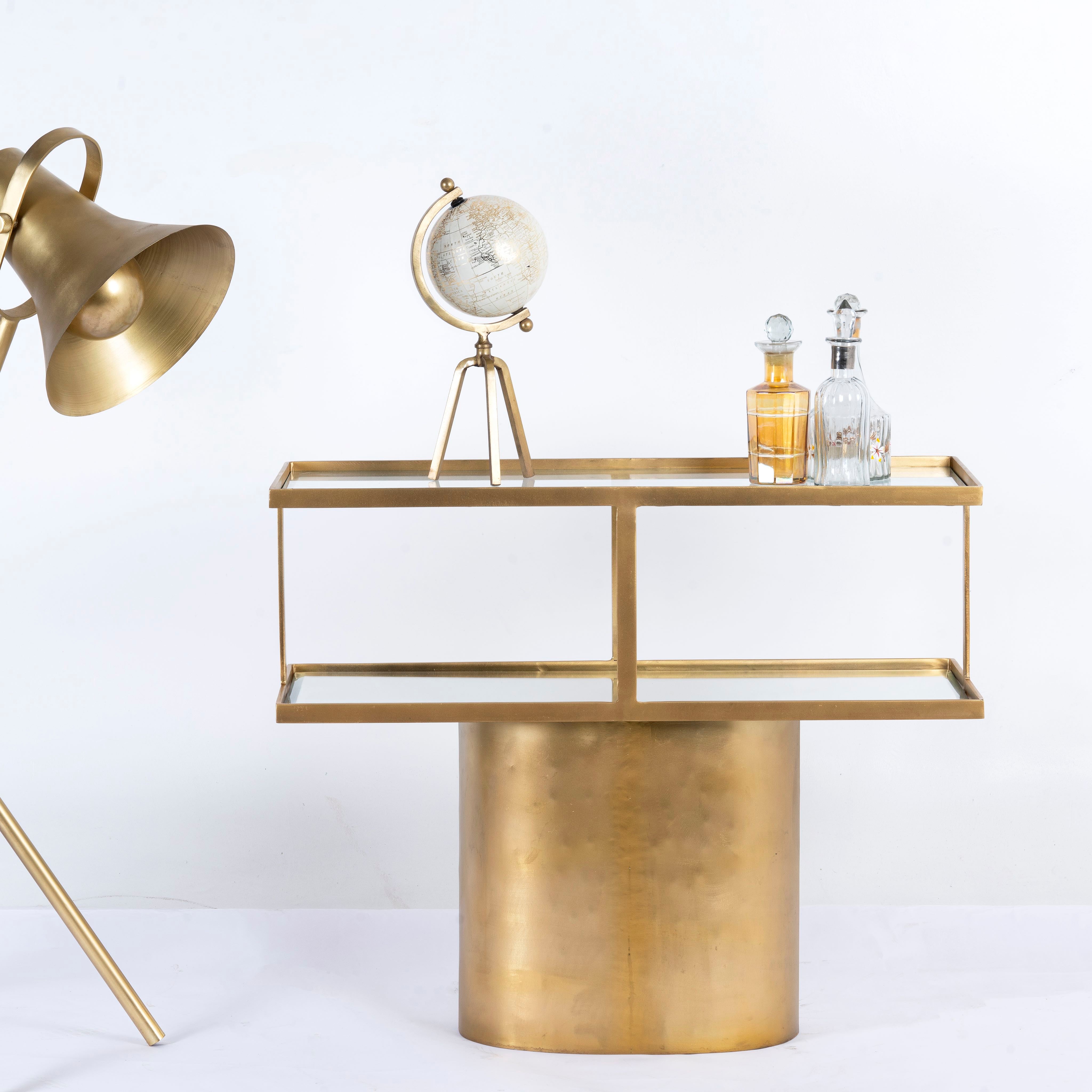 Discover the elegance and versatility of our side table/ bar table Brahmi made of antique brass-plated metal. This beautiful console is a true masterpiece, which gives every room a special look with its refined details and high-quality materials.