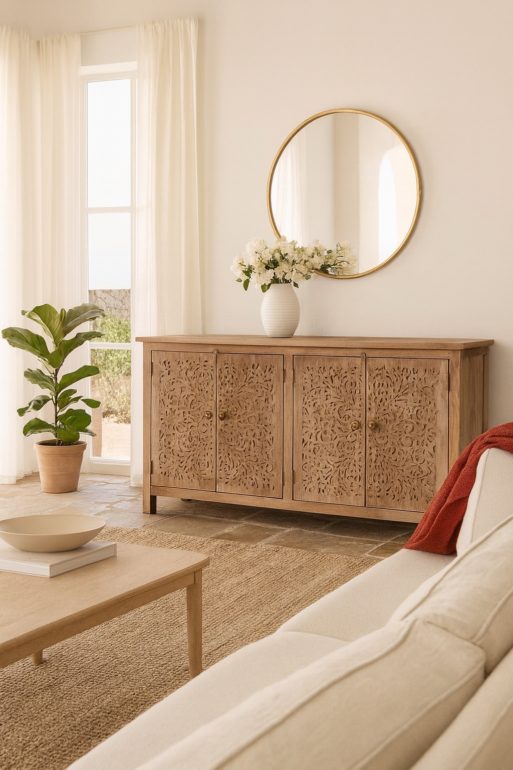 Bring warmth, texture, and refined simplicity into your home with this beautifully crafted acacia wood sideboard, a standout piece of acacia wood furniture that balances artisanal design with everyday functionality. Made from solid acacia wood, this sideboard highlights the natural grain and rich tonal depth of the material, while delicate hand-carved detailing adds subtle texture and charm.