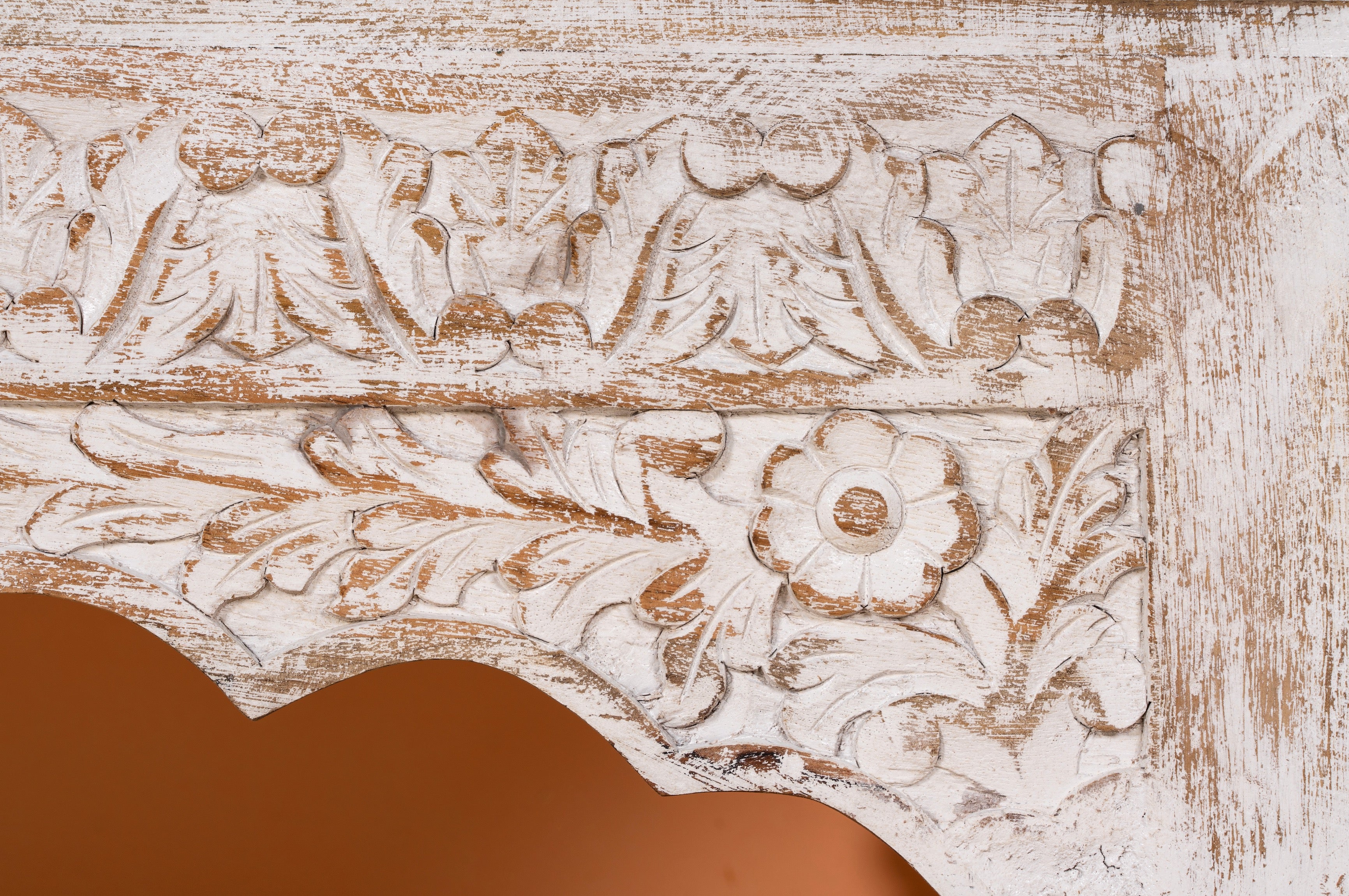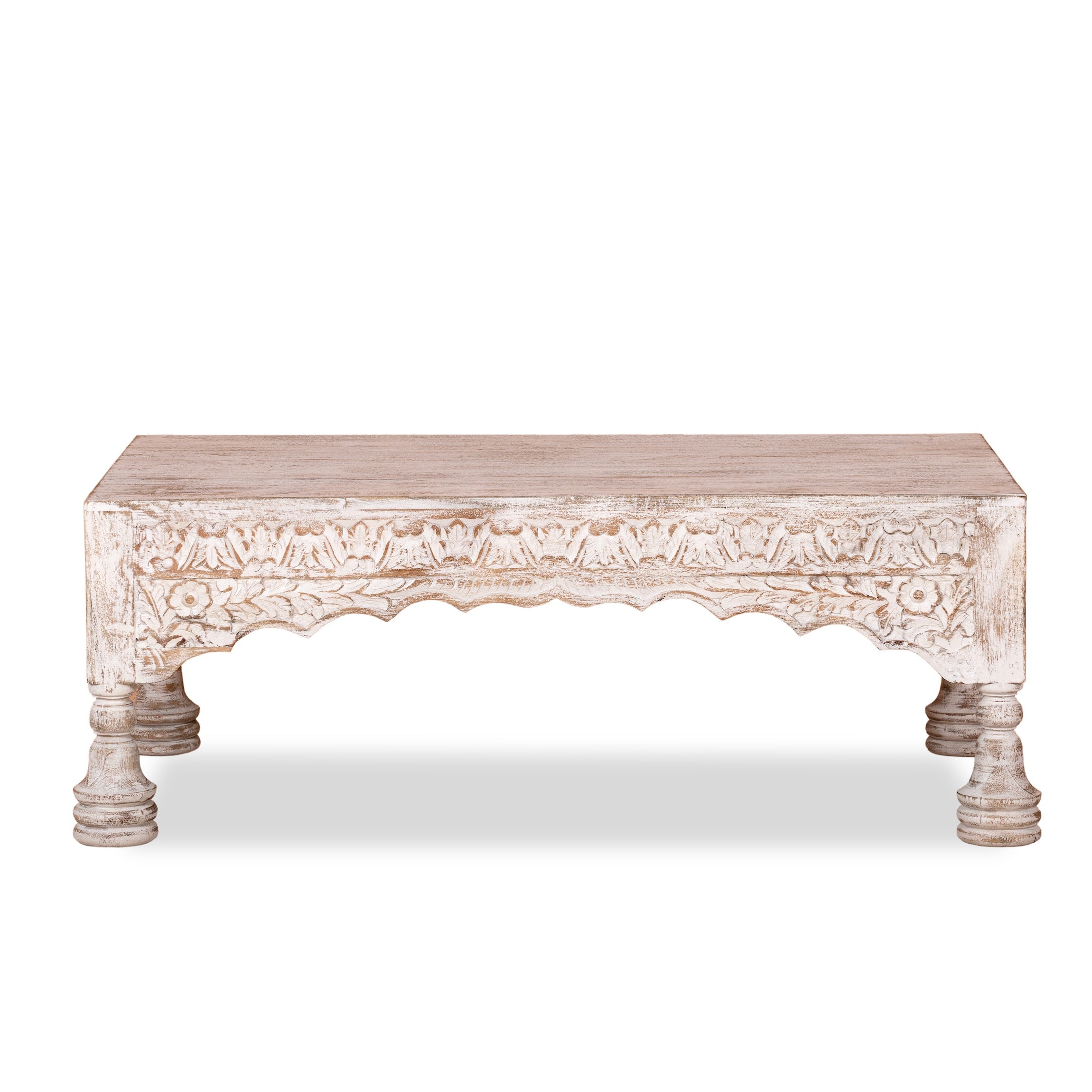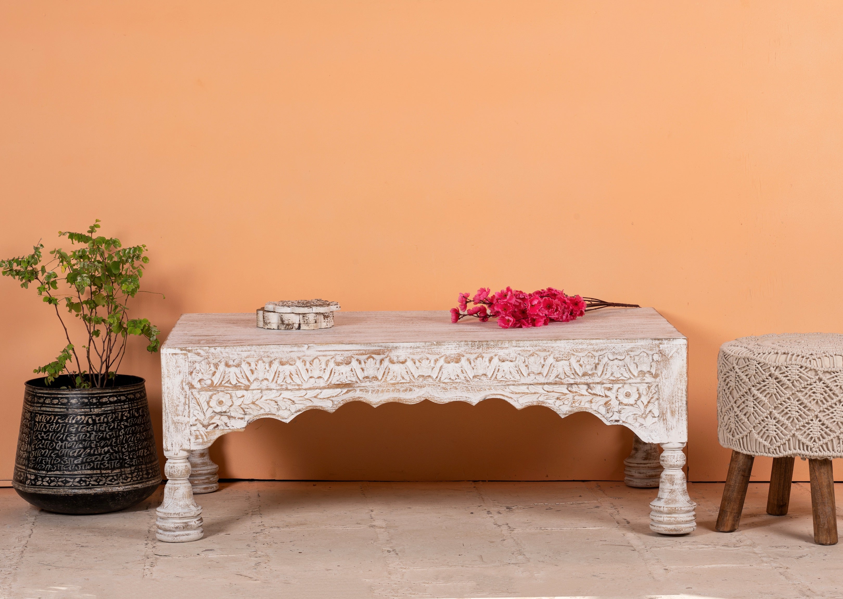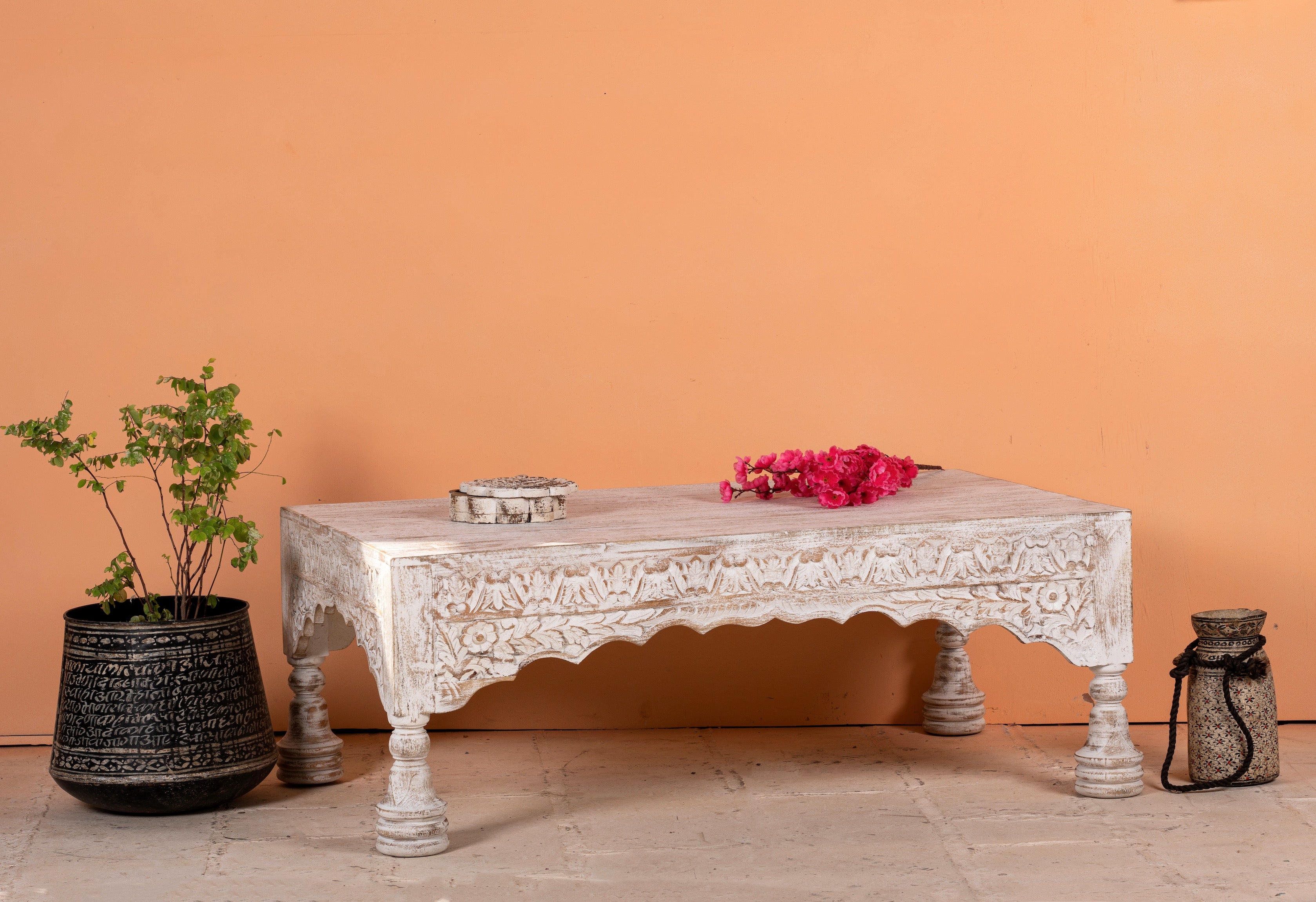 The entire table frame of coffee table Dhola is intricately carved with floral patterns.
