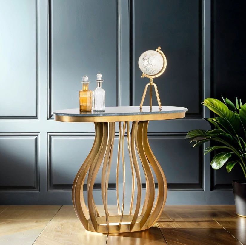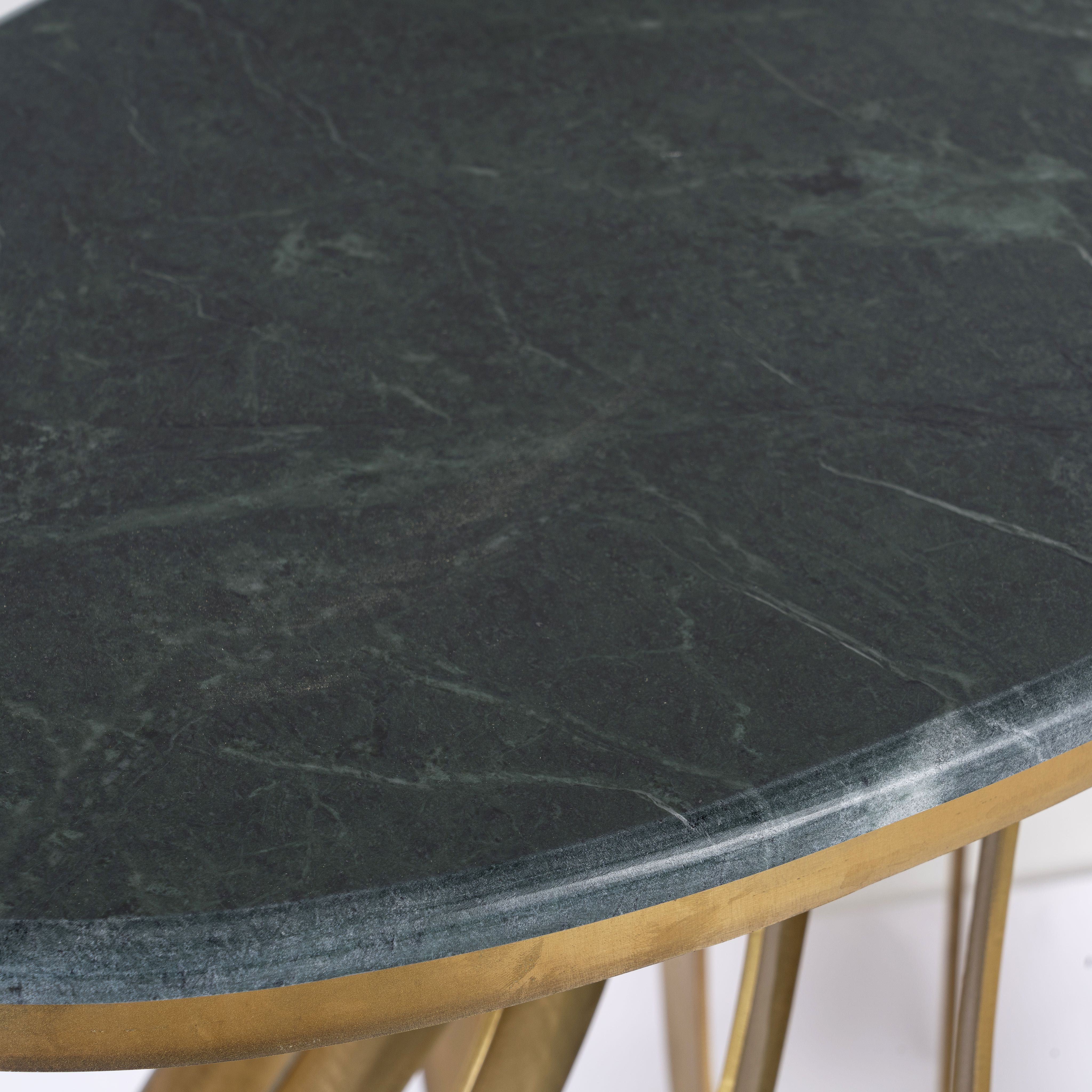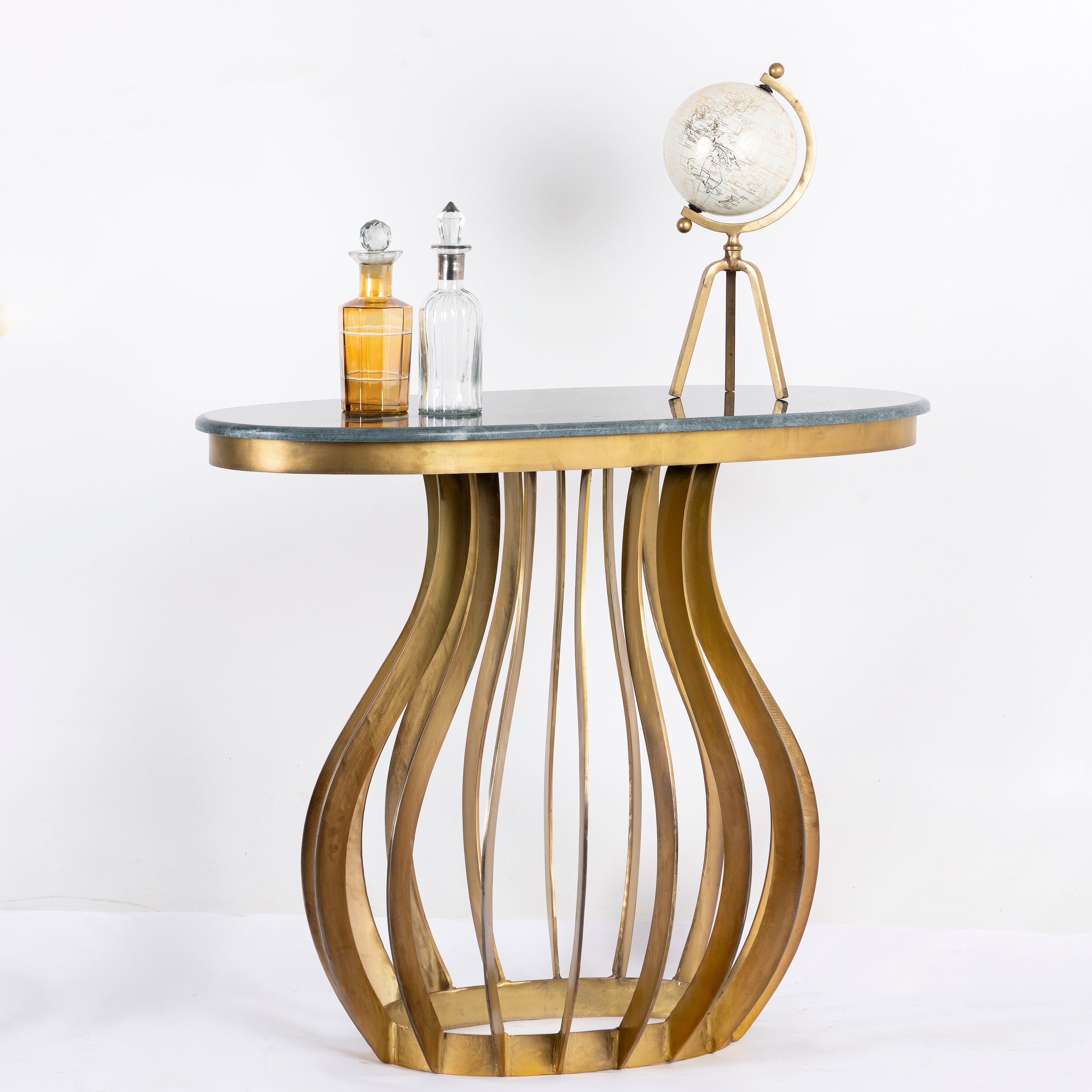 Crafted from wrought iron, the table features a striking striped design on its oval frame, which testifies to meticulous craftsmanship and durability. The green marble top adds a touch of luxury and sophistication, with its natural veining and smooth surface providing the perfect backdrop for drinks, books or decorative items.