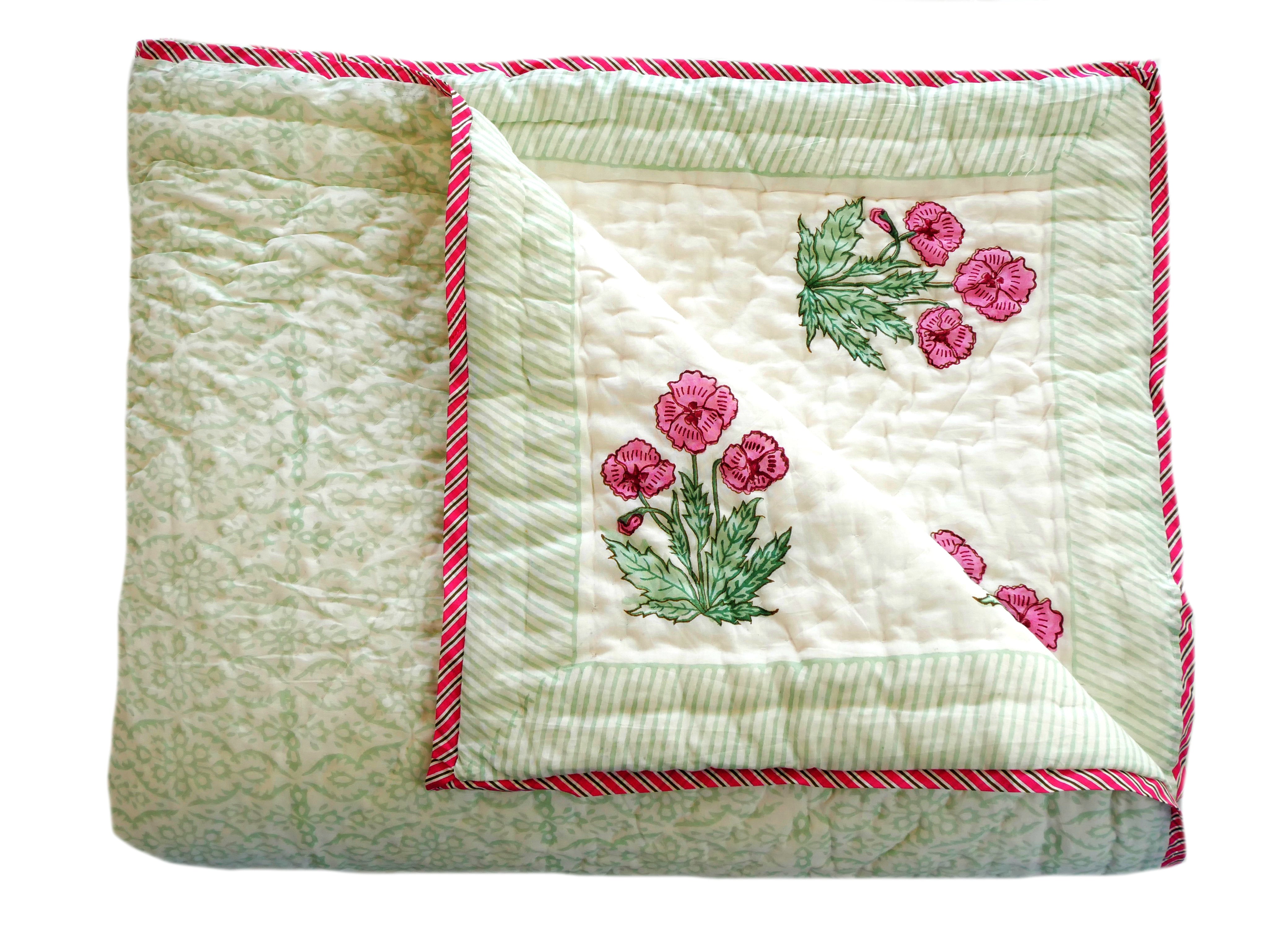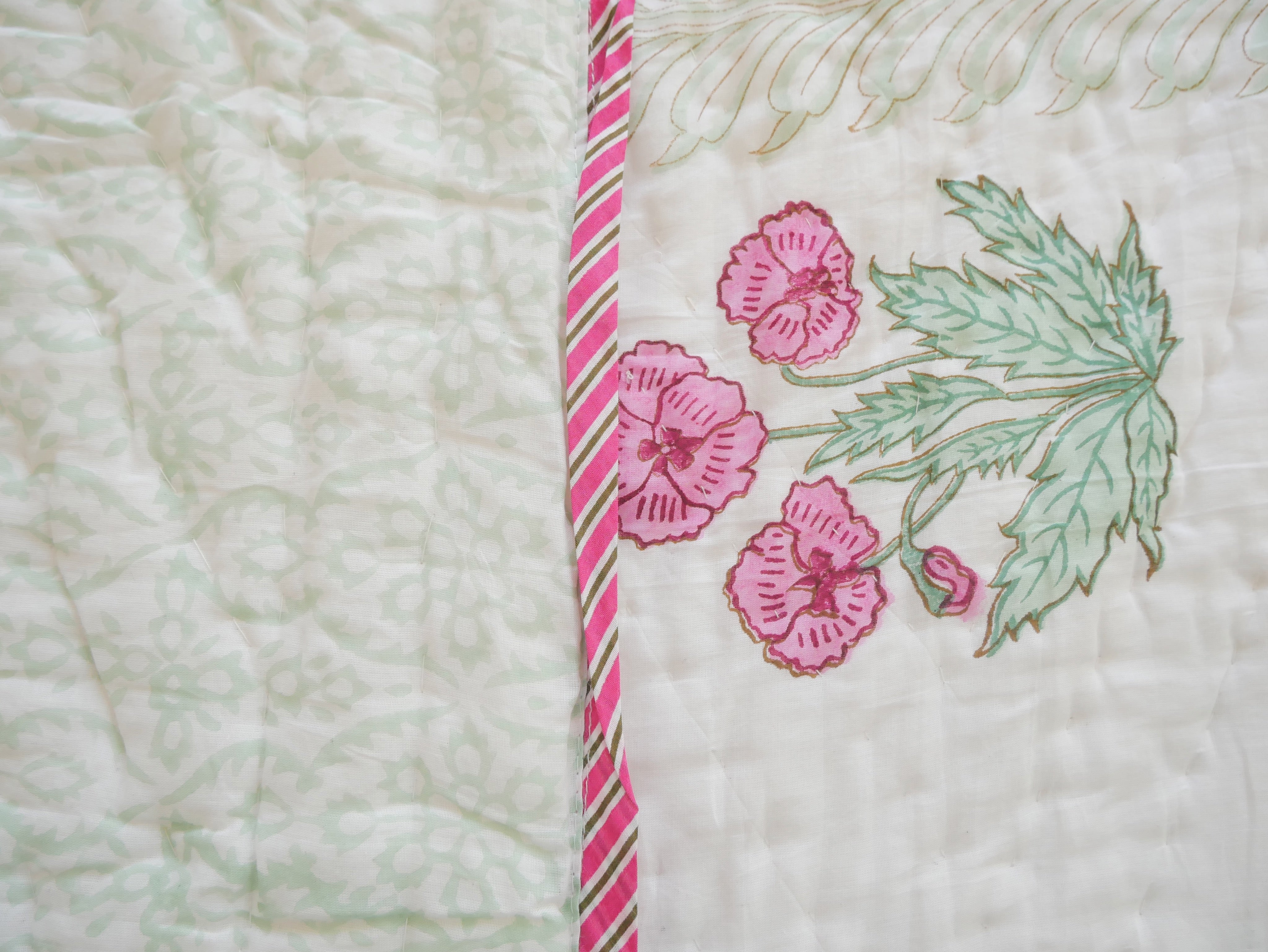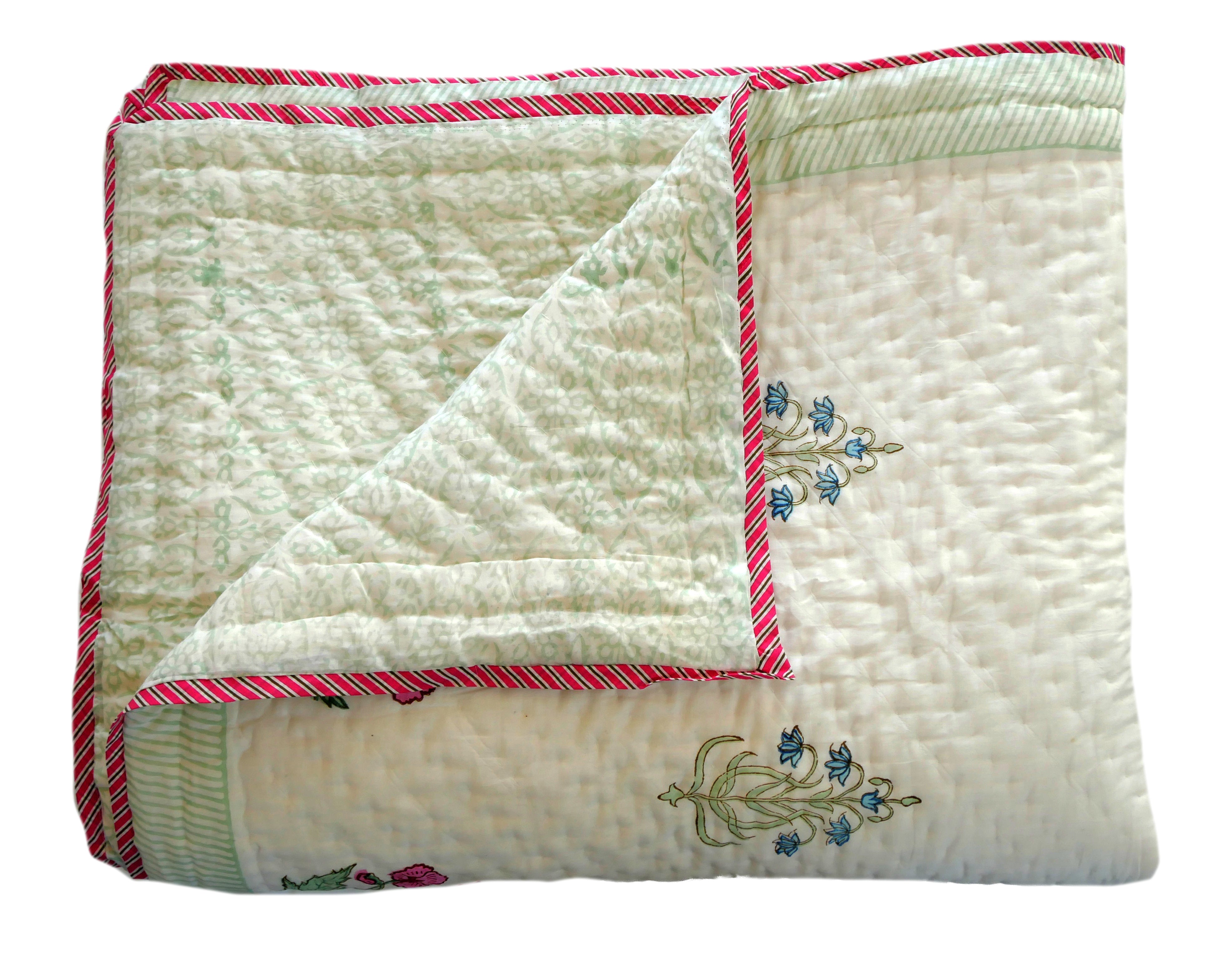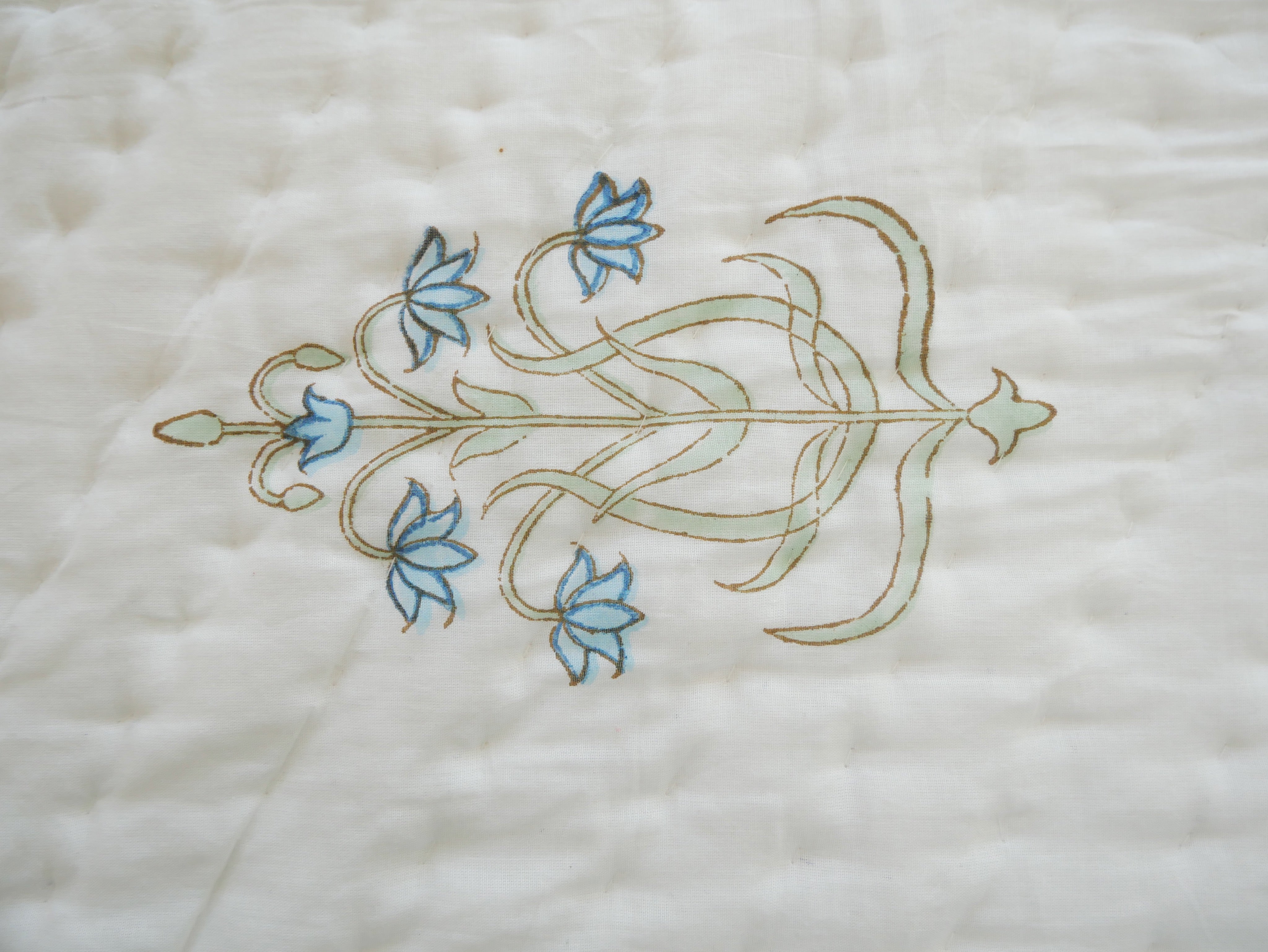 The quilt is elaborately hand printed on both sides in various patterns in typical designs from Rajasthan and can therefore be rotated as shown in our photos.