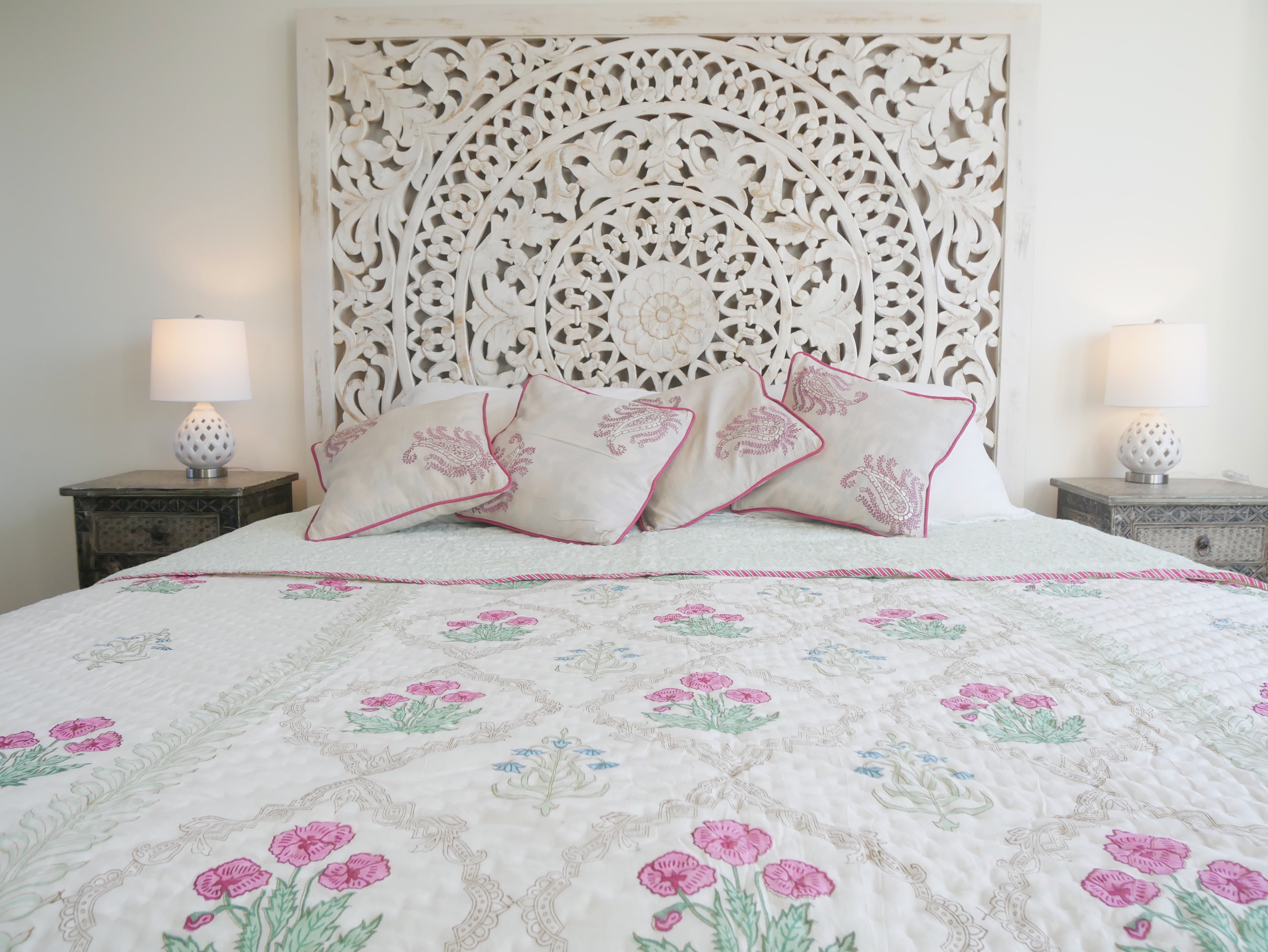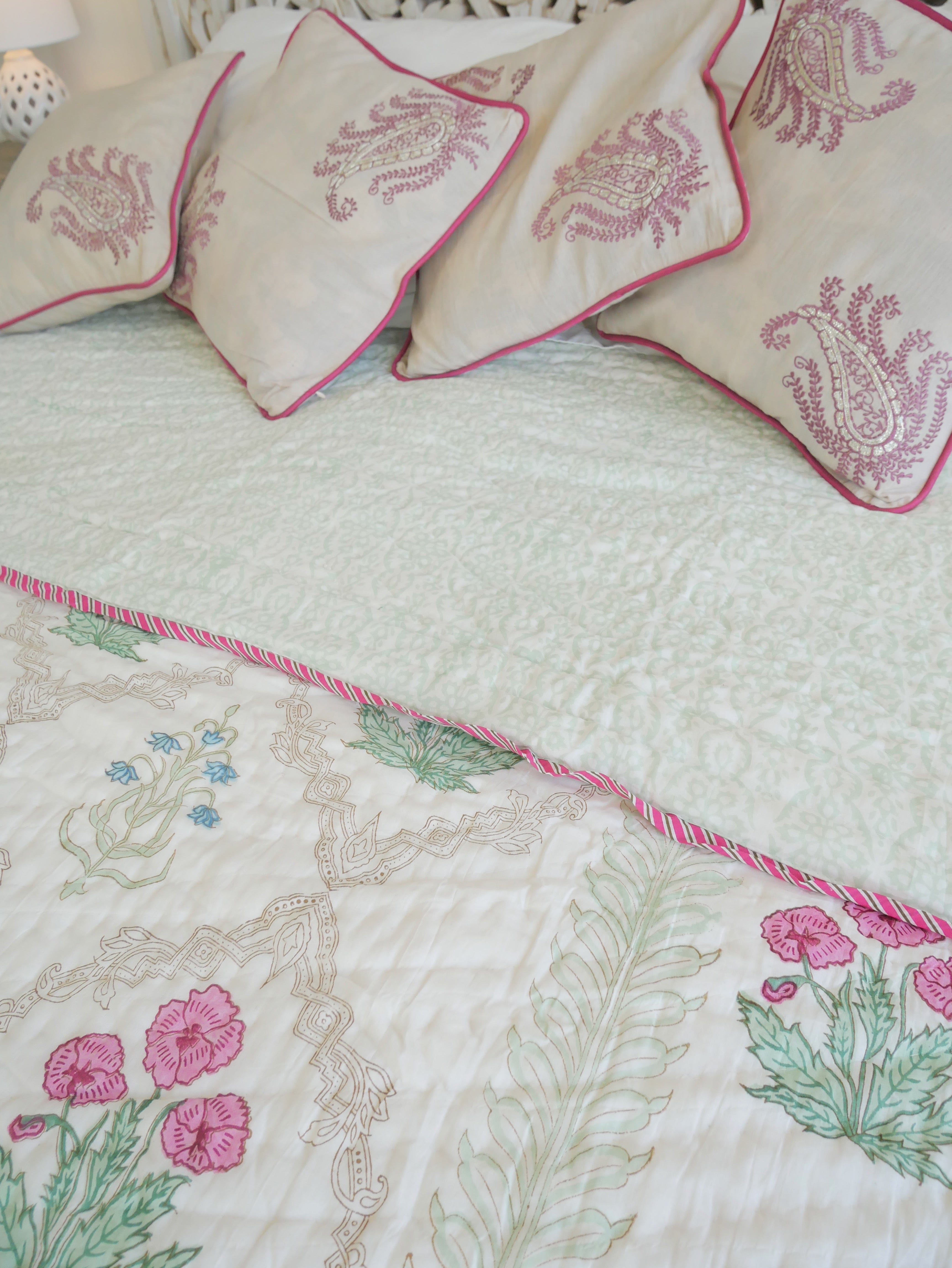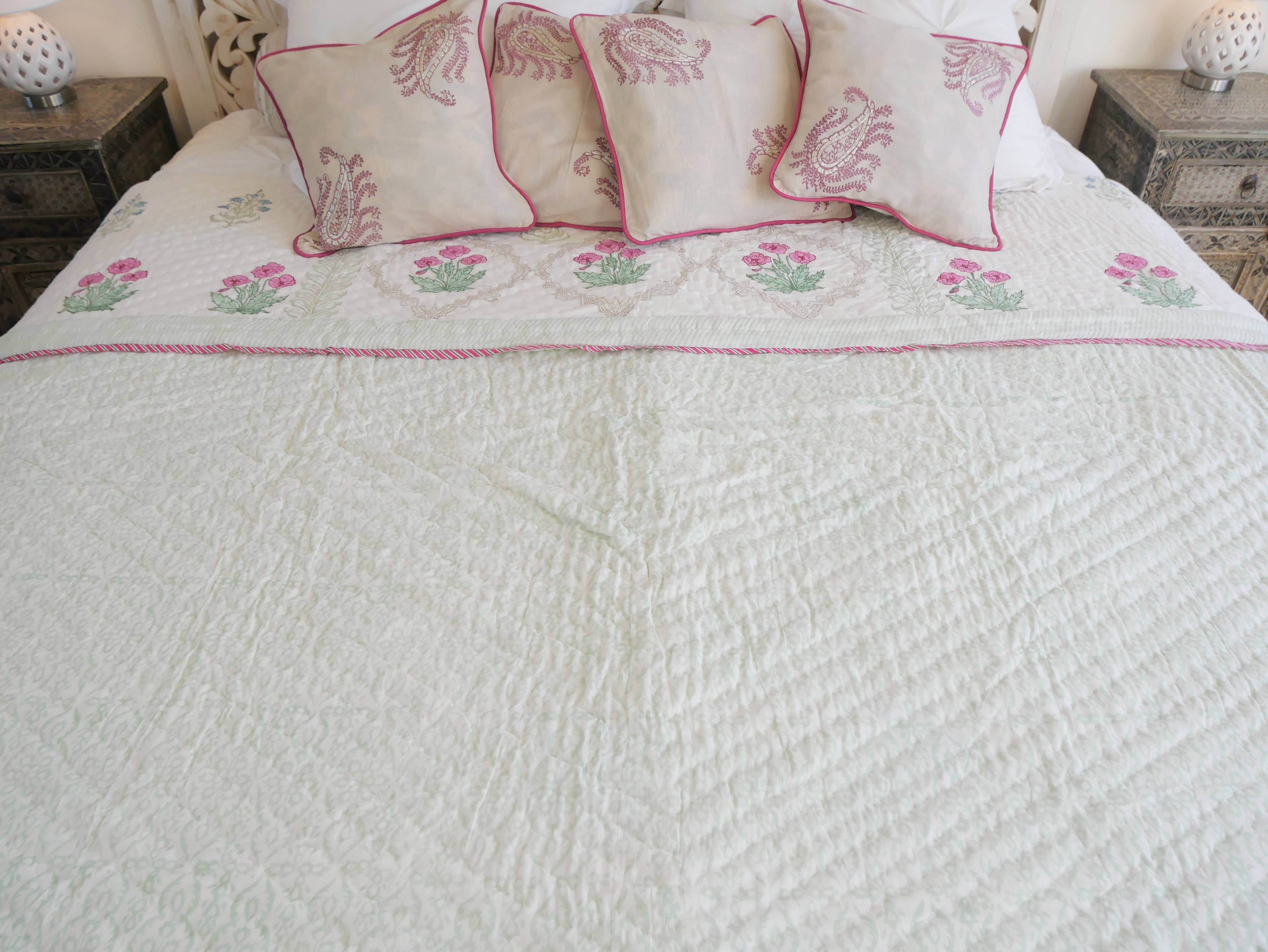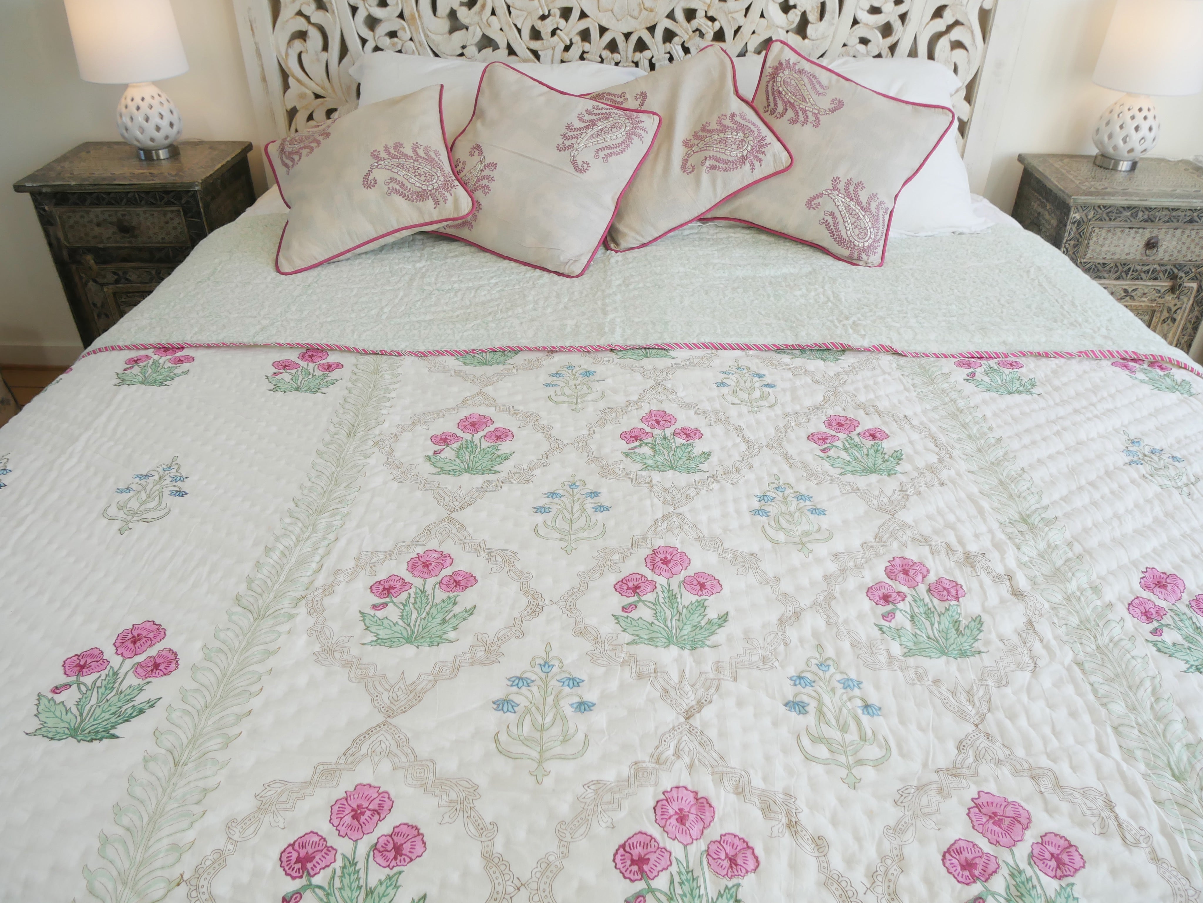 The quilt is elaborately hand printed on both sides in various patterns in typical designs from Rajasthan and can therefore be rotated as shown in our photos.
