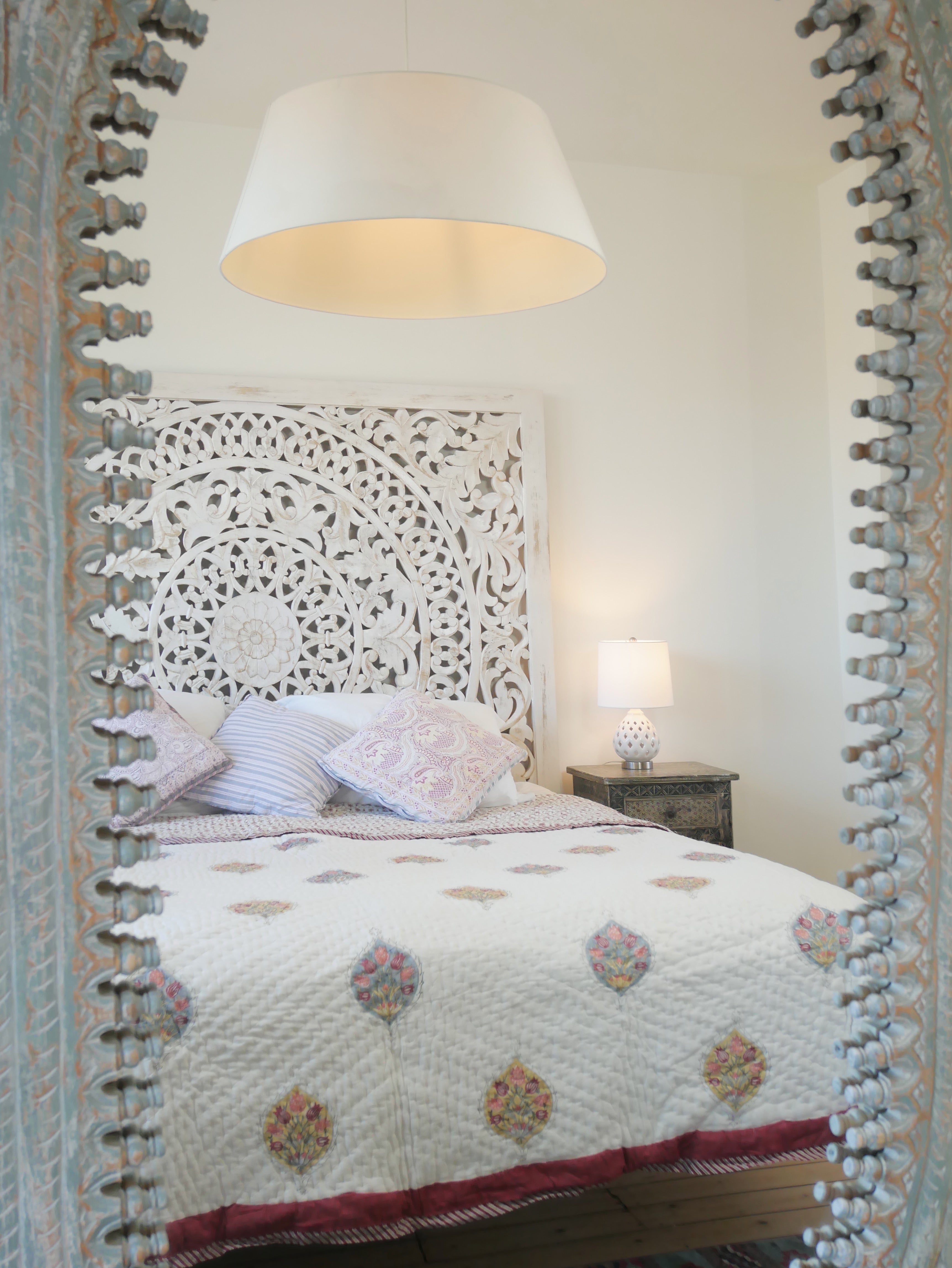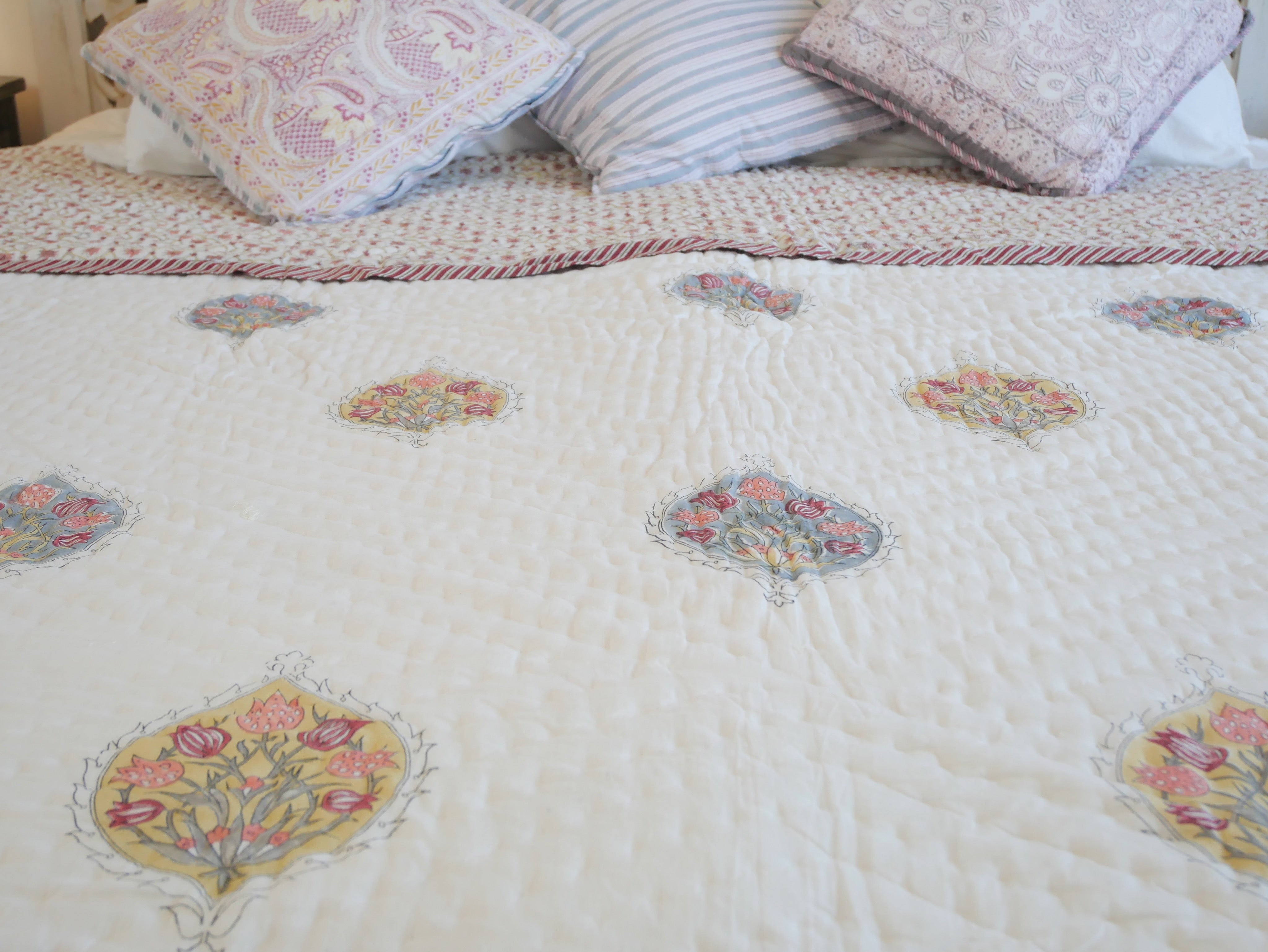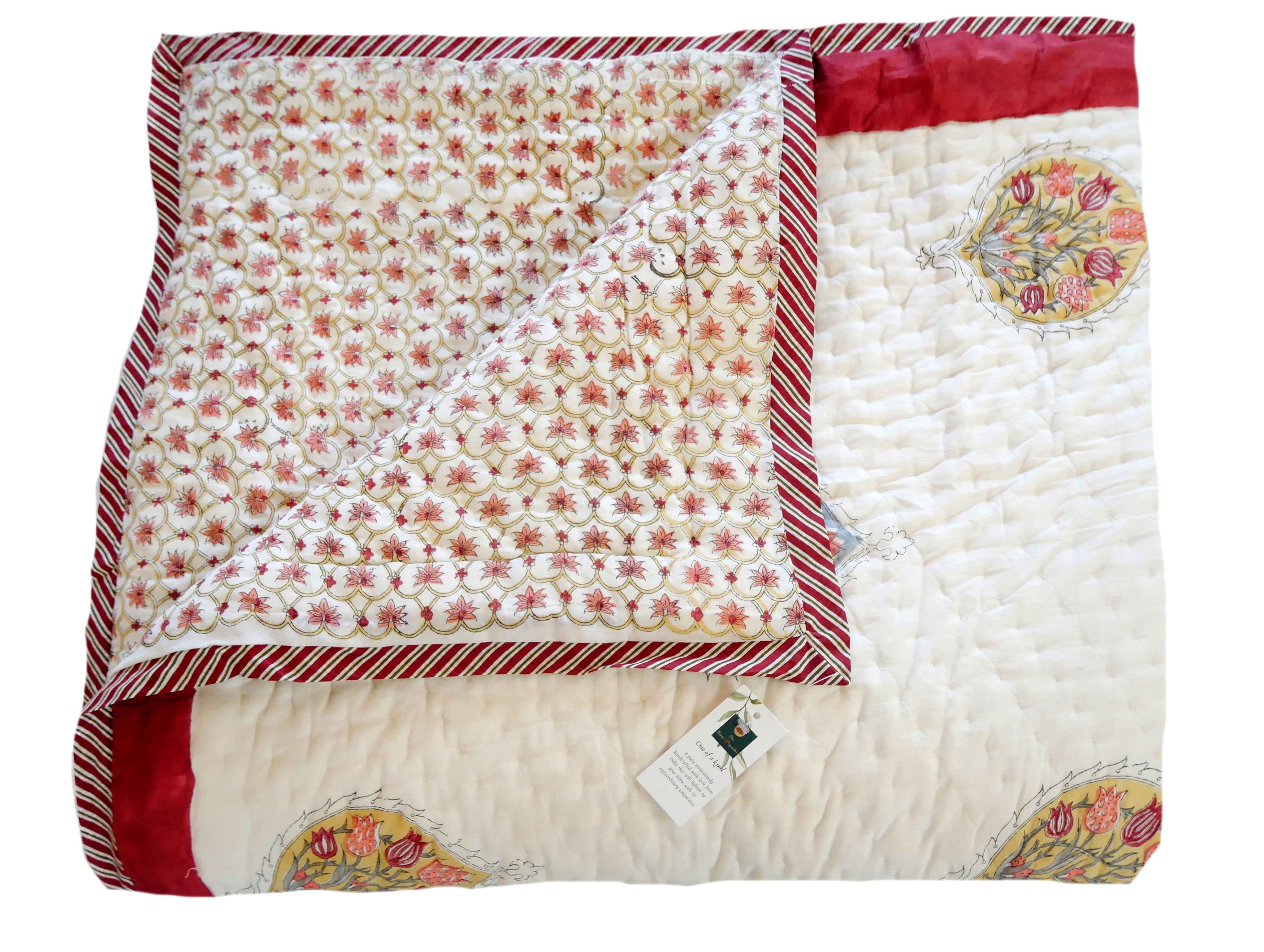 It is hand-block printed on both sides in different patterns in typical designs from Rajasthan and can therefore be turned, as shown in our photos.