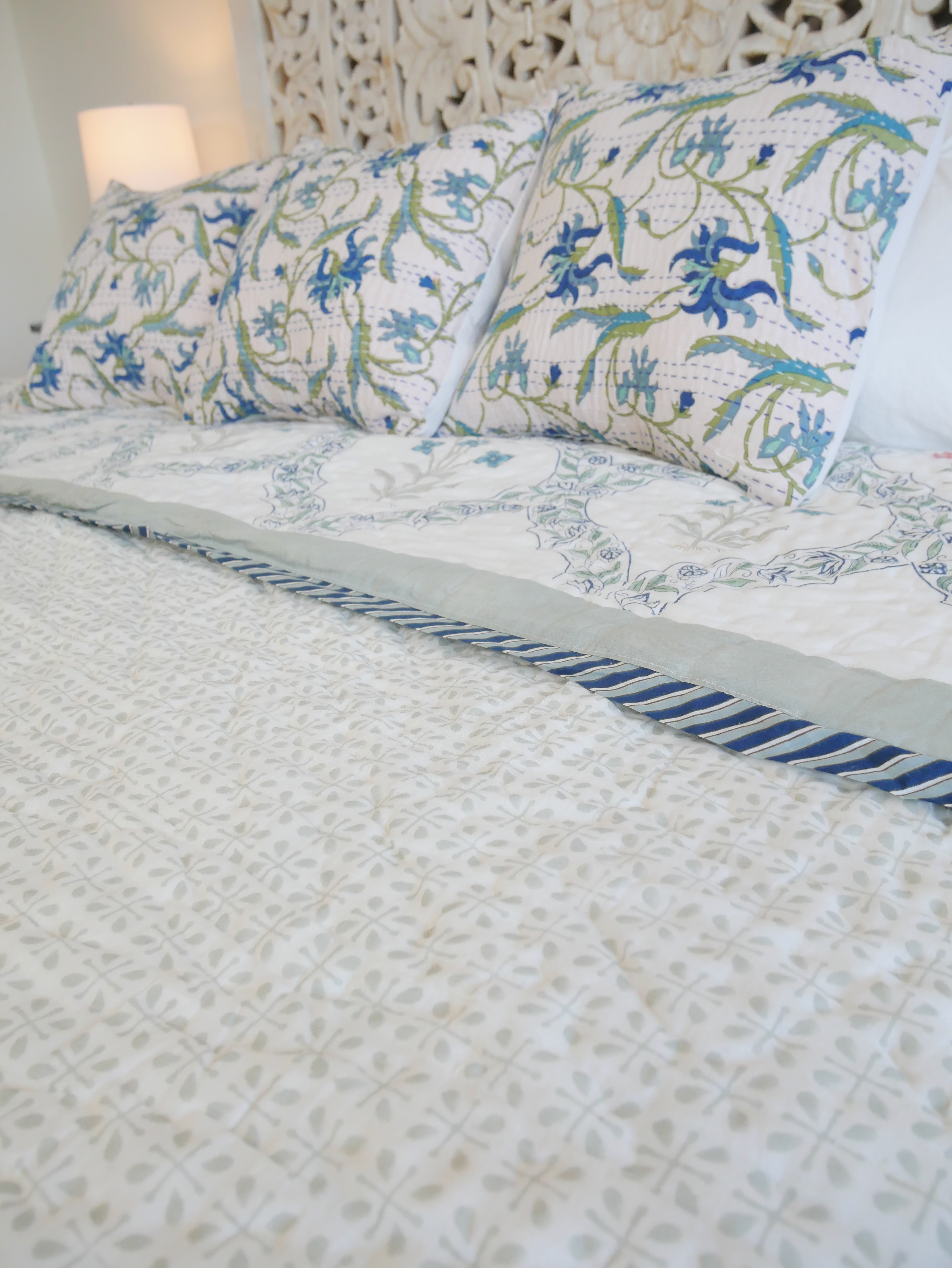 The quilt is elaborately hand printed on both sides in various patterns in typical designs from Rajasthan and can therefore be rotated as shown in our photos.