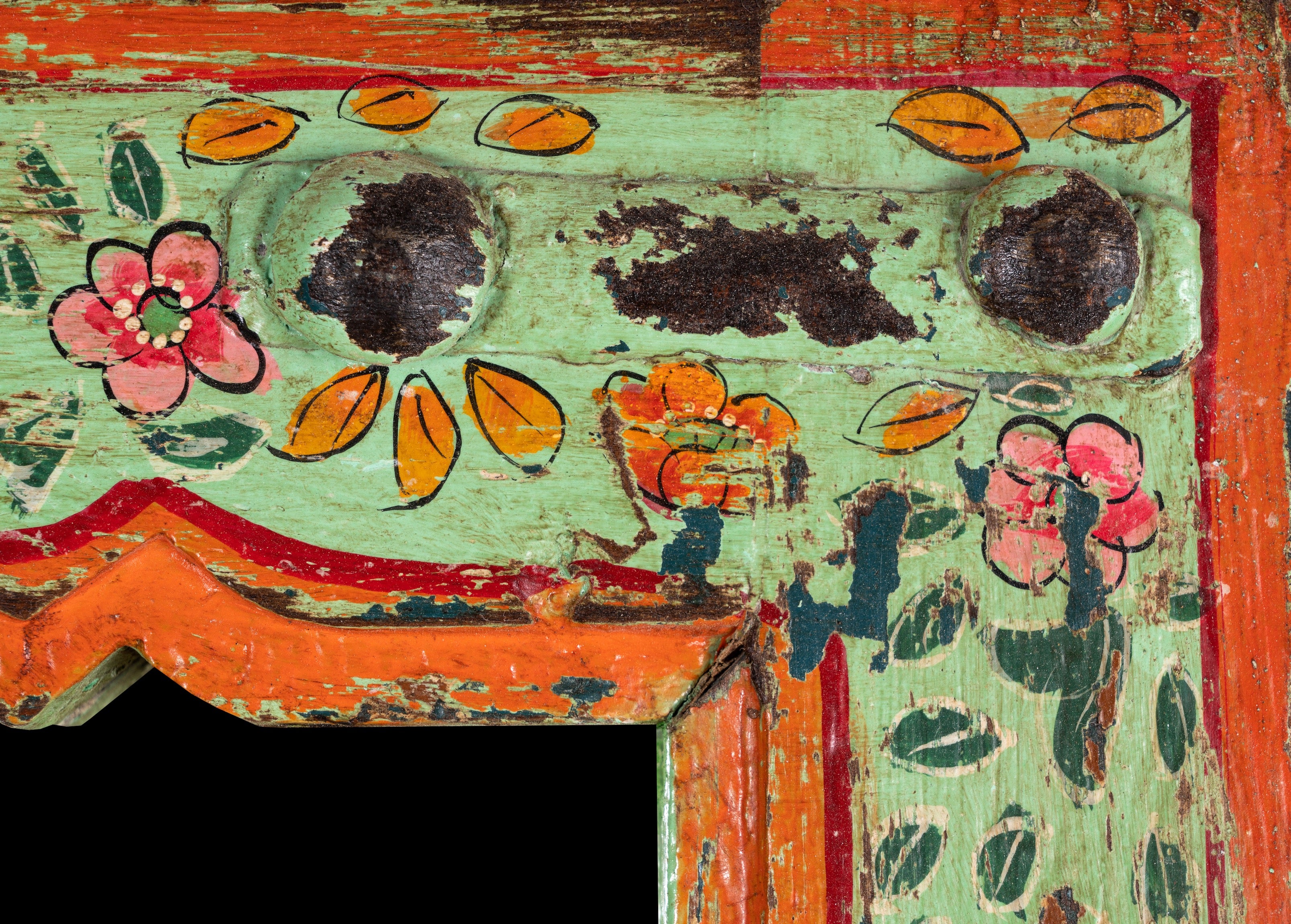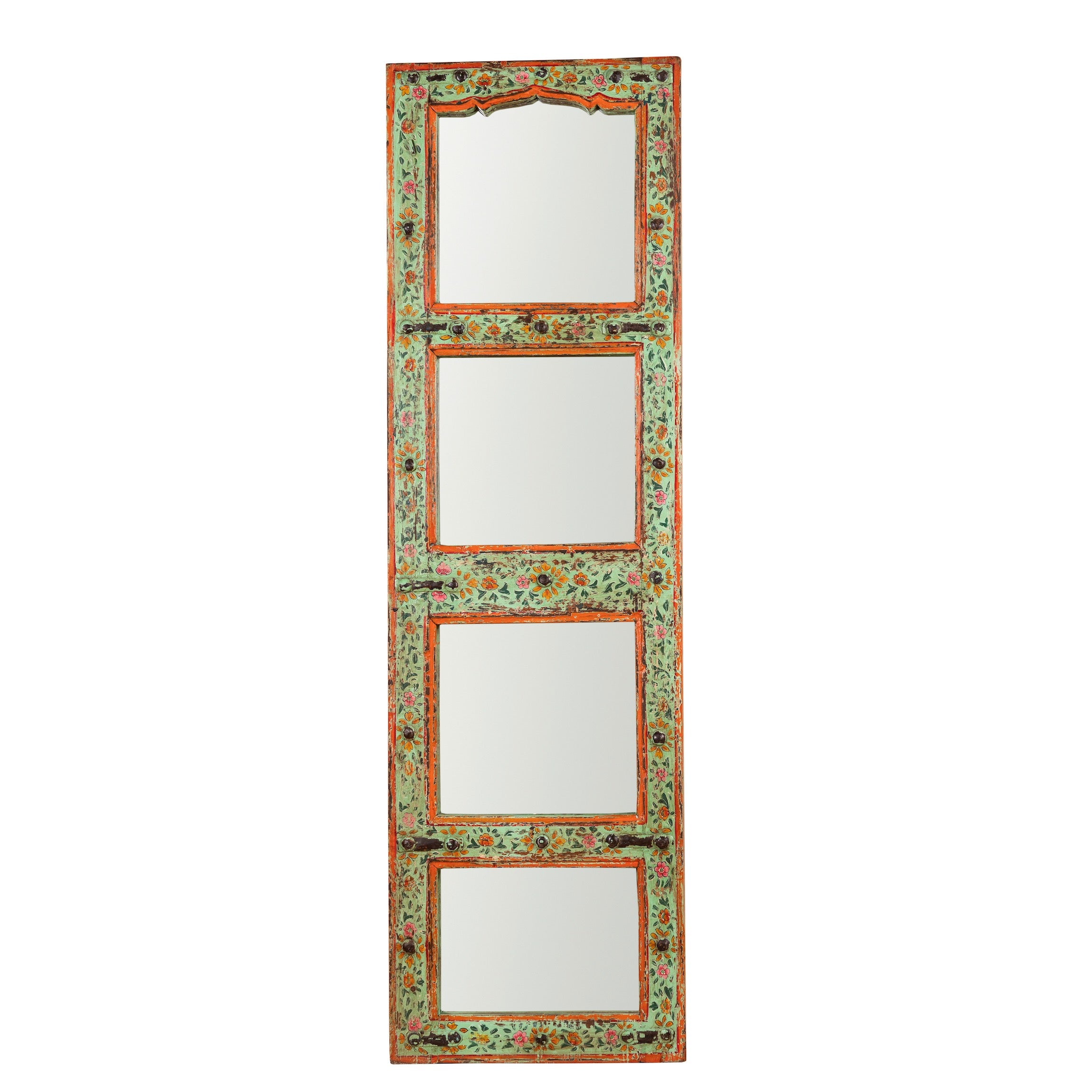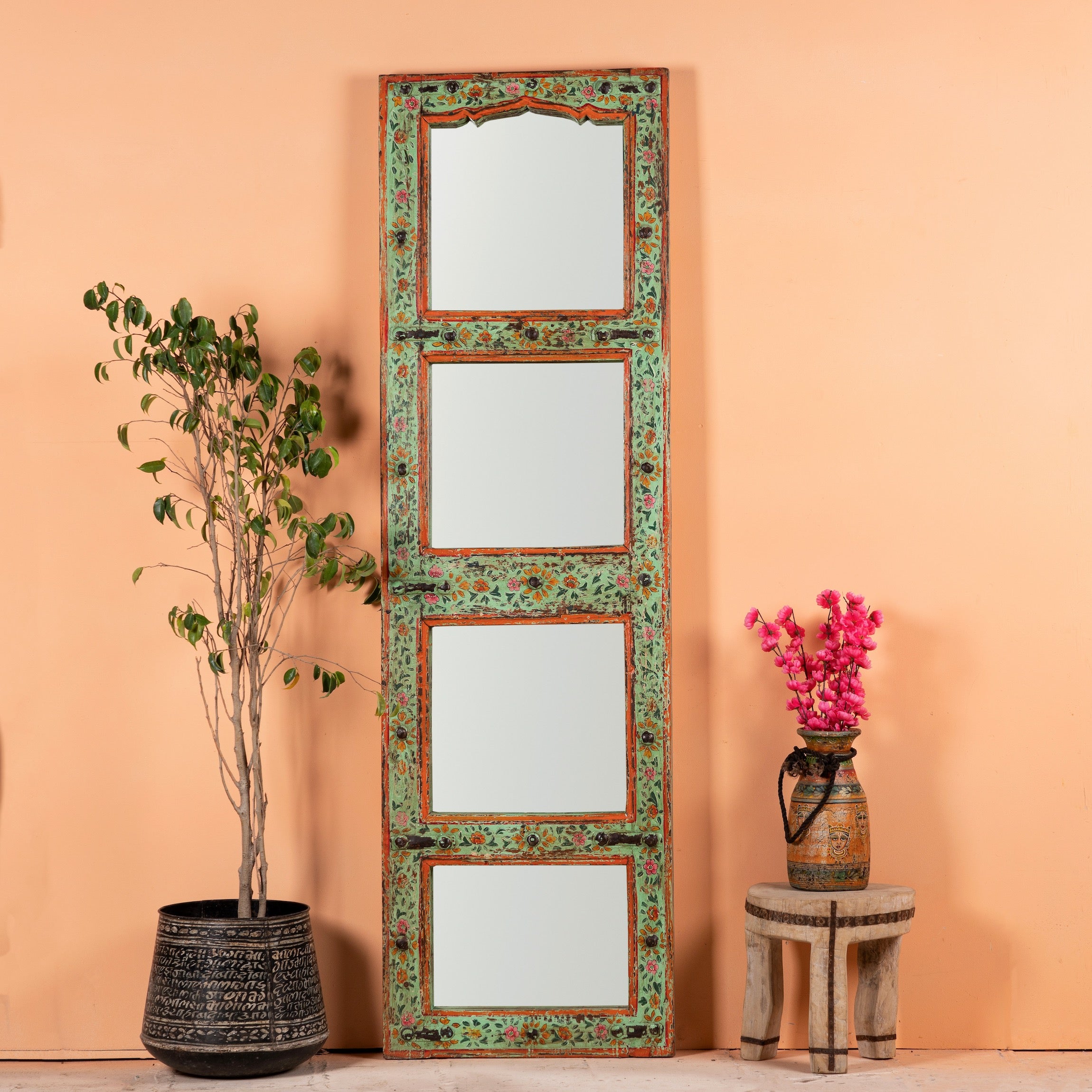 Lalpur is a finely hand-painted mirror made out of recycled Teak wood. The base of this mirror is an old glass furniture door.
