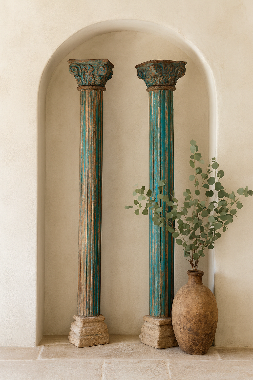 Perfect for adding height, texture, and artistic flair, they blend seamlessly into vintage home decor while also complementing a boho chic living room aesthetic. Whether placed flanking an entryway, framing a seating area, or simply displayed as standalone art, these pillars bring a sense of heritage and authenticity to any setting.