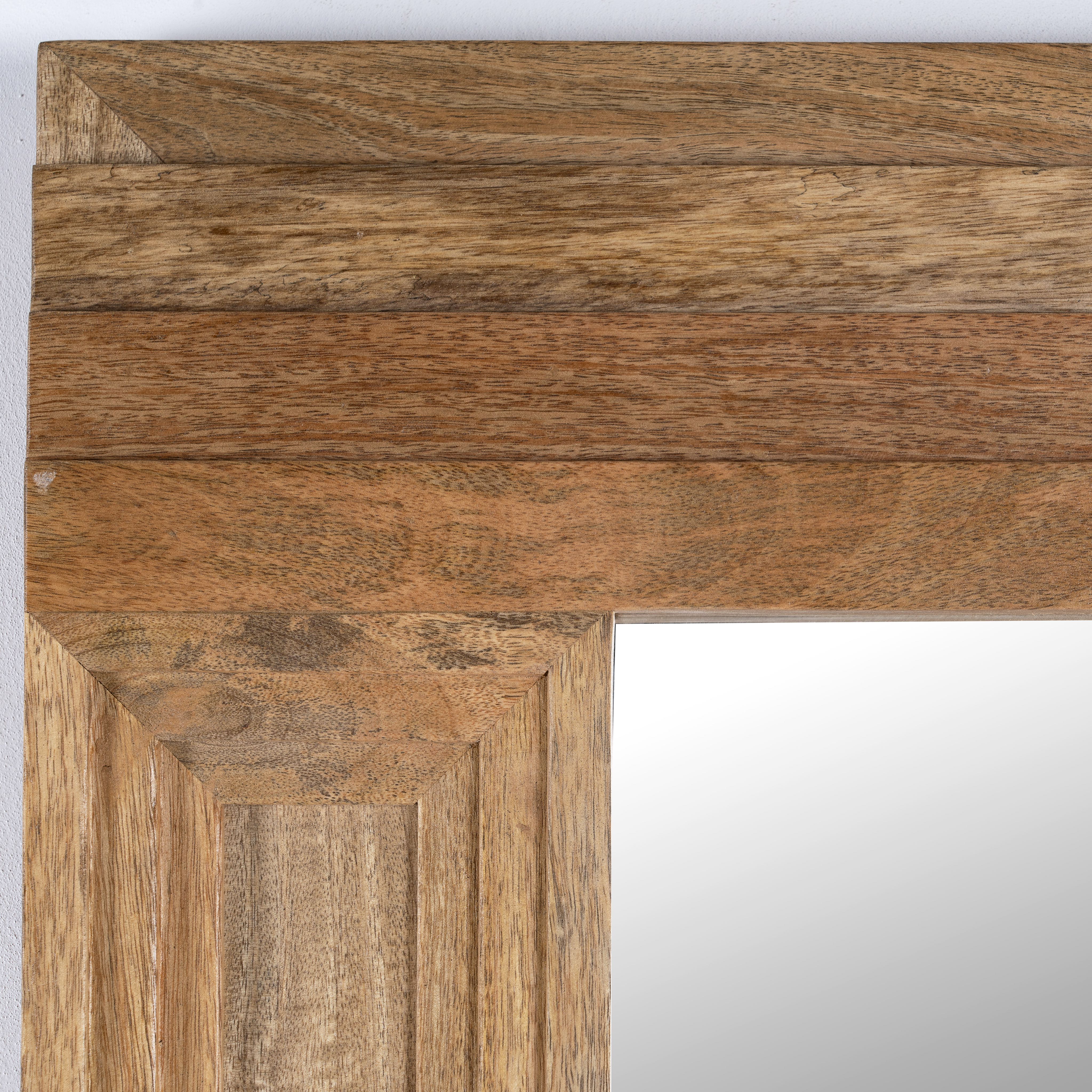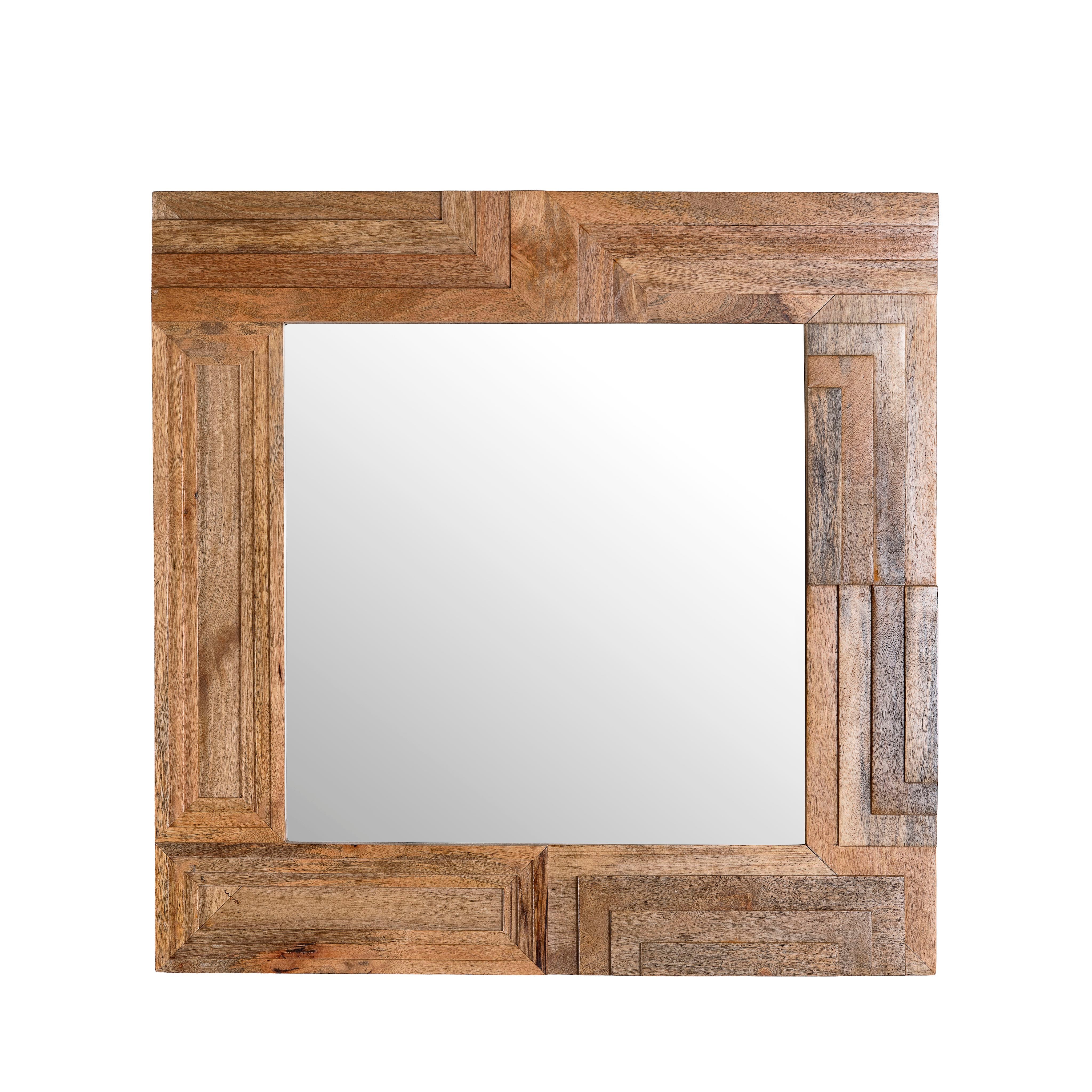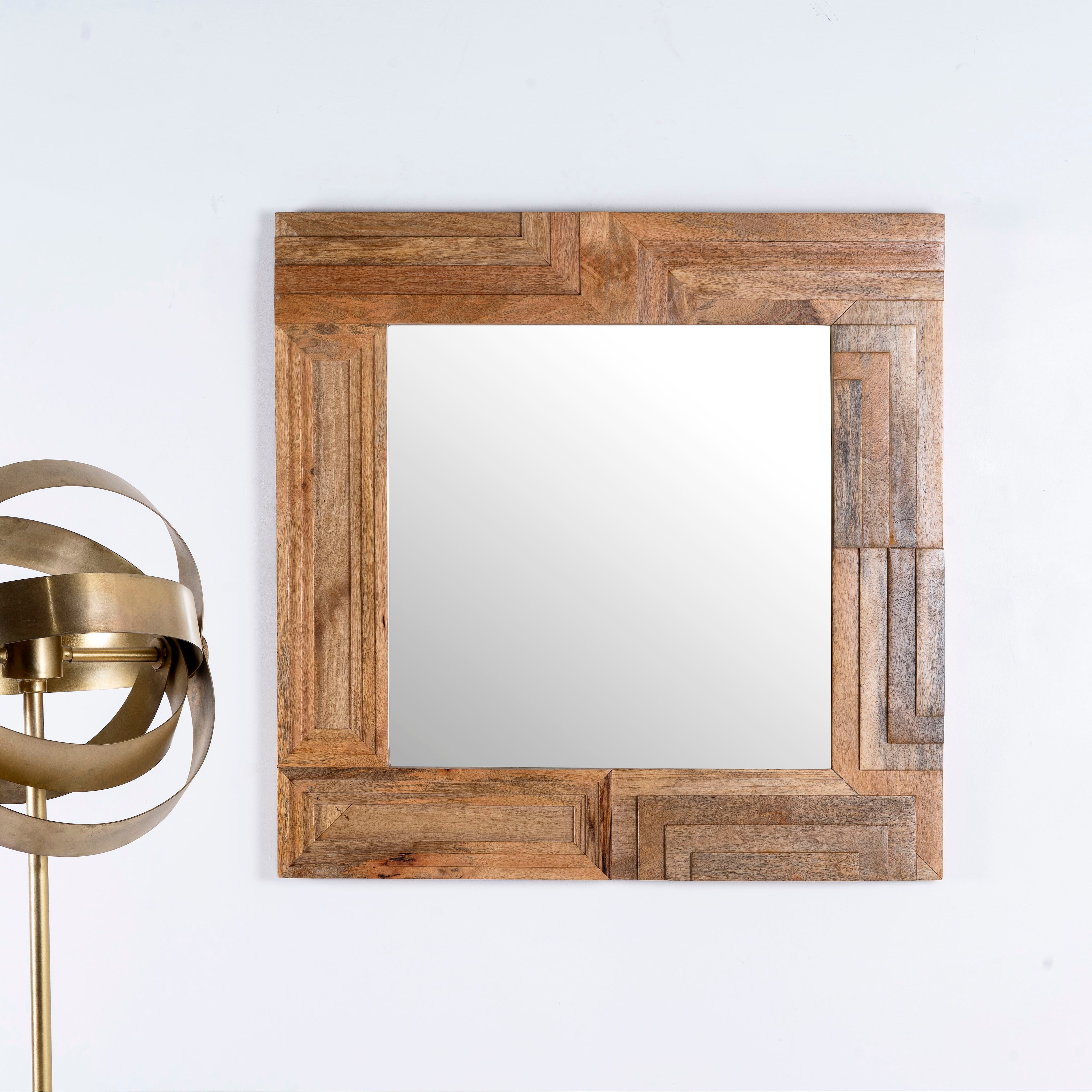 This stylish mirror features a square wooden design, meticulously handcrafted from natural mango wood. Its unique pattern and high-quality craftsmanship make it a standout piece that adds a touch of elegance to any room.