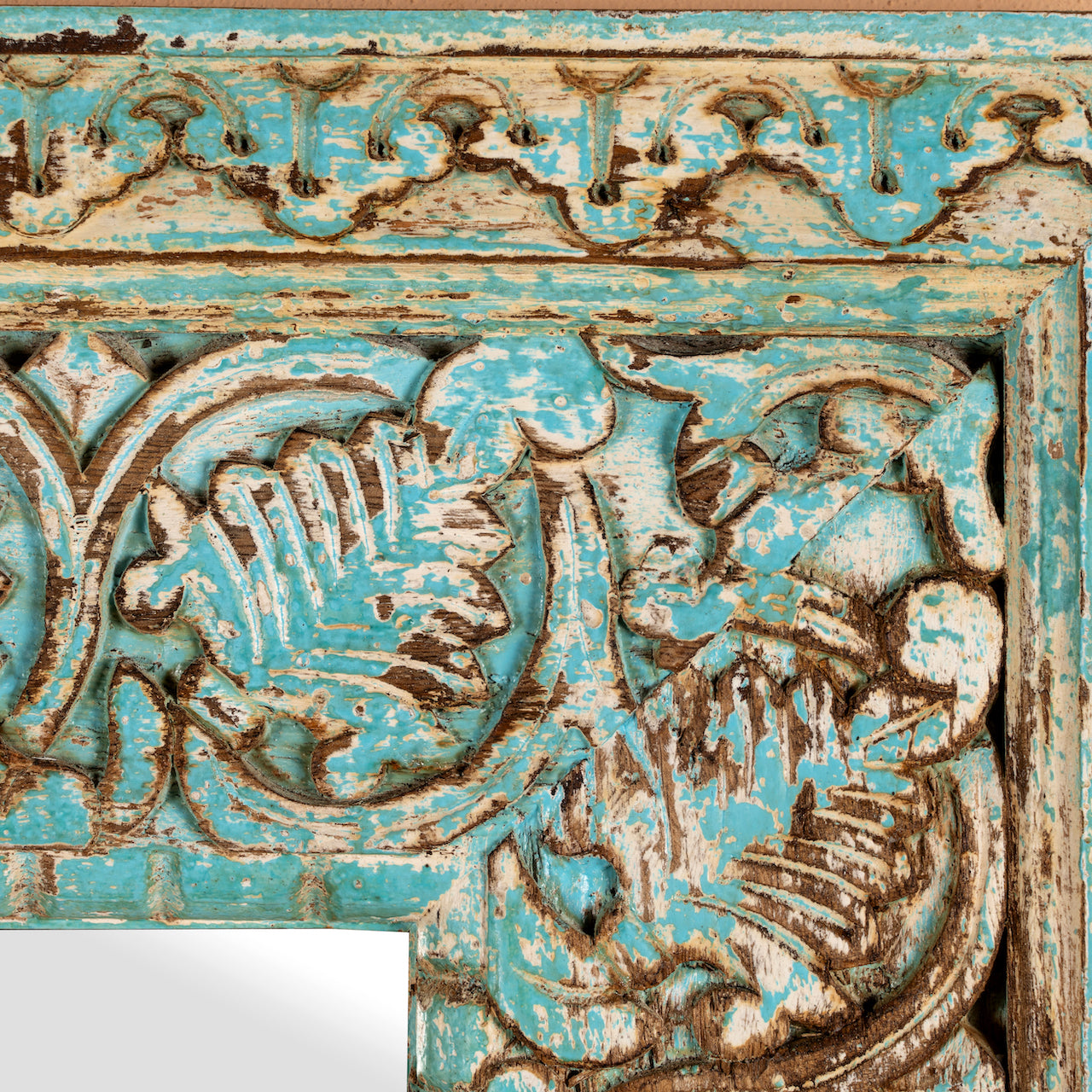 Introducing the Anuvinda mirror, a stunning piece of Indian craftsmanship. This mirror features a beautiful turquoise color and is adorned with intricate hand-carved engravings that highlight the skill of Indian artisans. This mirror adds both a pop of color and a touch of Indian culture to your living space.