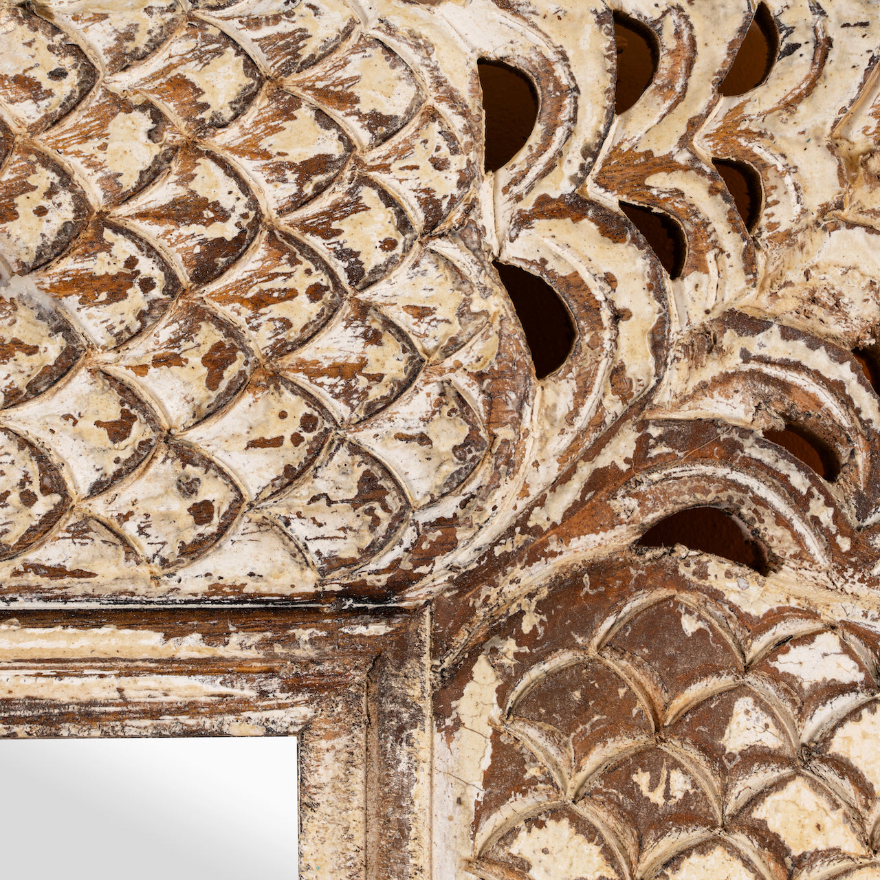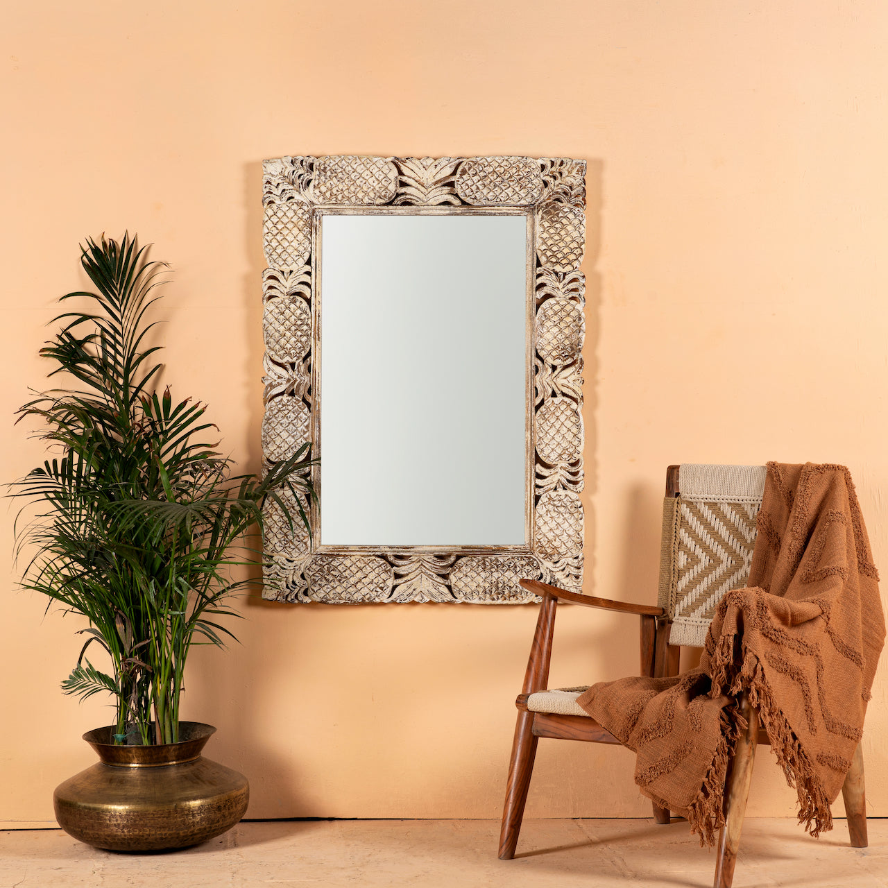 Introducing the Apasmara mirror, a stunning showcase of Indian craftsmanship. This mirror features a white-washed color, creating a sense of elegance and simplicity. What sets it apart are the intricate hand-carved engravings, reflecting the artistry of Indian artisans. The Apasmara mirror adds character and cultural depth to your living space. Elevate your decor with this unique and captivating mirror, effortlessly blending style and tradition while bringing the essence of India into your home.