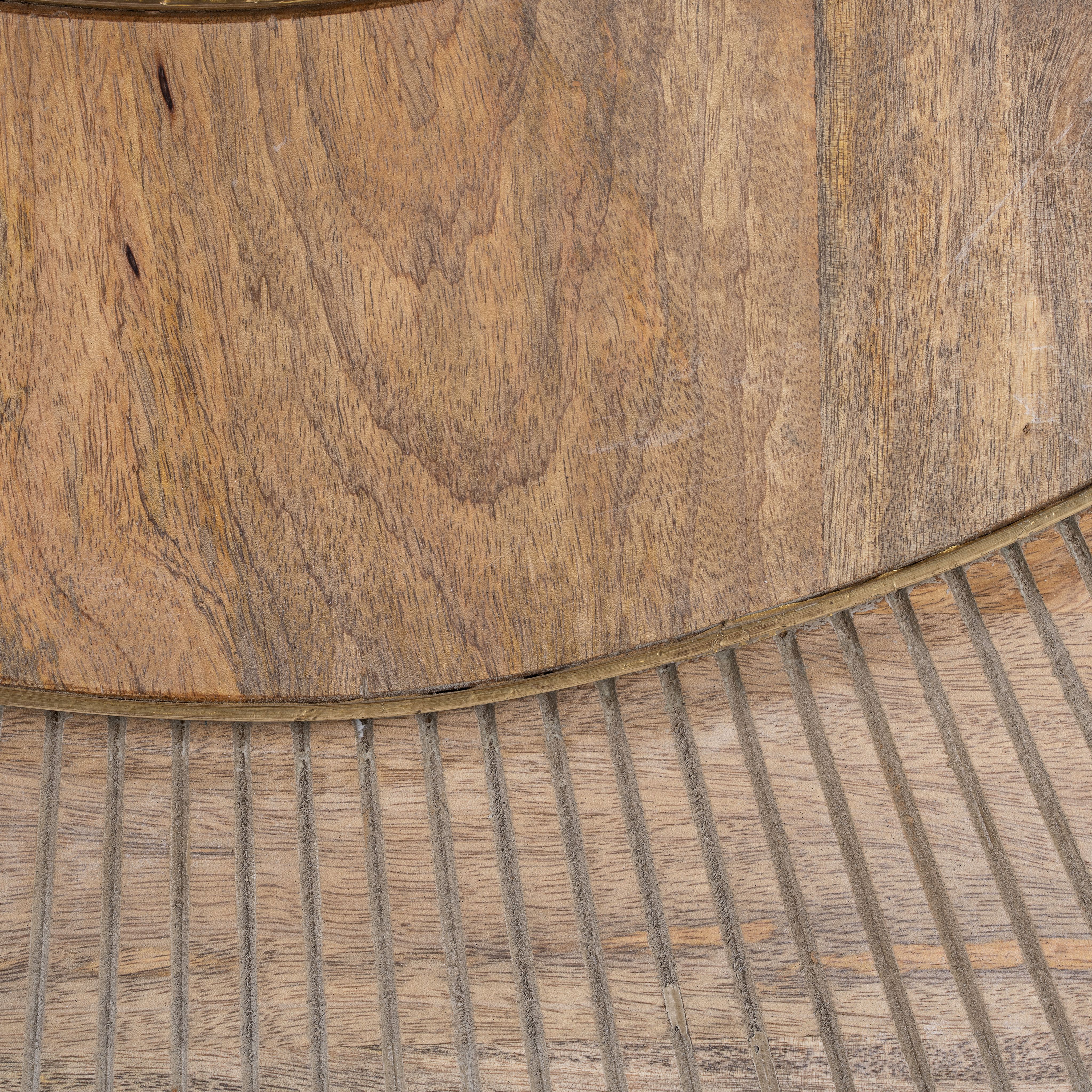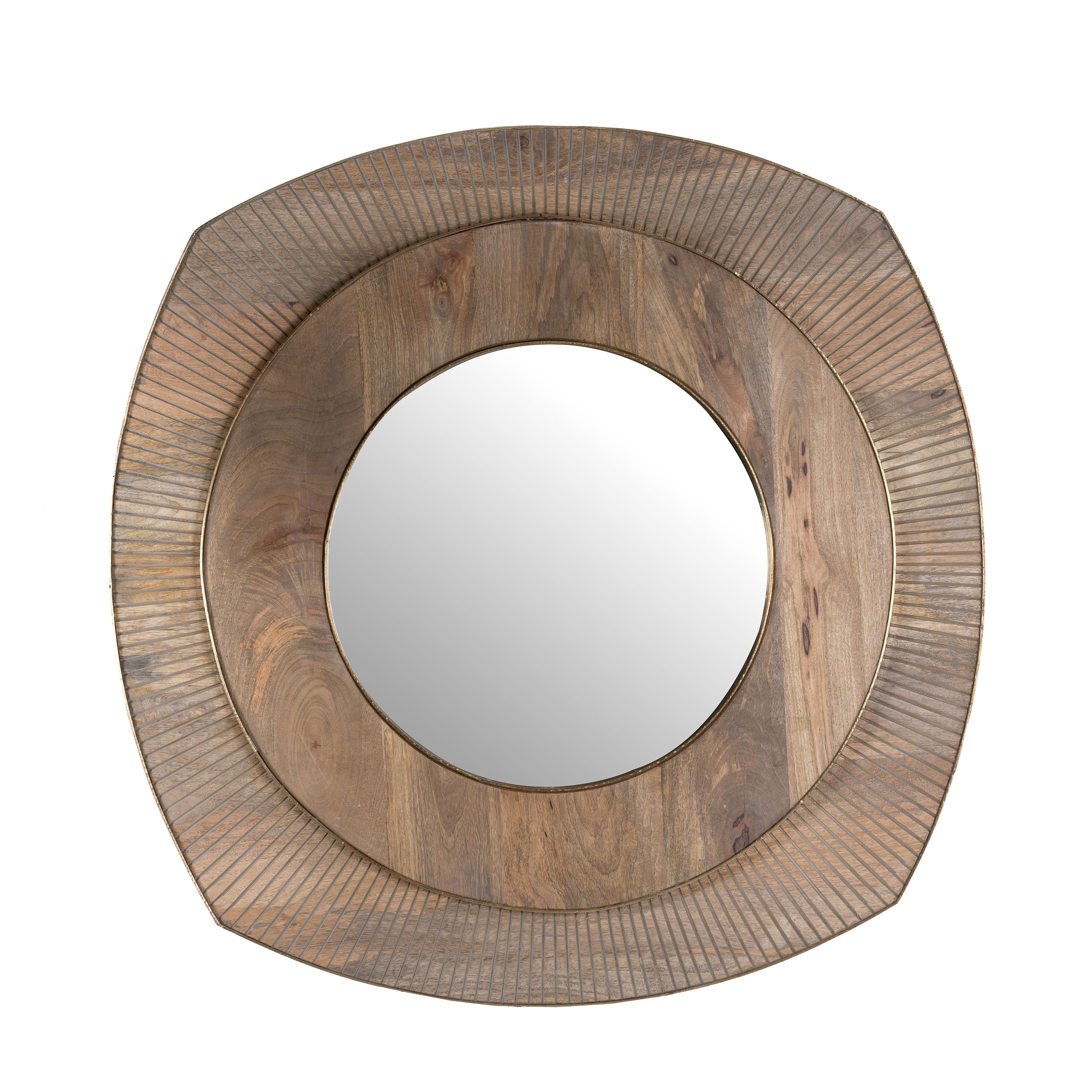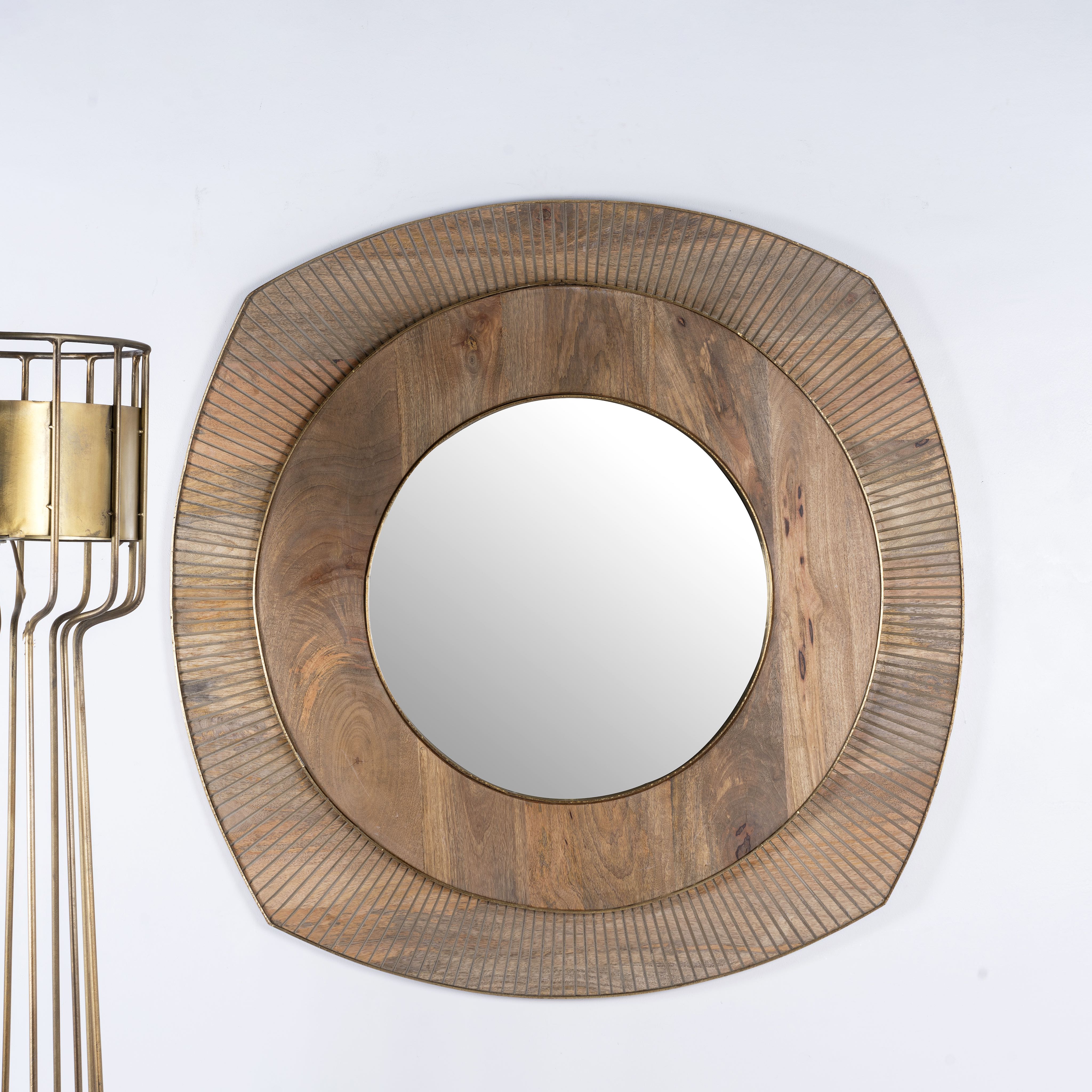Enhancing the luxurious appeal, the edges of the mirror are cladded in brass, providing a striking contrast to the natural wood. This combination of materials results in a harmonious blend of rustic charm and modern elegance, making it a standout piece in any room.