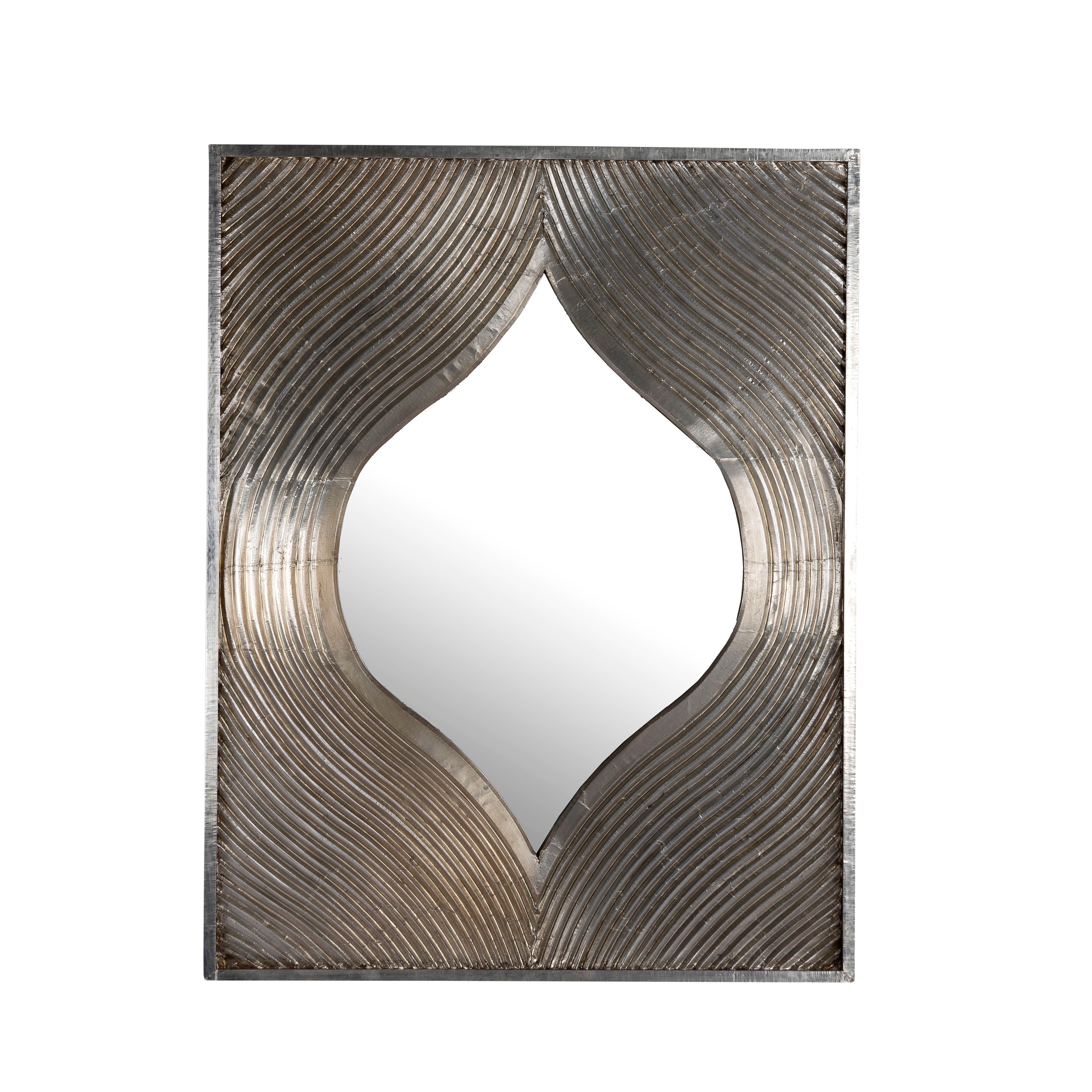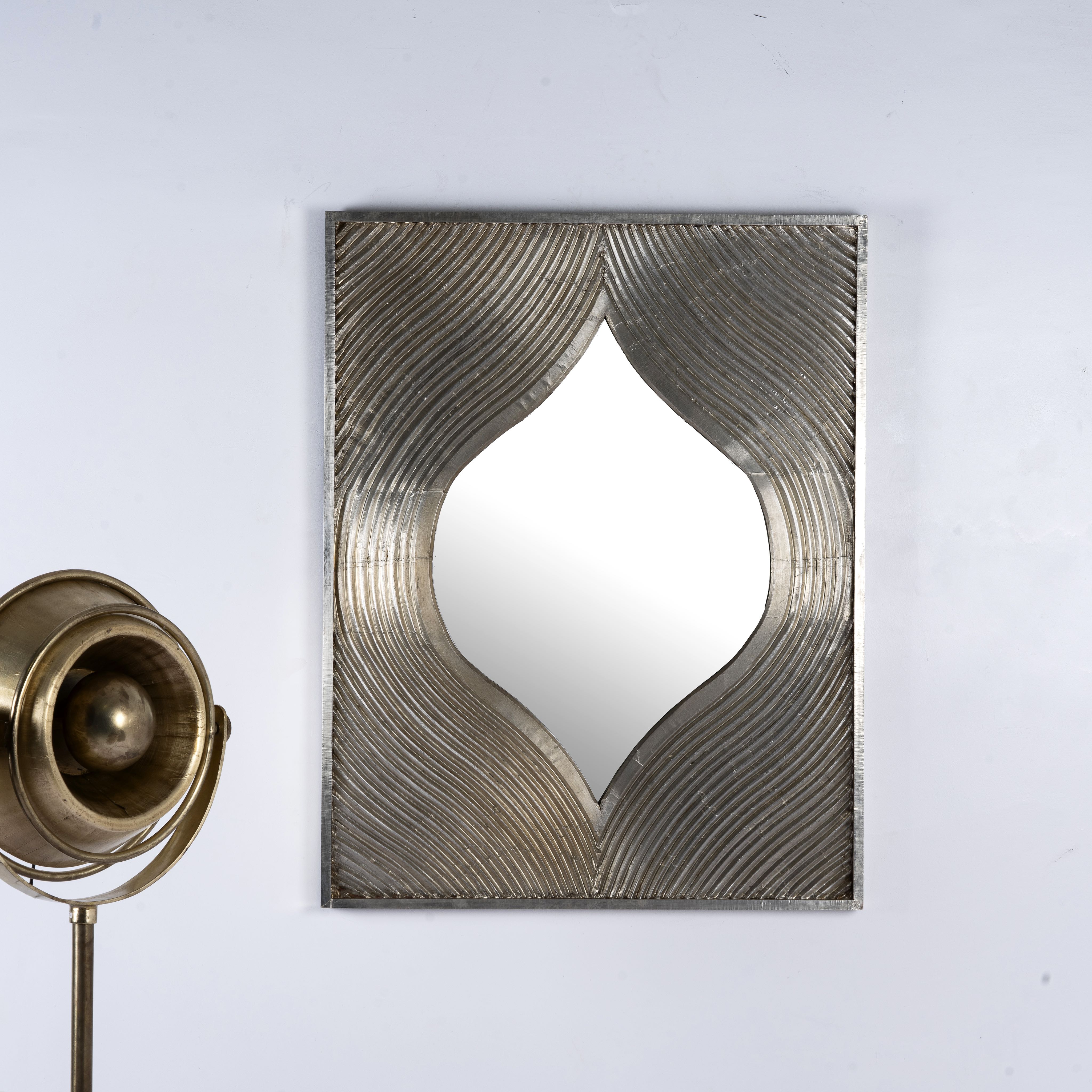 Introducing our magnificent wall mirror Saumya, an exquisite piece that blends natural beauty with sophisticated craftsmanship. This large mirror features an intricately carved design, creating a sense of movement and elegance that captures the eye. The natural wood frame is enhanced with white metal cladding, adding a touch of luxury and refinement to the overall design.
