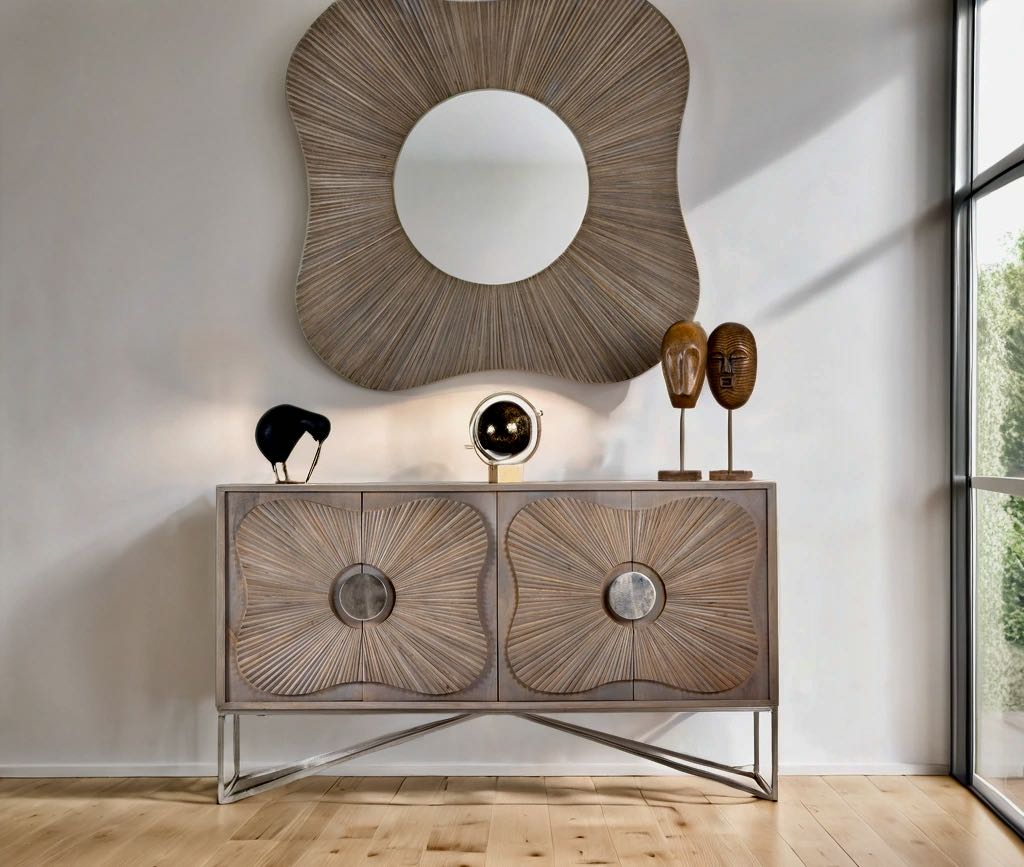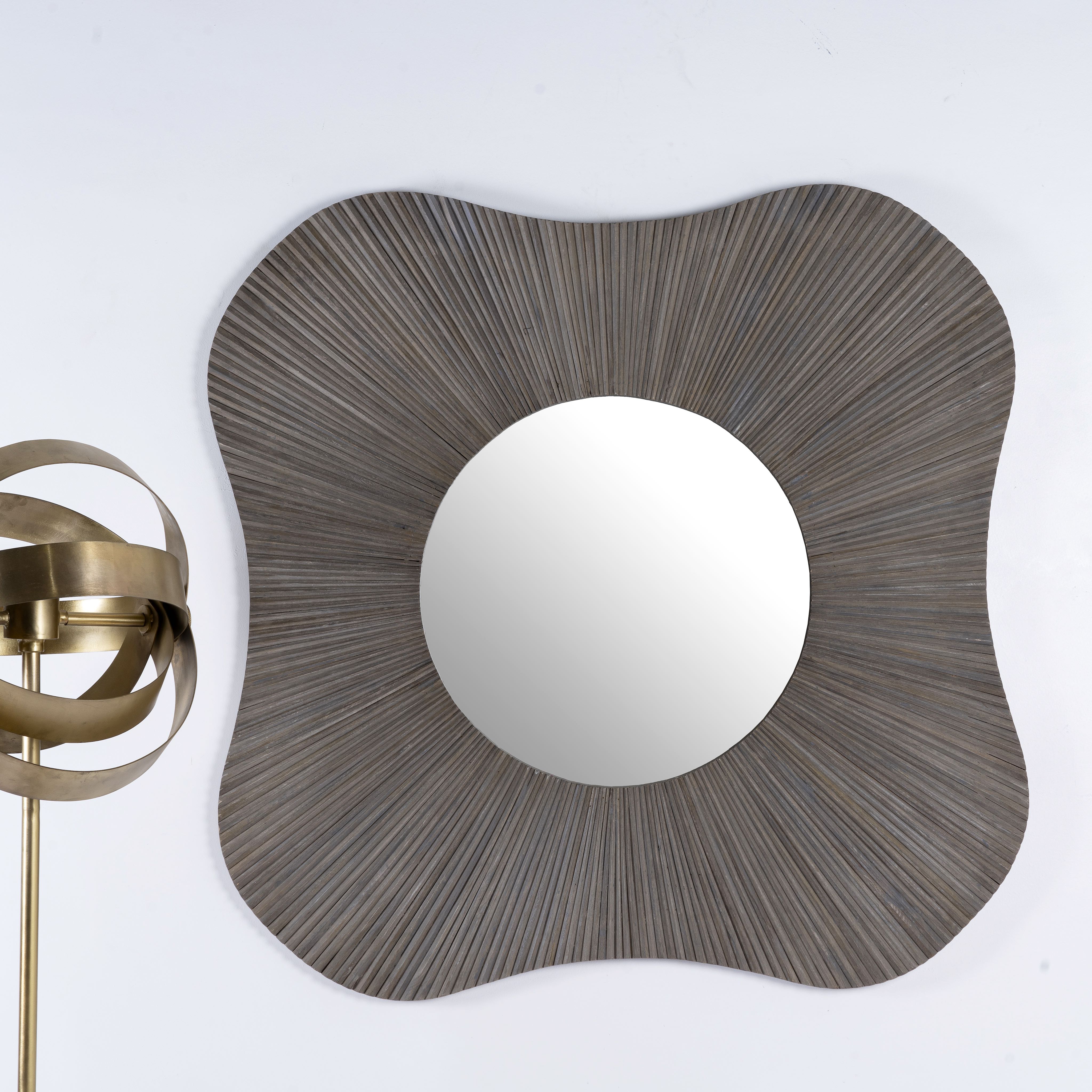 Meet our beautiful large designer mirror, a real statement piece made from high-quality mango wood. This elegant mirror has a sophisticated grey wash, highlighting the natural wood grain and adding a touch of contemporary charm. The focal point of this design is the captivating wave-sunburst pattern.
