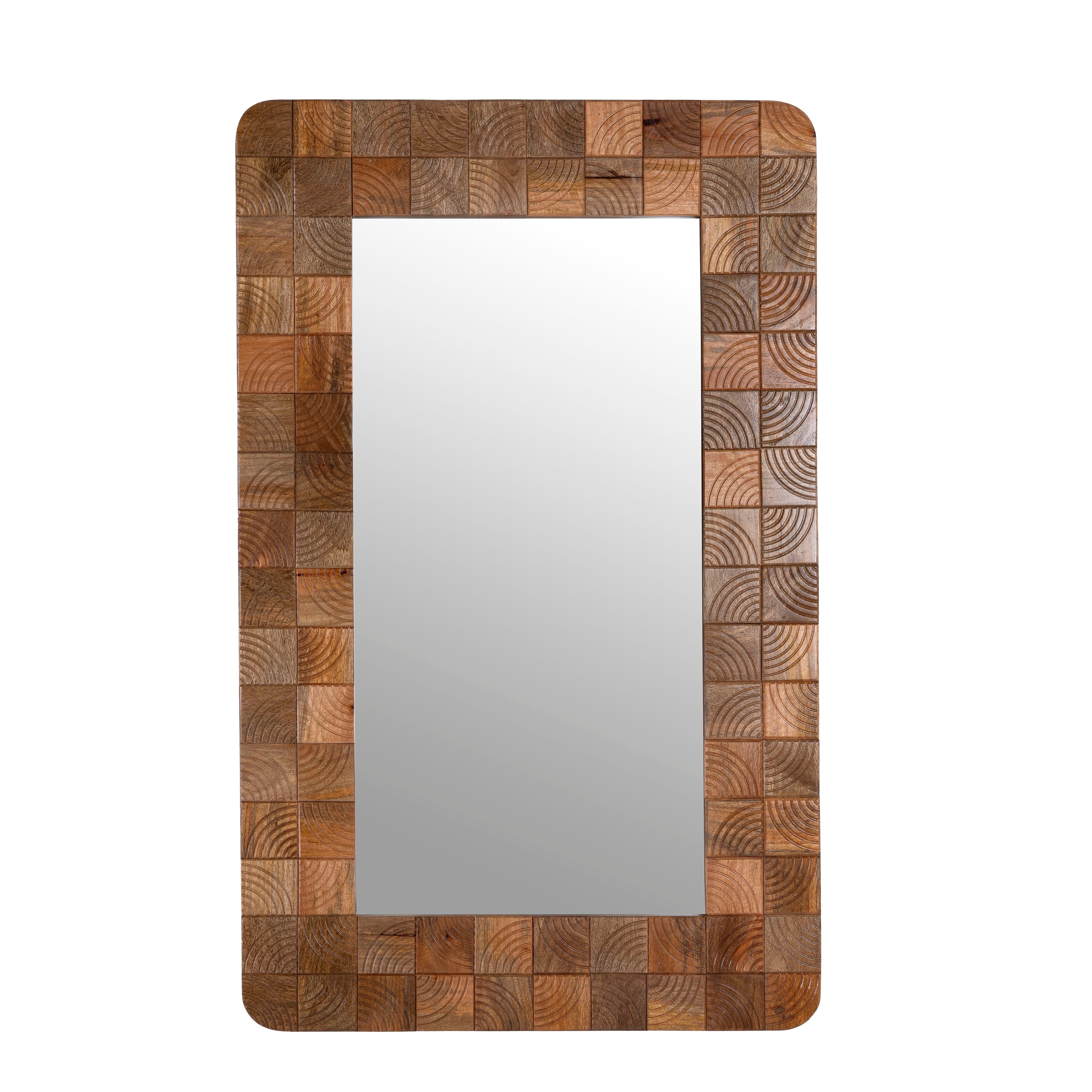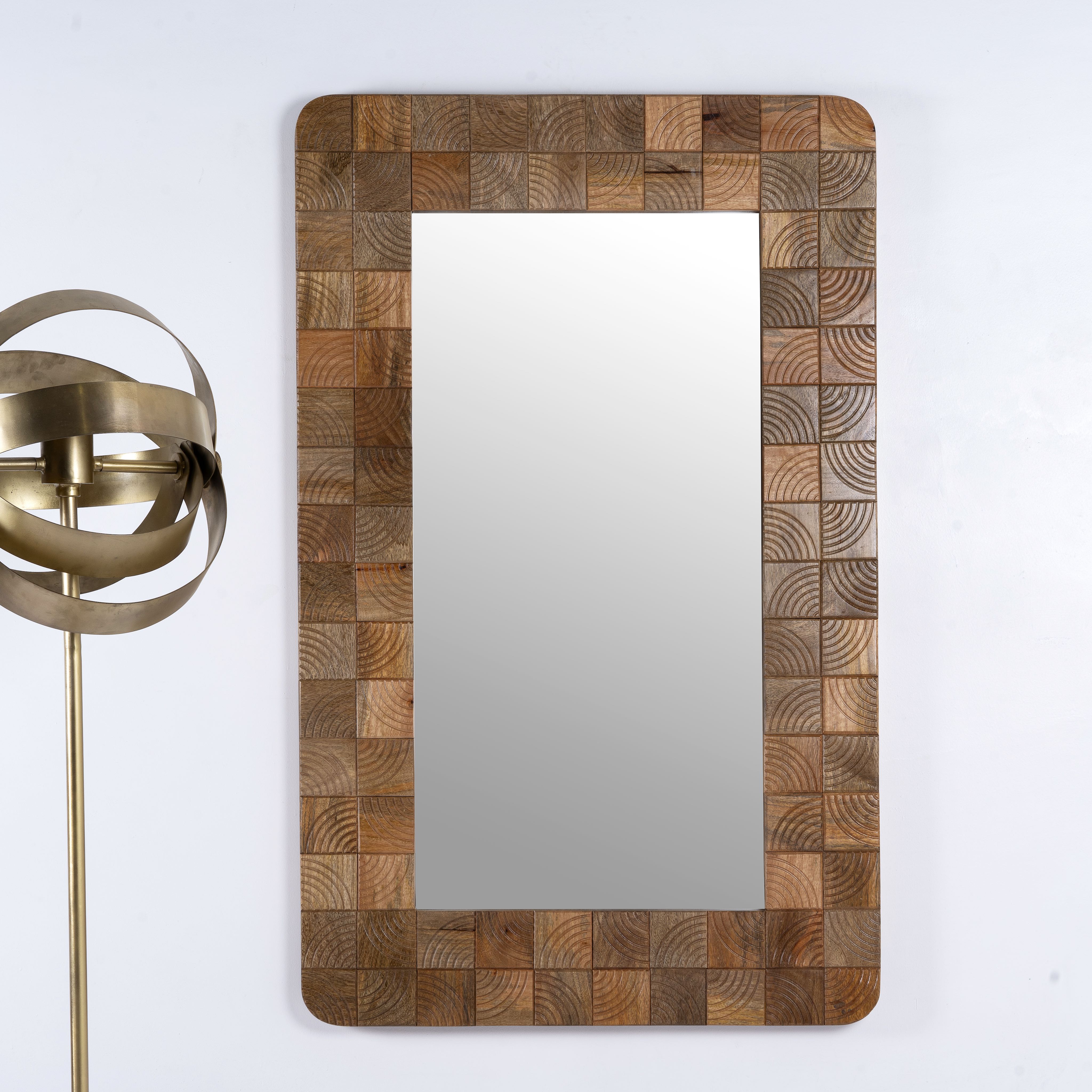 This rectangular mirror features an enchanting handmade wooden tile design, crafted from natural mango wood.