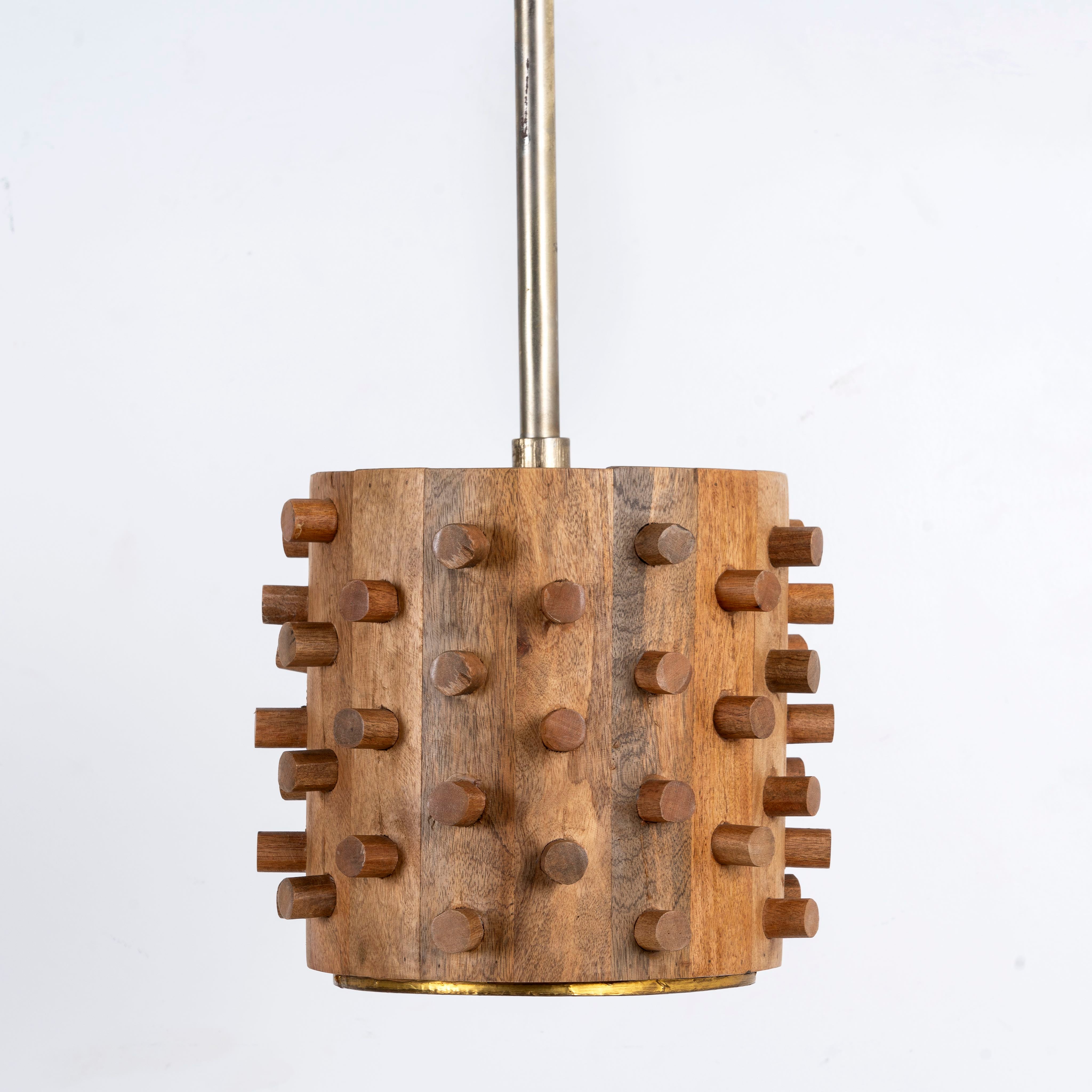 The lamp is suspended by a sturdy iron hanging, plated in luxurious brass, adding a sophisticated contrast to the natural wood. The brass-plated iron not only ensures durability but also enhances the overall aesthetic with its warm, opulent glow. This combination of materials and design makes the lamp a versatile addition to various interior styles, from rustic to contemporary.