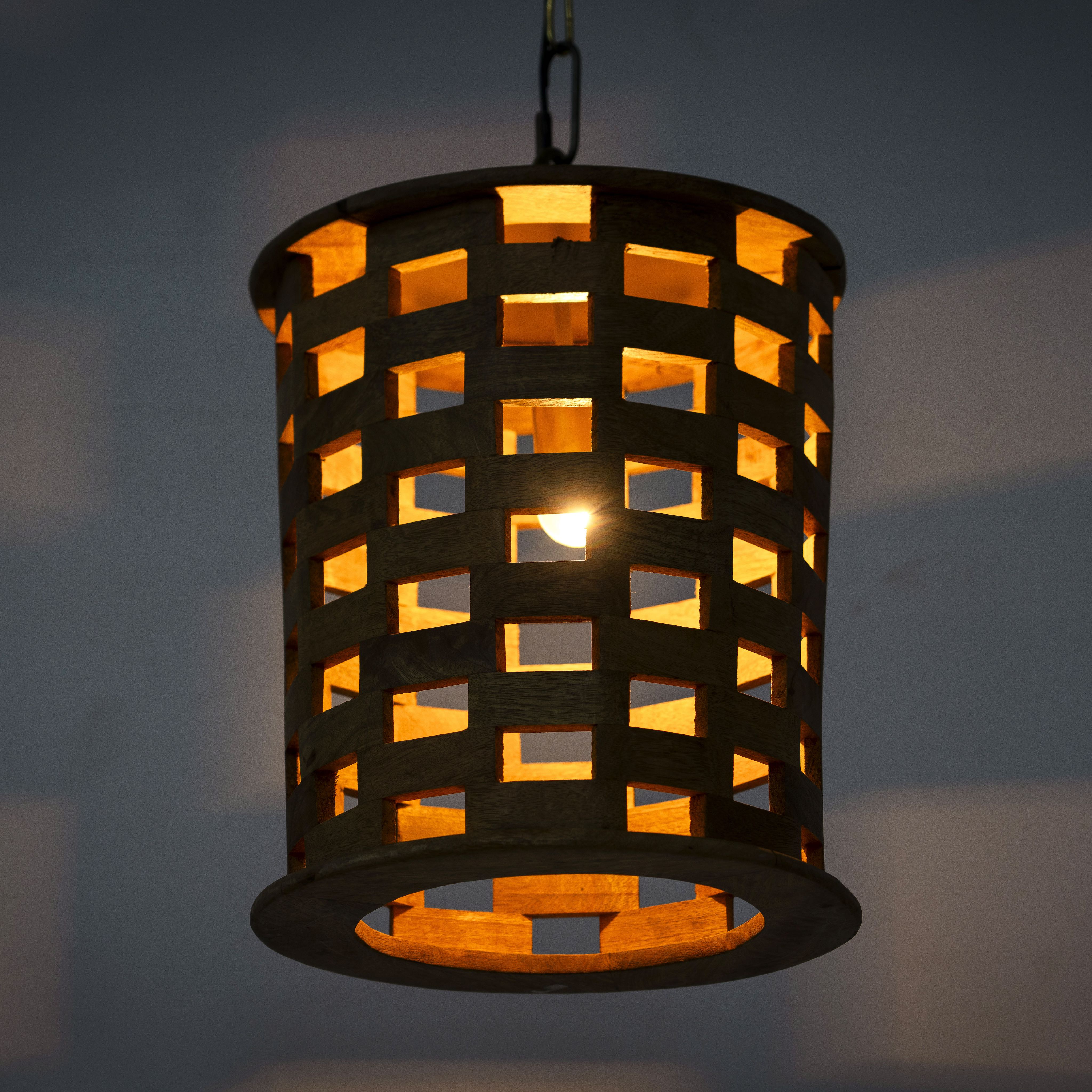 The lamp features a meticulously designed grid pattern, allowing light to filter through in a beautiful and intricate manner. The warm tones of the mango wood combined with the gleaming brass edges create a harmonious balance of rustic charm and modern sophistication. This ceiling lamp is an excellent addition to dining rooms, kitchens, living rooms, or entryways, bringing a touch of natural elegance to any space.
