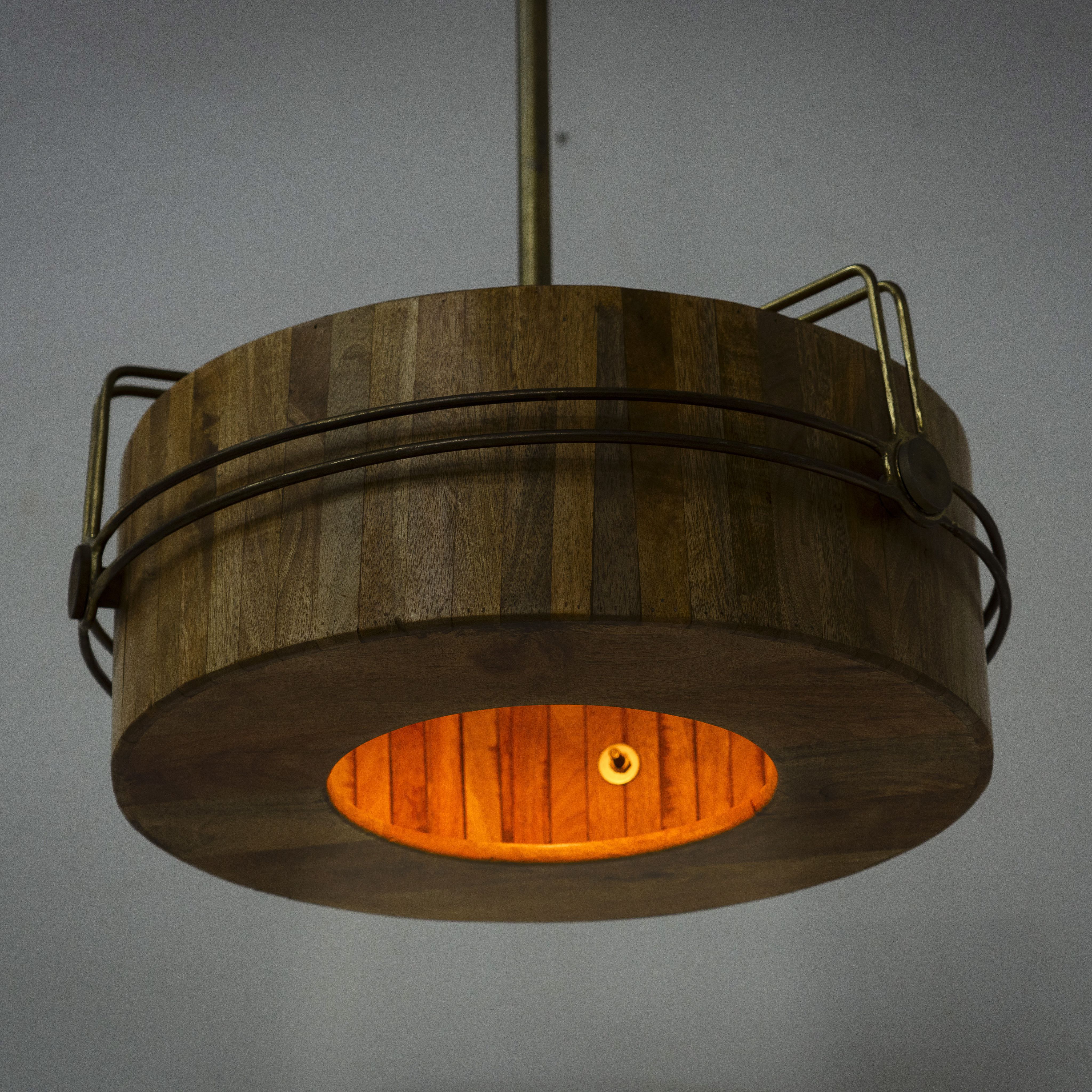 Introducing our exquisite single light pendant lamp Sivalinga, a perfect fusion of natural beauty and industrial elegance. This striking lamp features a meticulously crafted Mango wood light fixture, celebrated for its rich grain and warm tones. The wooden fixture is securely fixed to a sturdy iron frame, plated in a luxurious antique brass (messing) finish. This combination creates a captivating contrast that enhances the lamp's overall aesthetic.