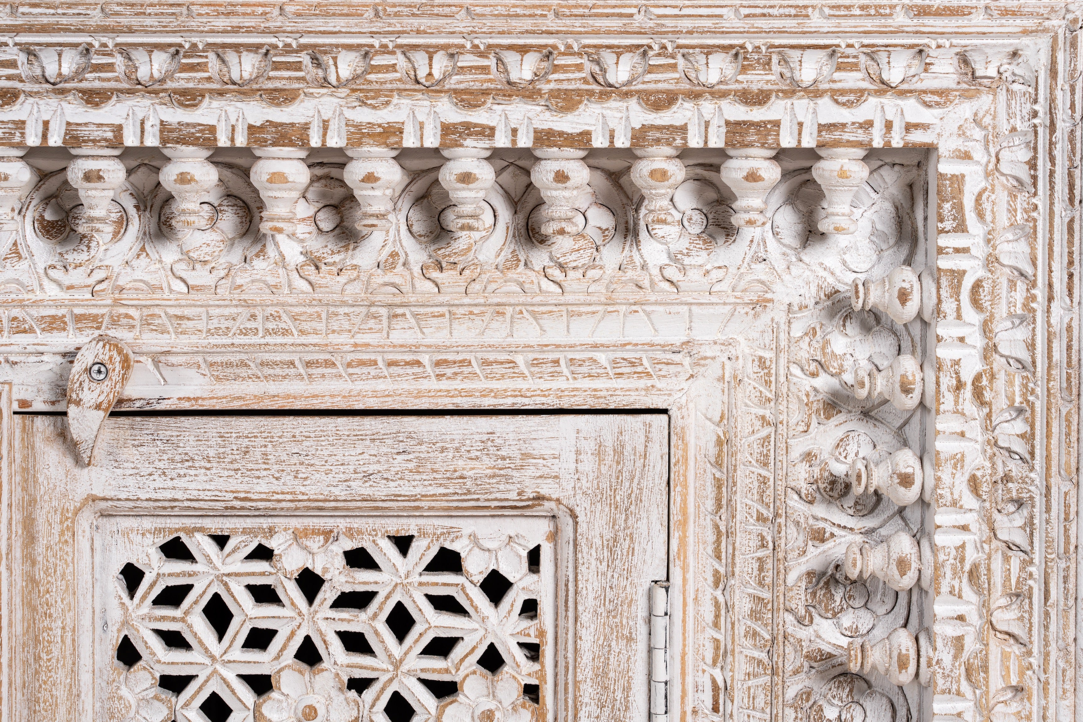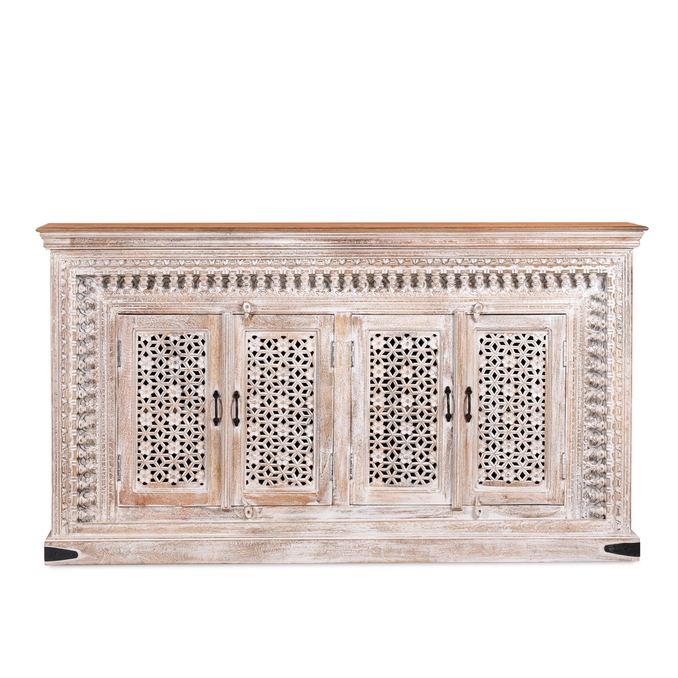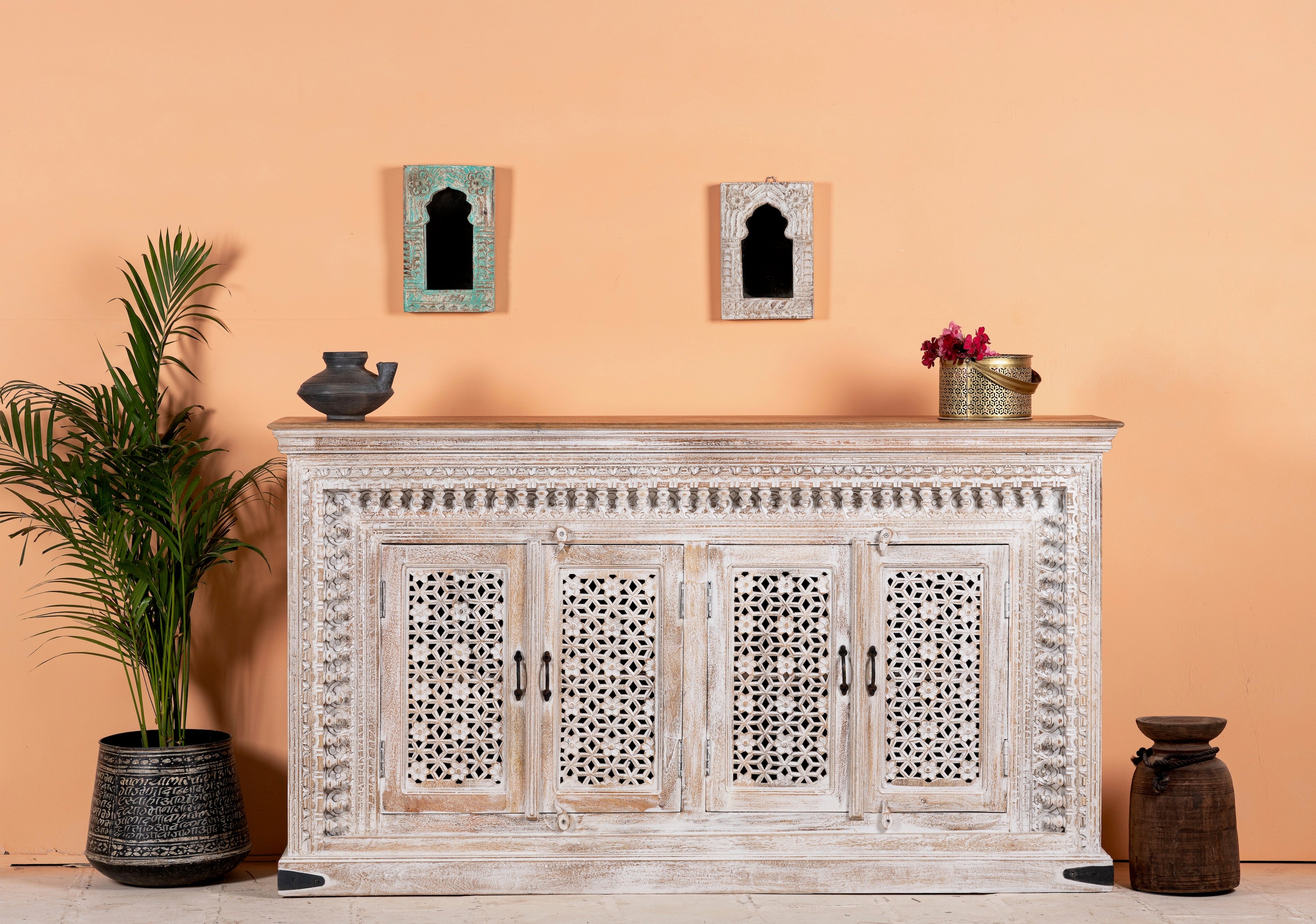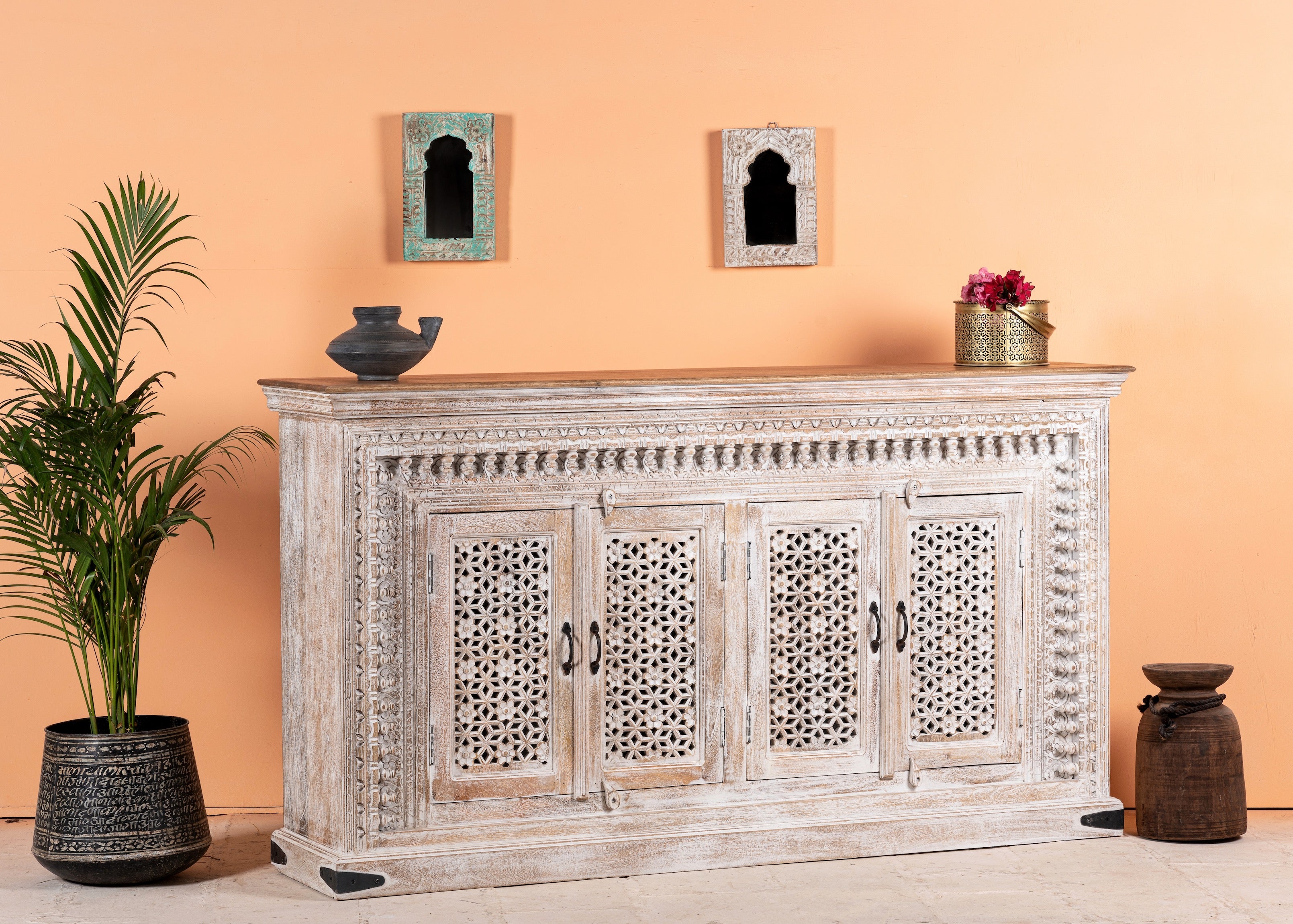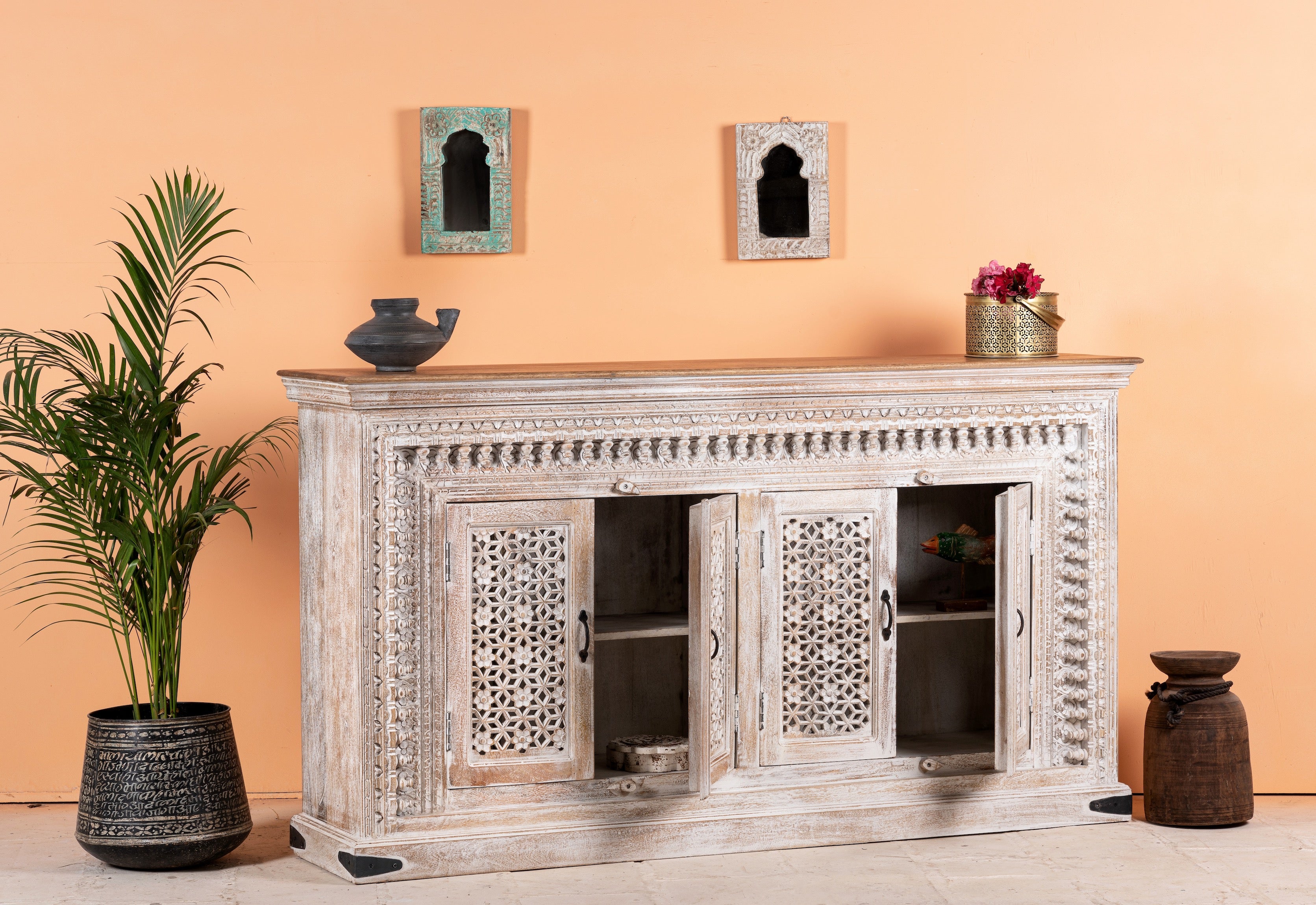 Introducing "Rajula," an exquisite Indian handcrafted sideboard that combines elegance and functionality in perfect harmony. Behind its hand-carved doors adorned with intricate floral engravings, you'll discover four spacious compartments, providing ample storage for all your belongings.