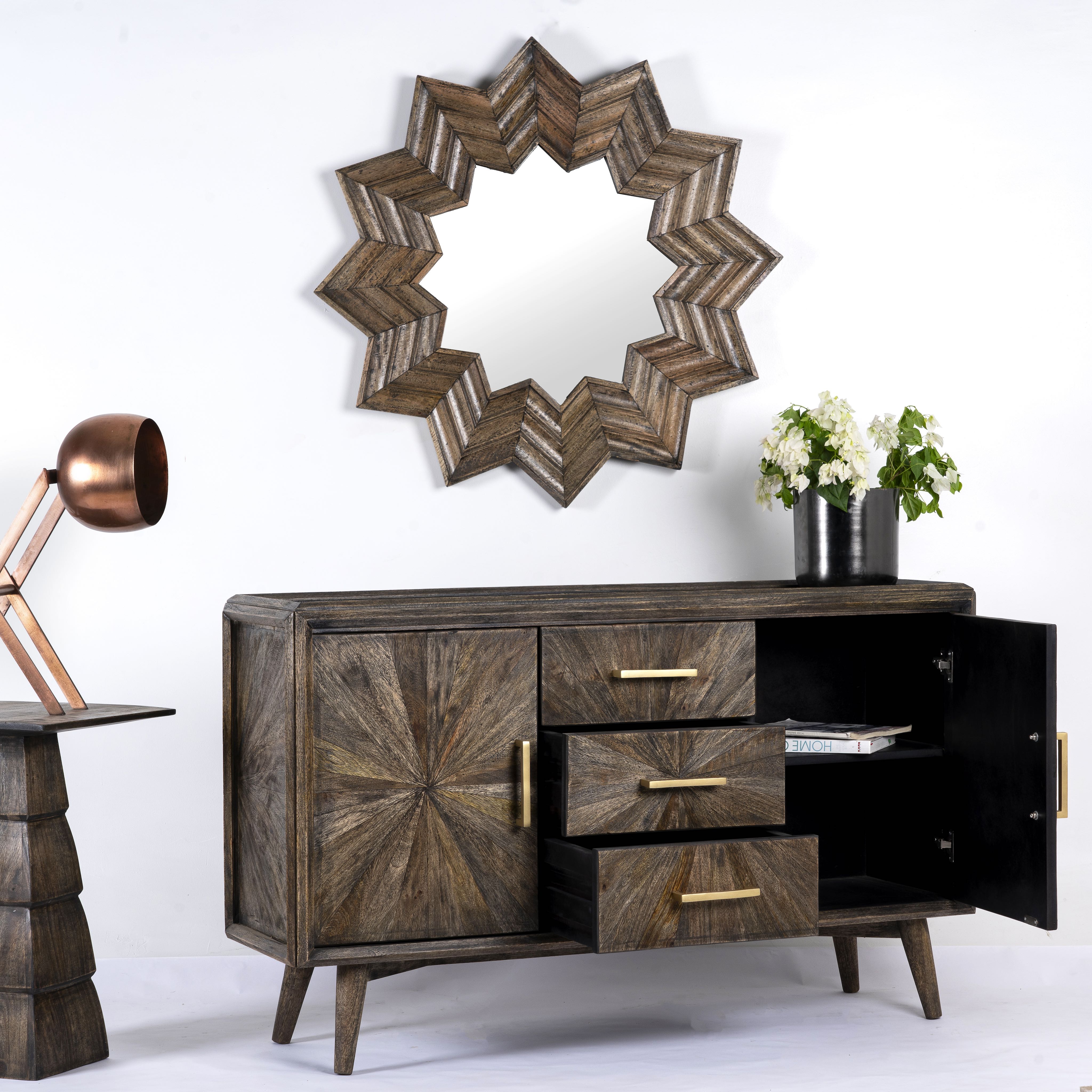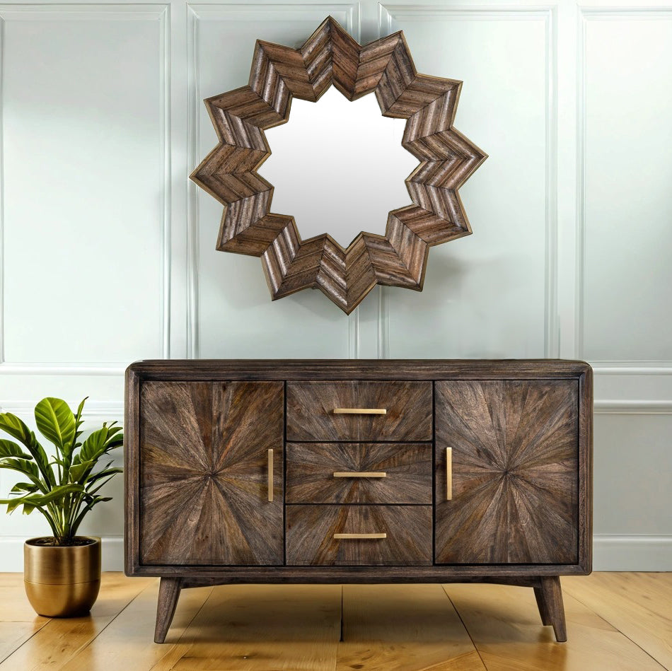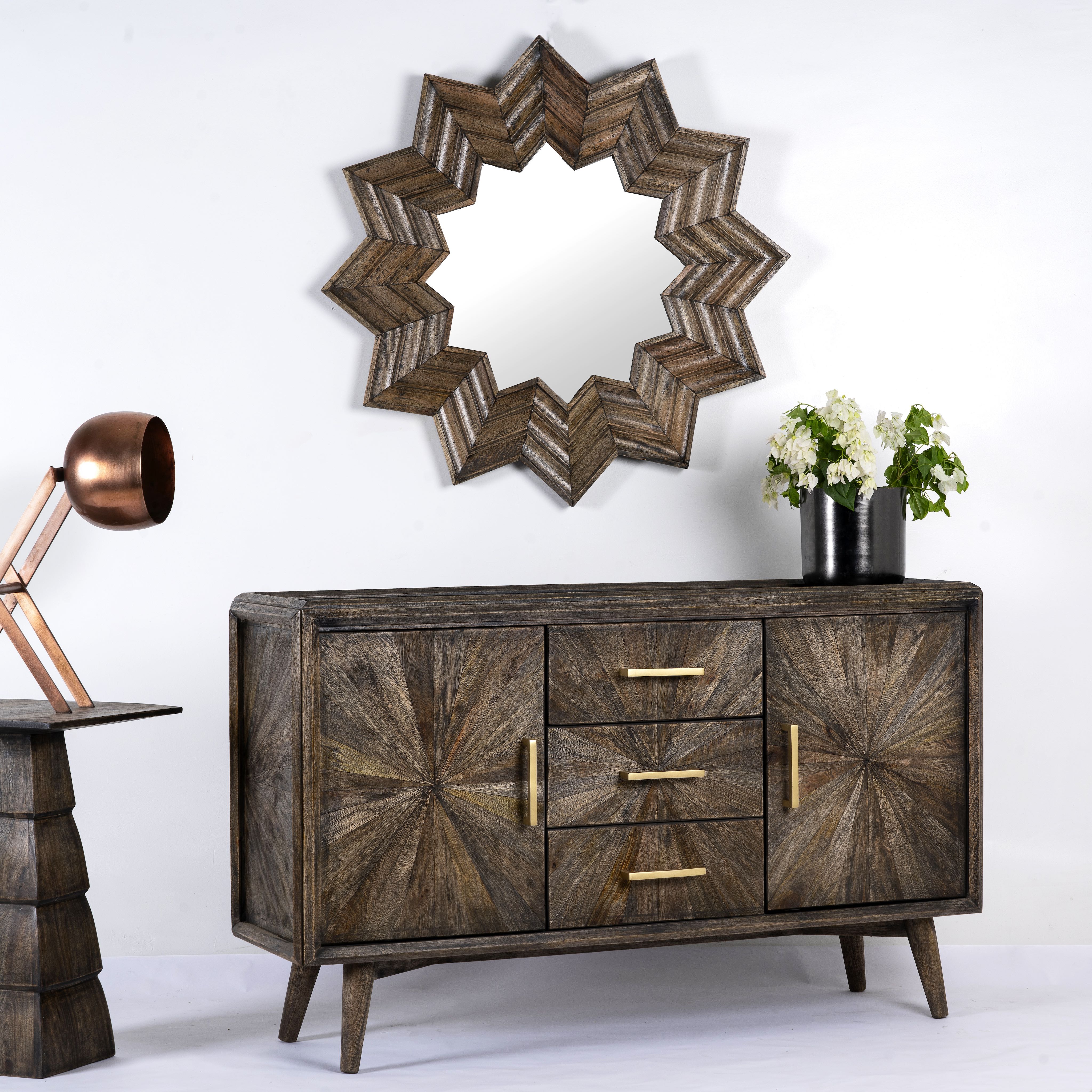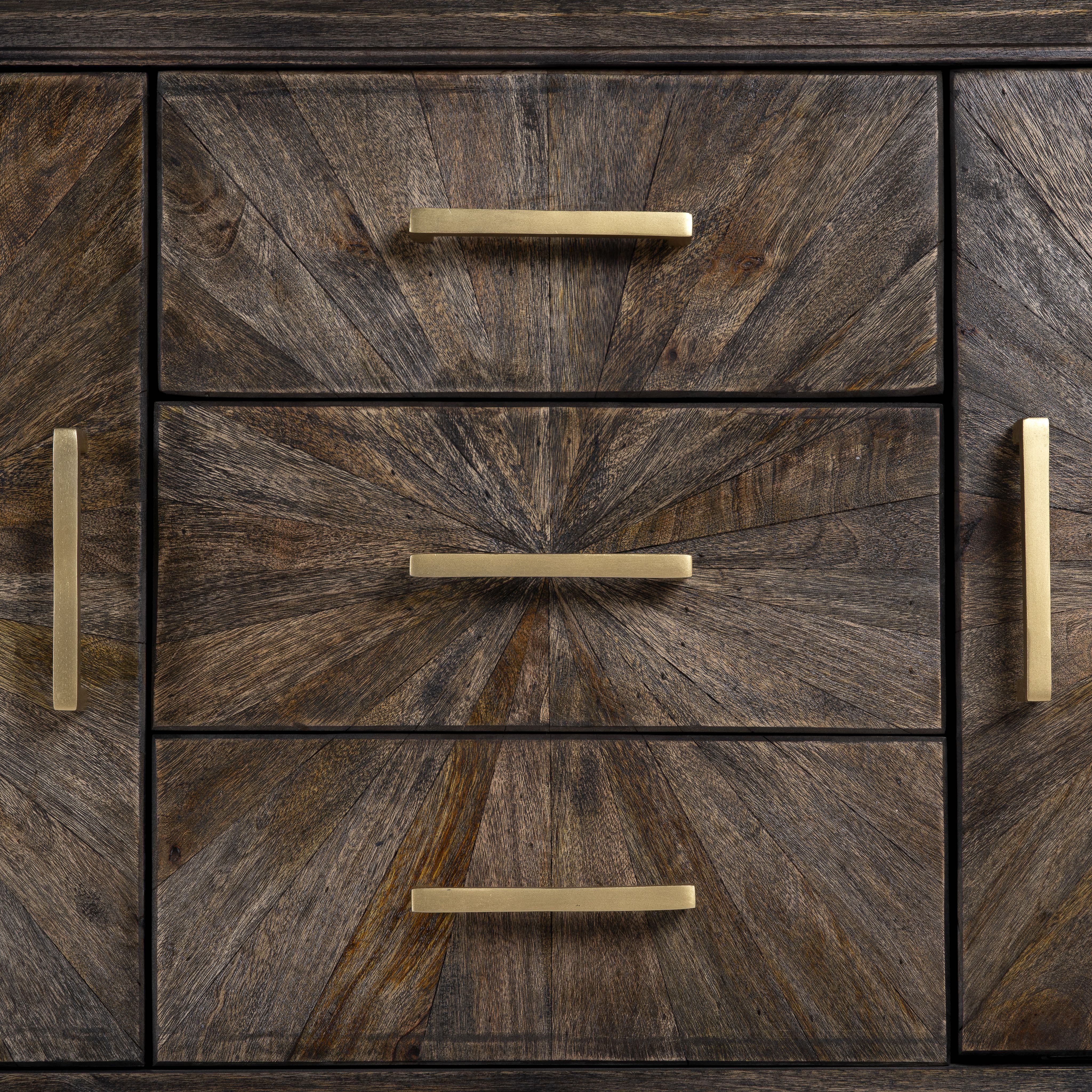 Enhance your interior with the Anish sideboard, crafted from natural mango wood and setting new design trends. This handmade piece features a stunning sunburst pattern with 2 doors and 3 drawers, making it truly incomparable. The sandblasted gray finish beautifully contrasts with the brass handles, adding a touch of elegance.