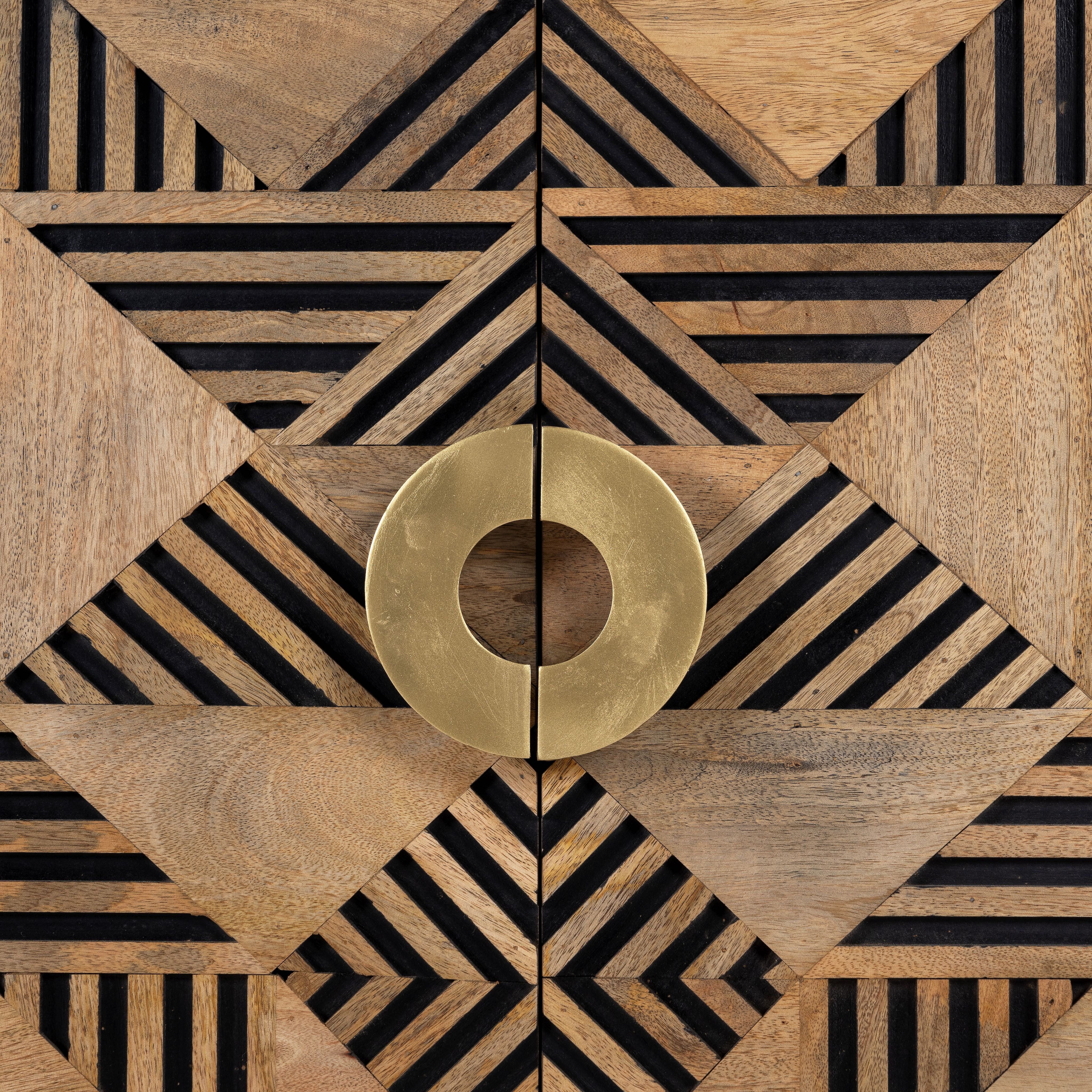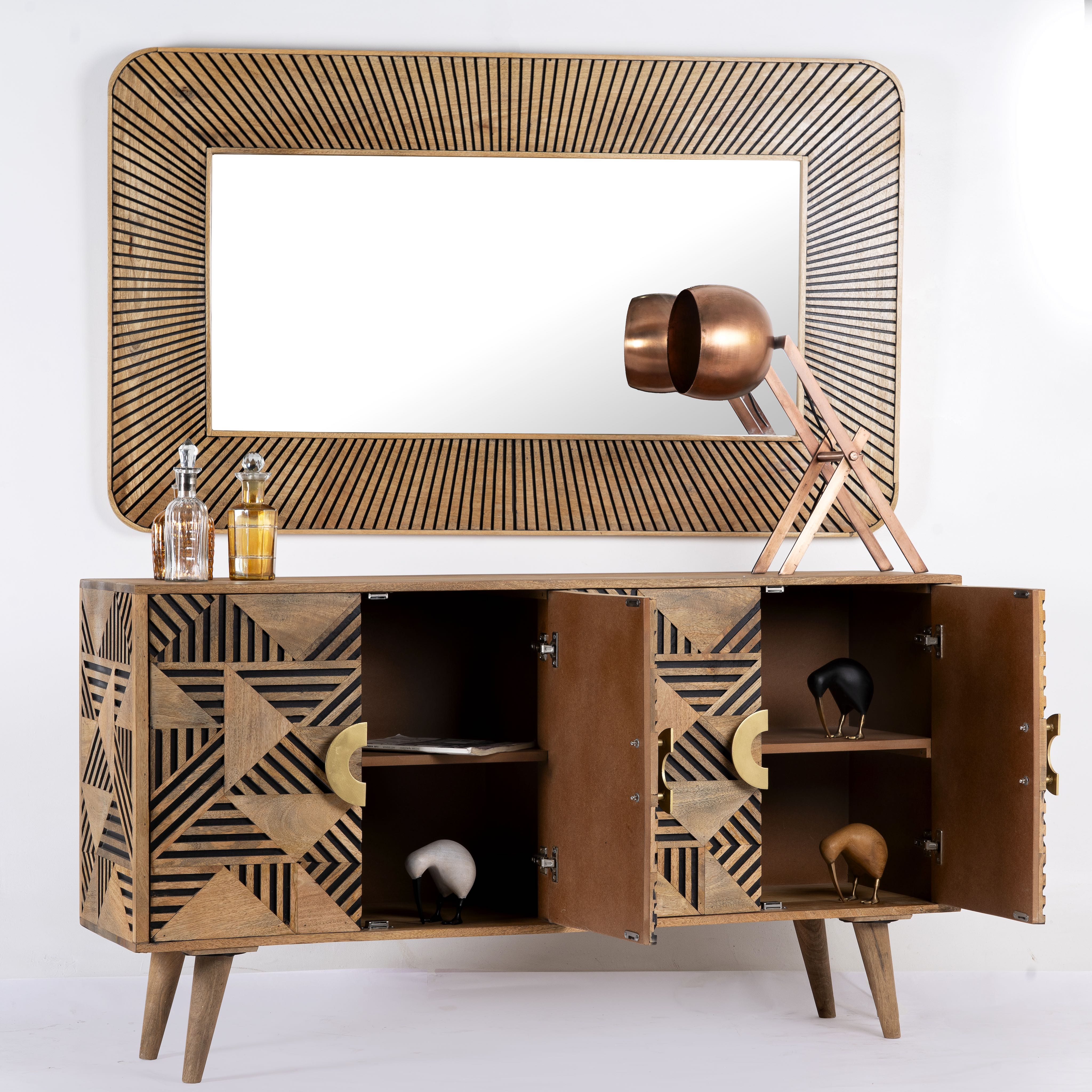 Elevate your living space with this striking handcrafted mango wood sideboard, featuring a bold geometric design and luxurious brass-plated handles. This mid-century modern-inspired piece blends artistry with functionality, making it a perfect statement for any contemporary or eclectic interior. Its sleek silhouette, intricate patterns, and premium materials combine to create a sophisticated yet practical storage solution.
