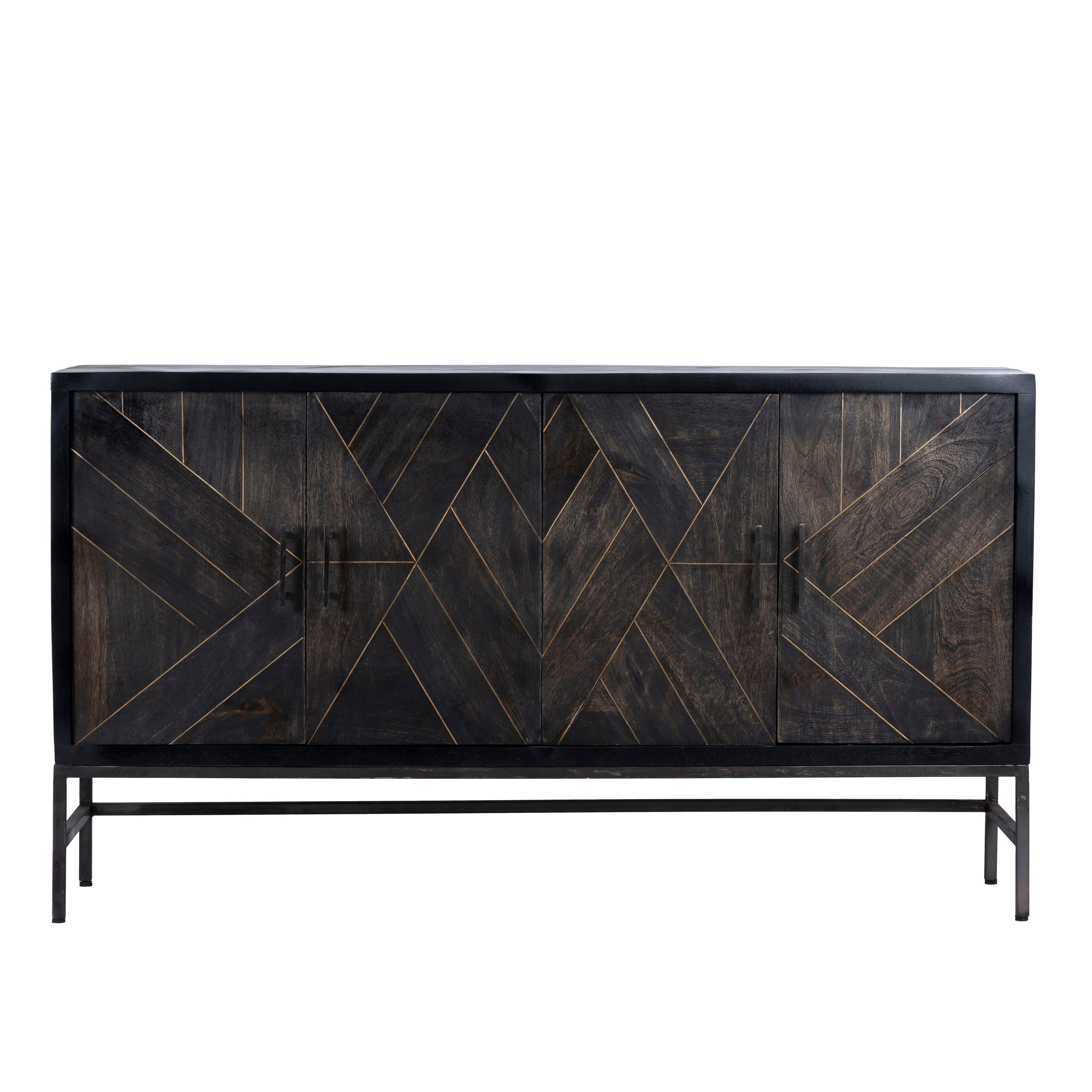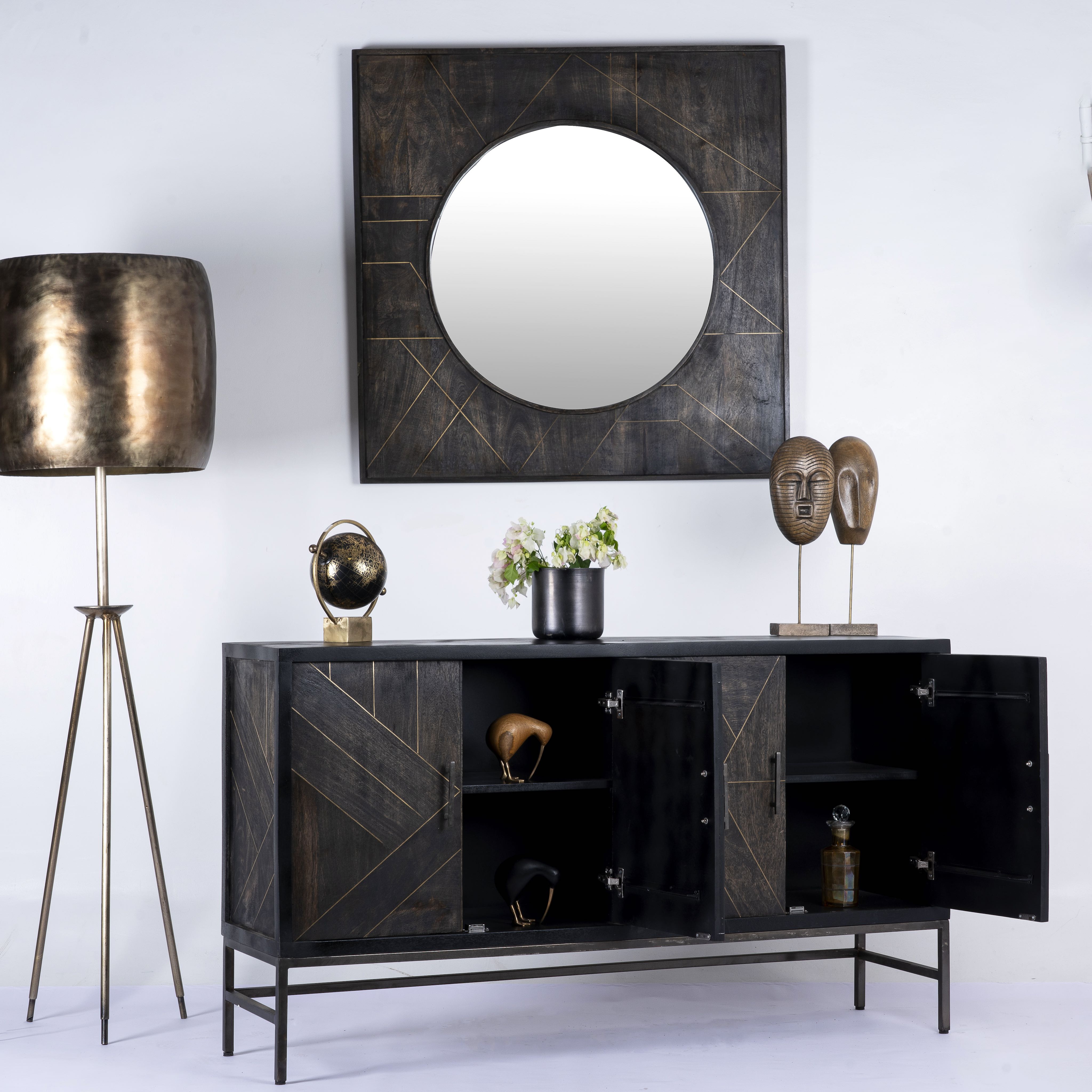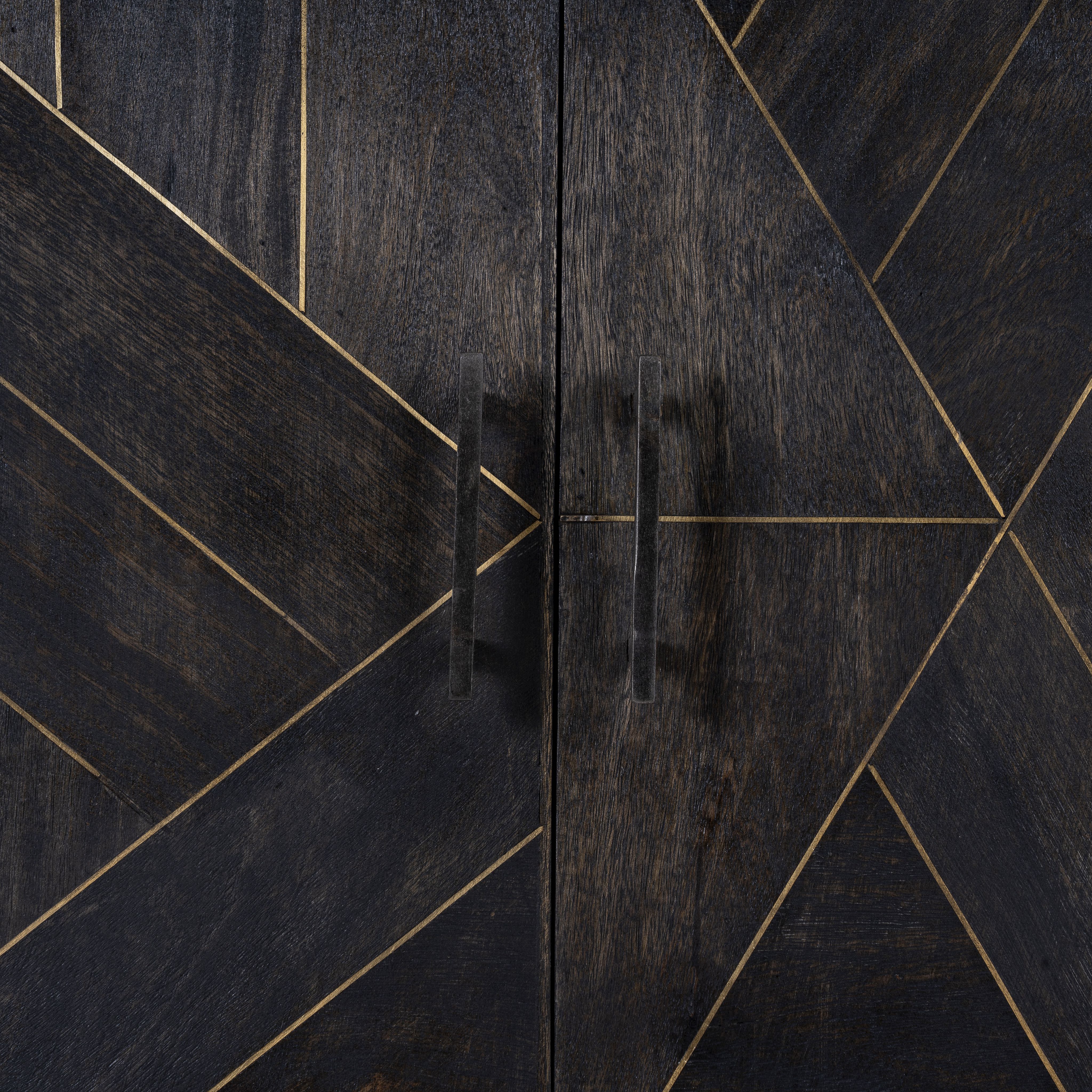 This elegant wooden cabinet with four doors truly makes a statement. The meticulously handcrafted copper inlays provide a striking contrast to the black finish. Supported by a gray and black nickel-plated metal stand, this piece exudes sophistication. Black furniture always leaves a lasting impression and serves as a standout focal point in modern interiors.