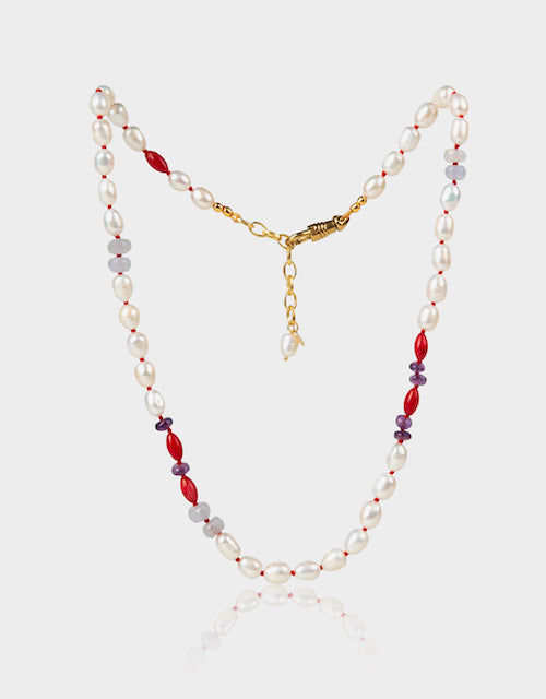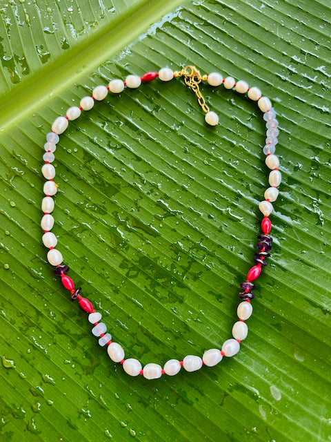 A modern and edgy combination of pearls, blue chalcedony, amethyst and red beads.