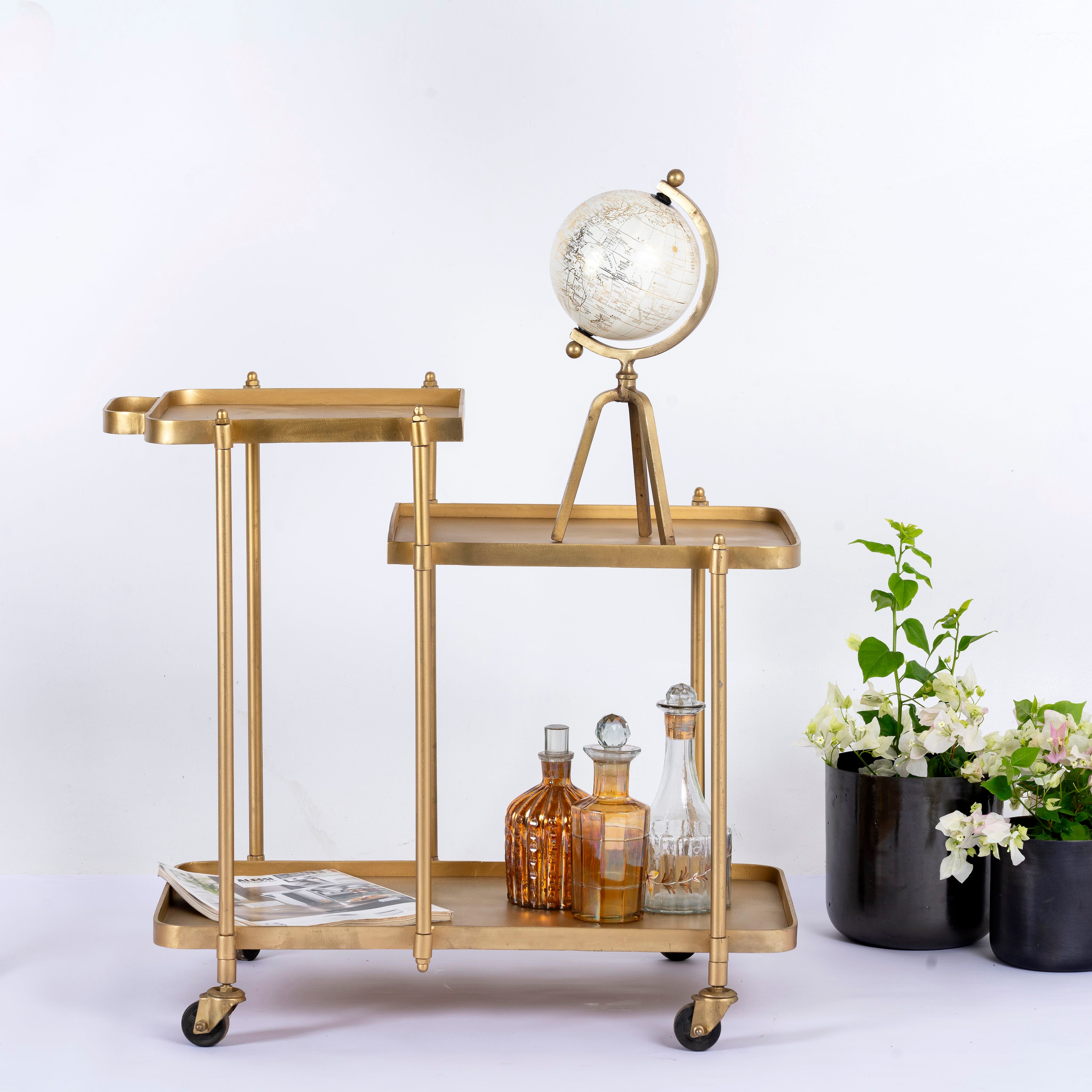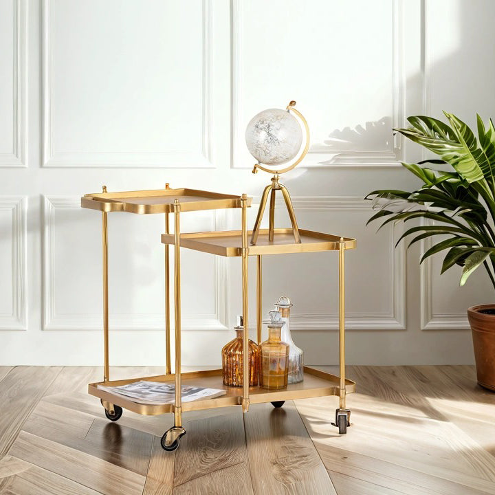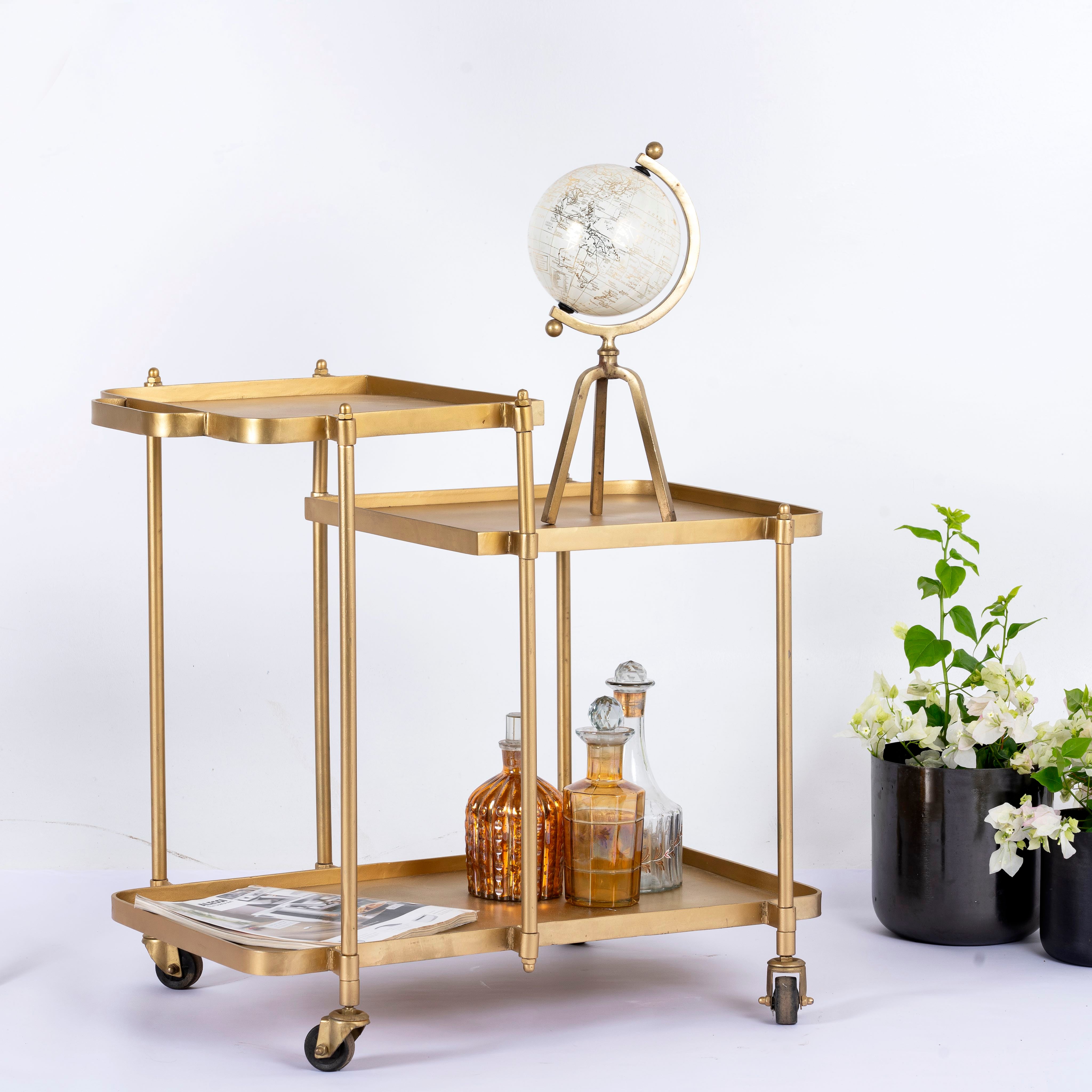 The brass antique finish exudes a rich, vintage charm that adds a touch of luxury to any space. The sturdy frame and smooth-rolling wheels allow for easy movement, making it effortless to serve guests or transport drinks from room to room.