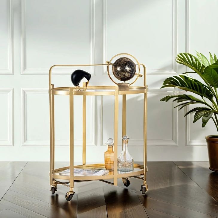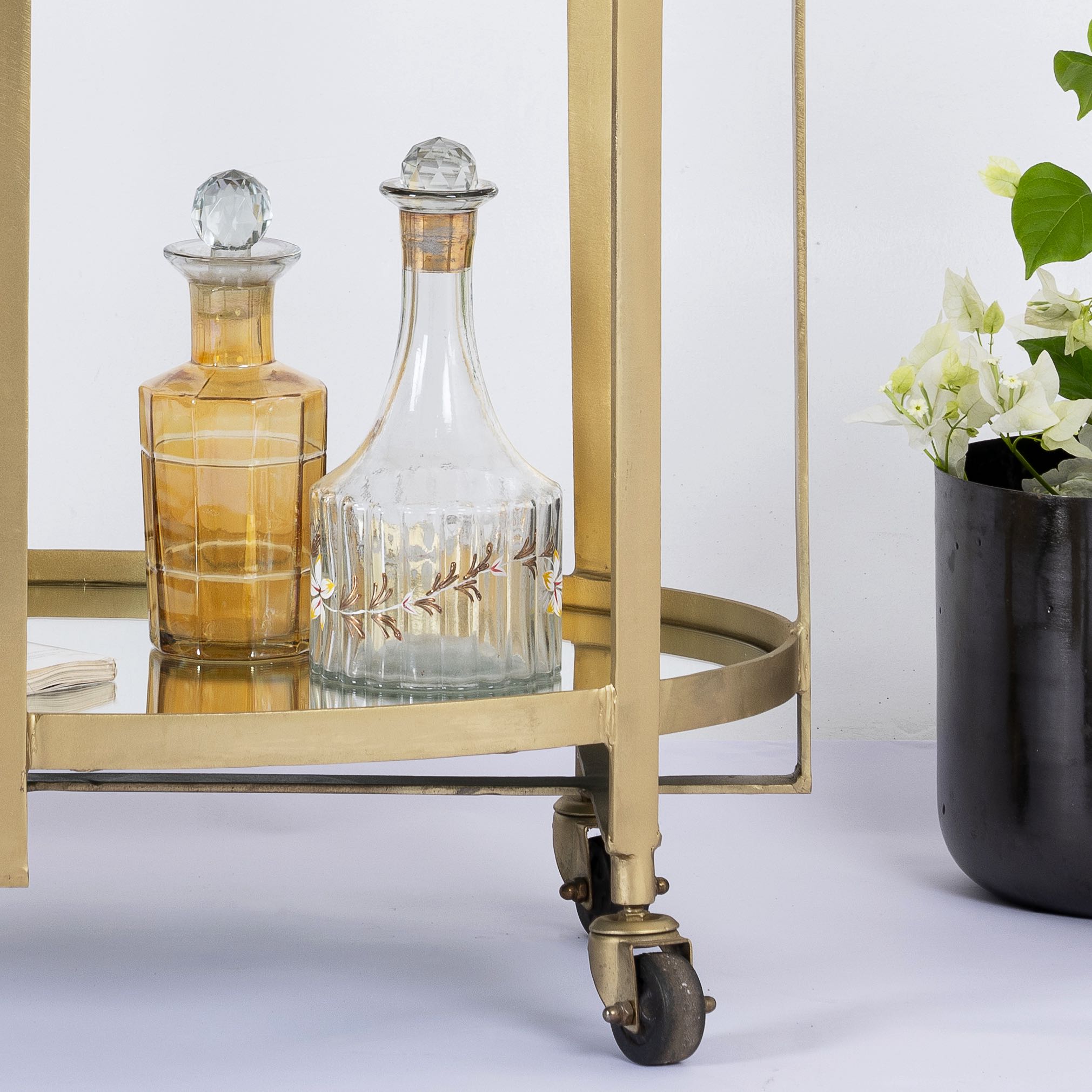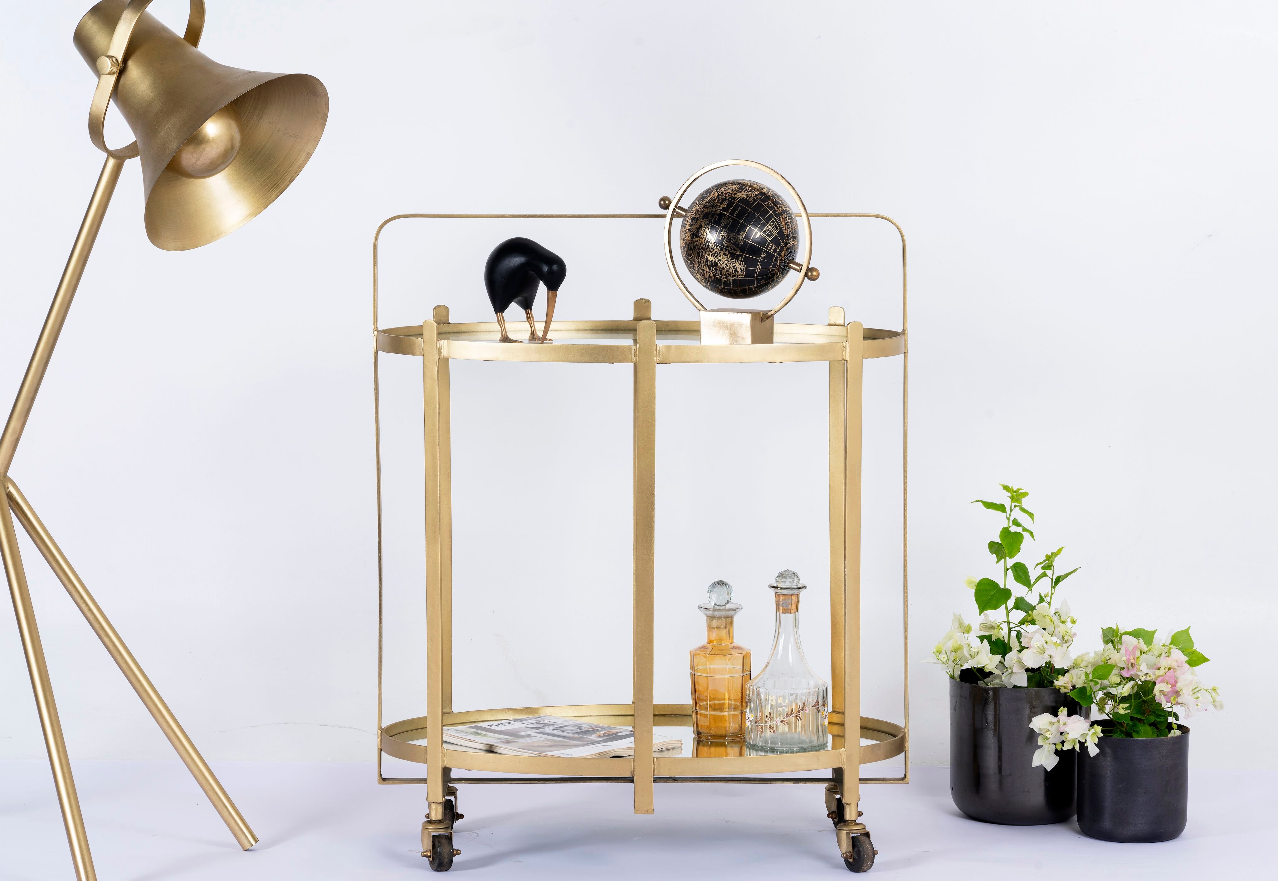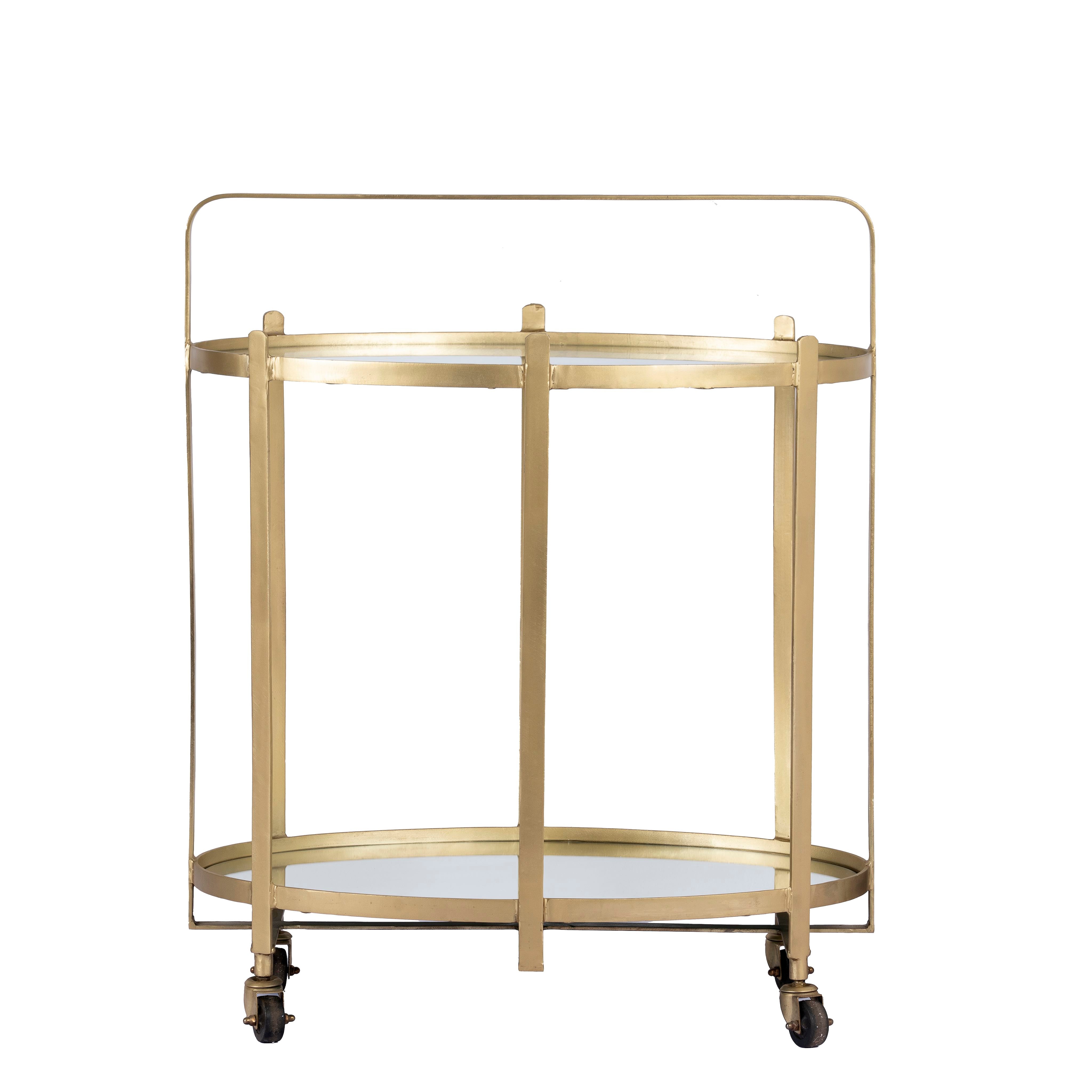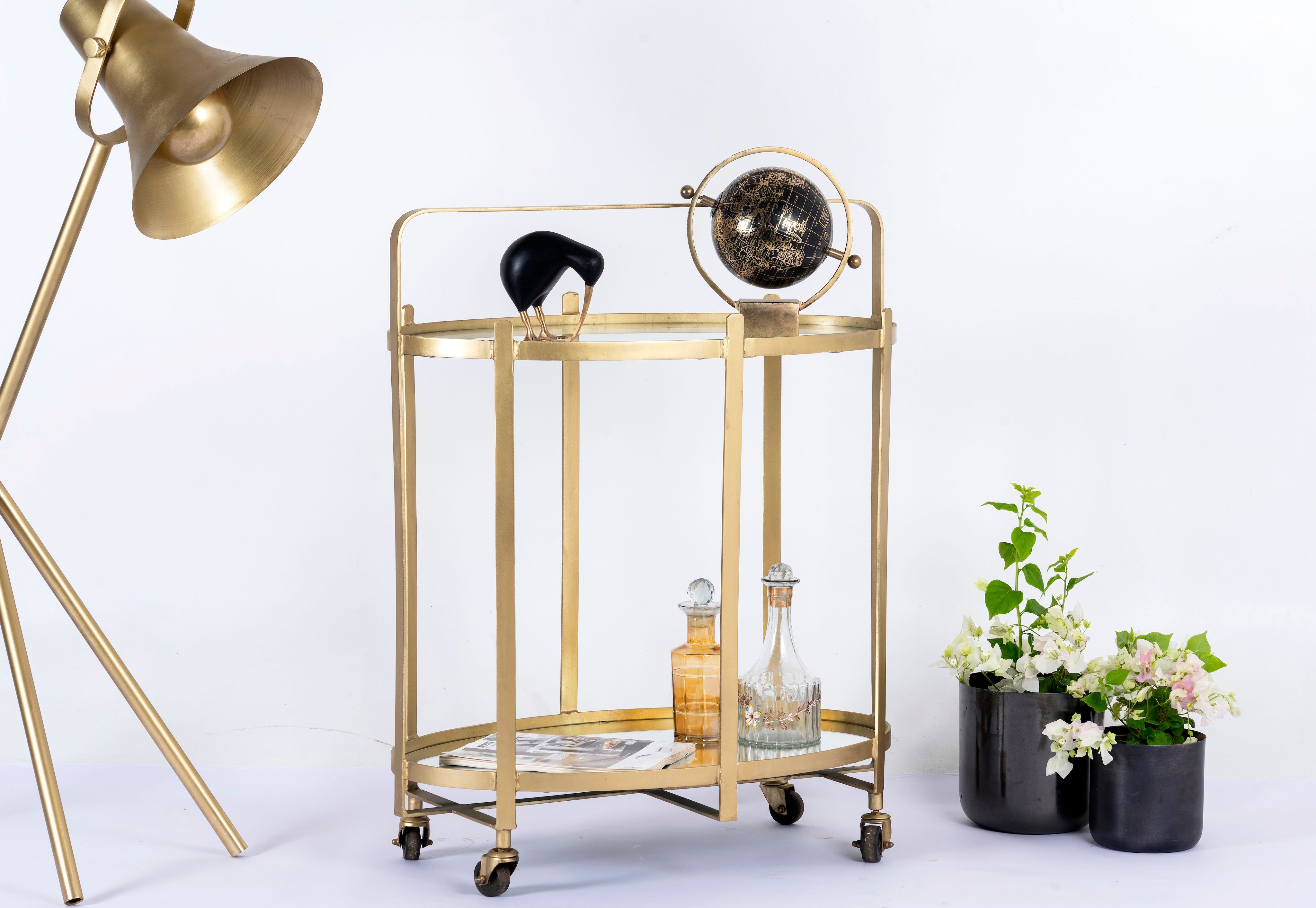 Discover our unique oval serving trolley Ameya with a brass-coated iron and glass frame and mirror surfaces. This elegant bar cart perfectly combines functionality and aesthetics to enrich your space.