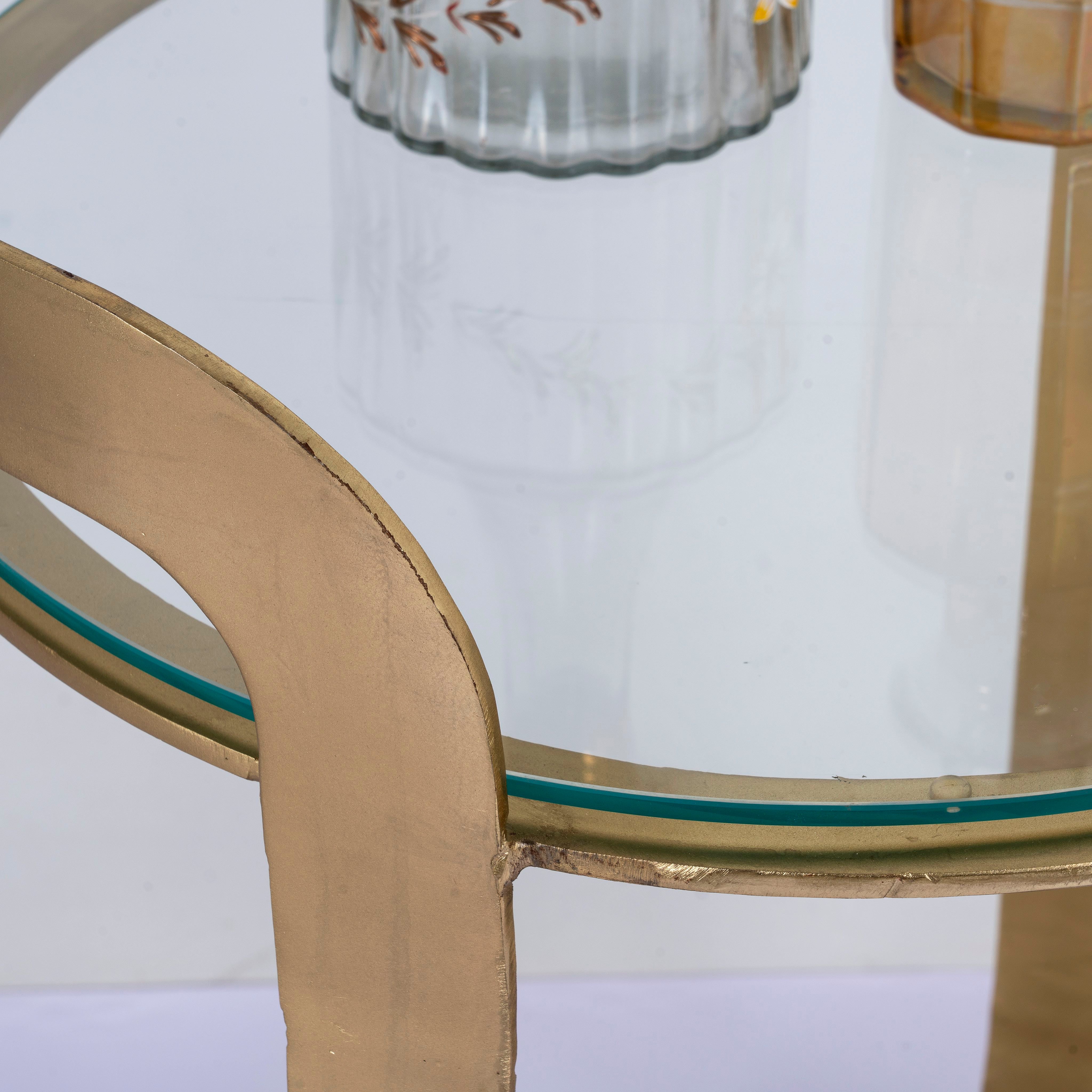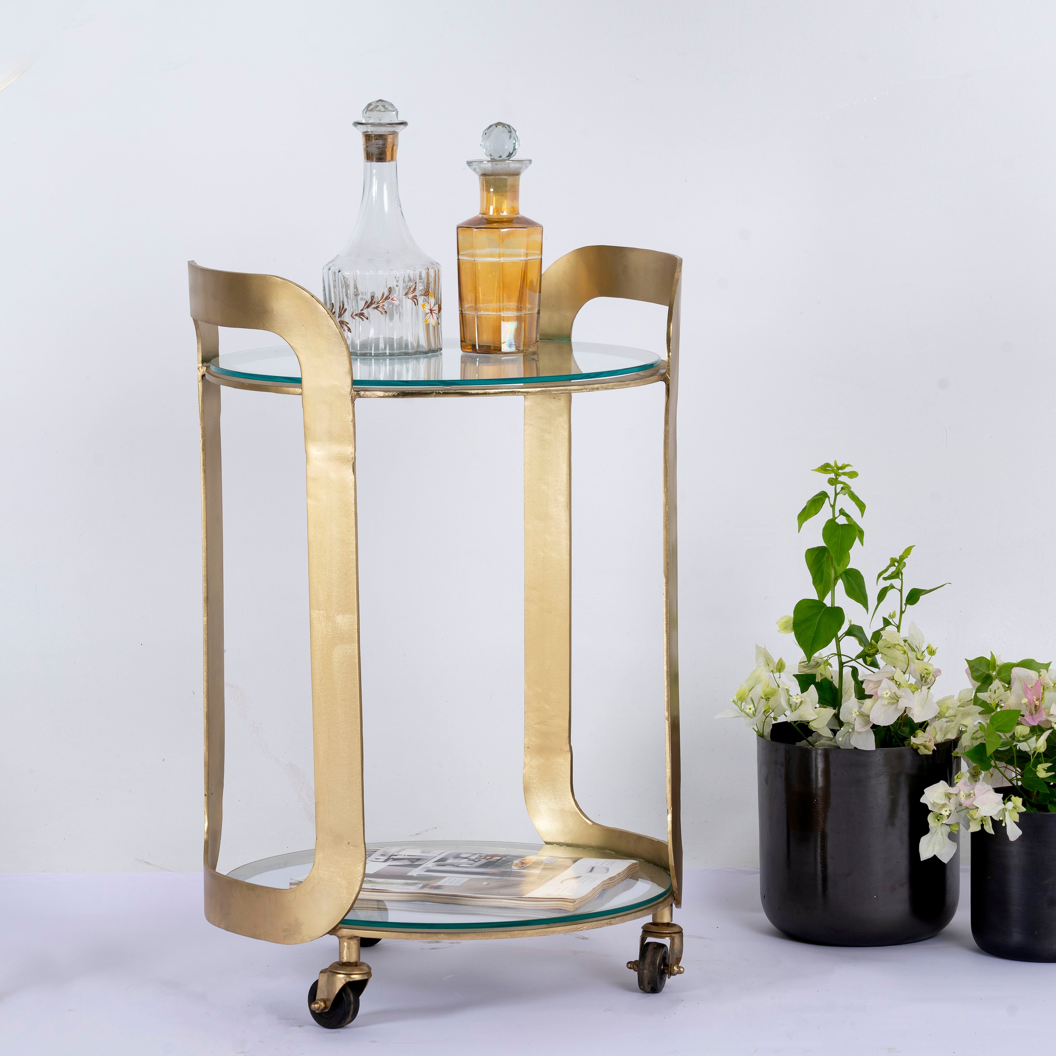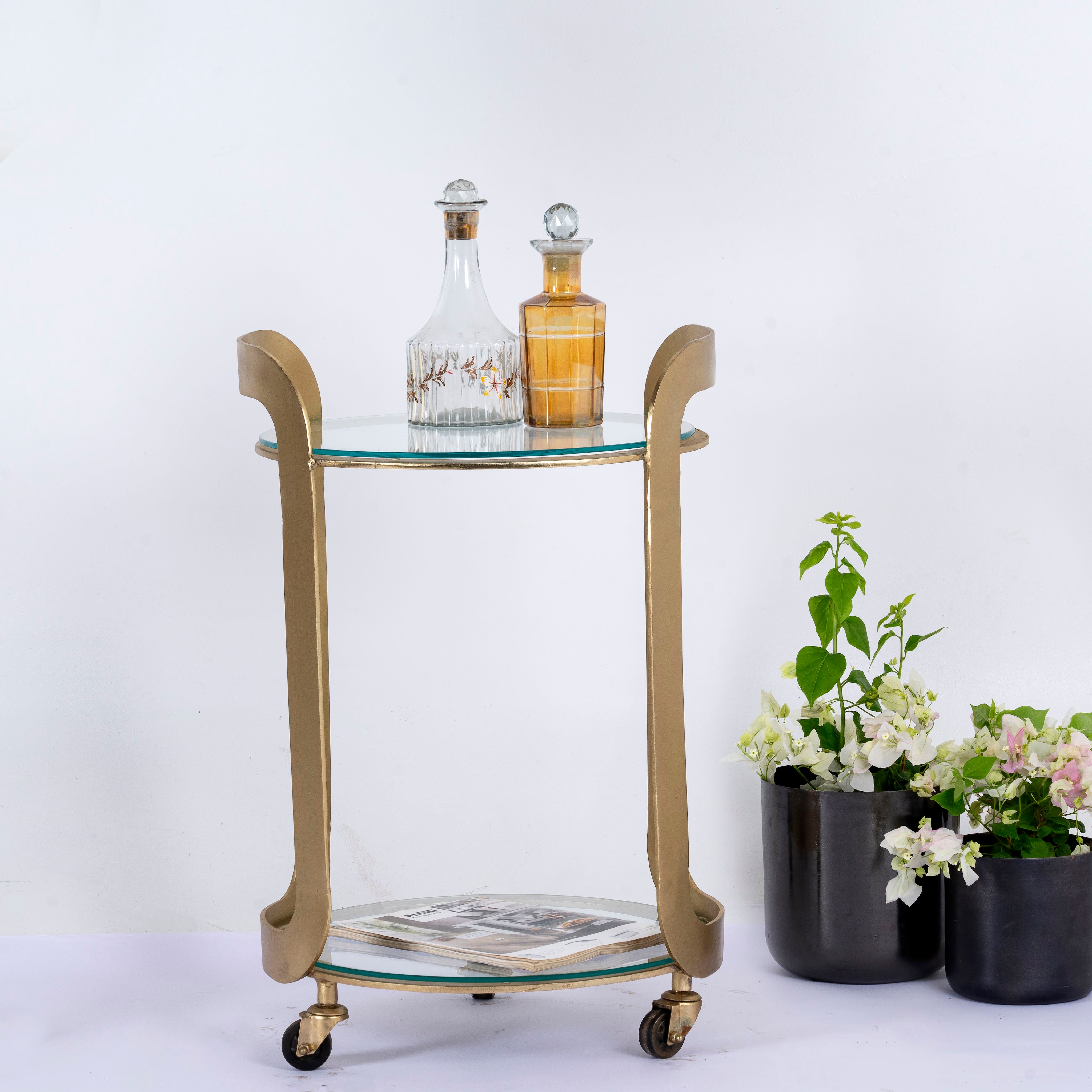 Discover the unique serving trolley Sheyla with a frame made of brass-coated iron and glass surfaces. This elegant bar cart perfectly combines functionality and aesthetics to enrich your space.