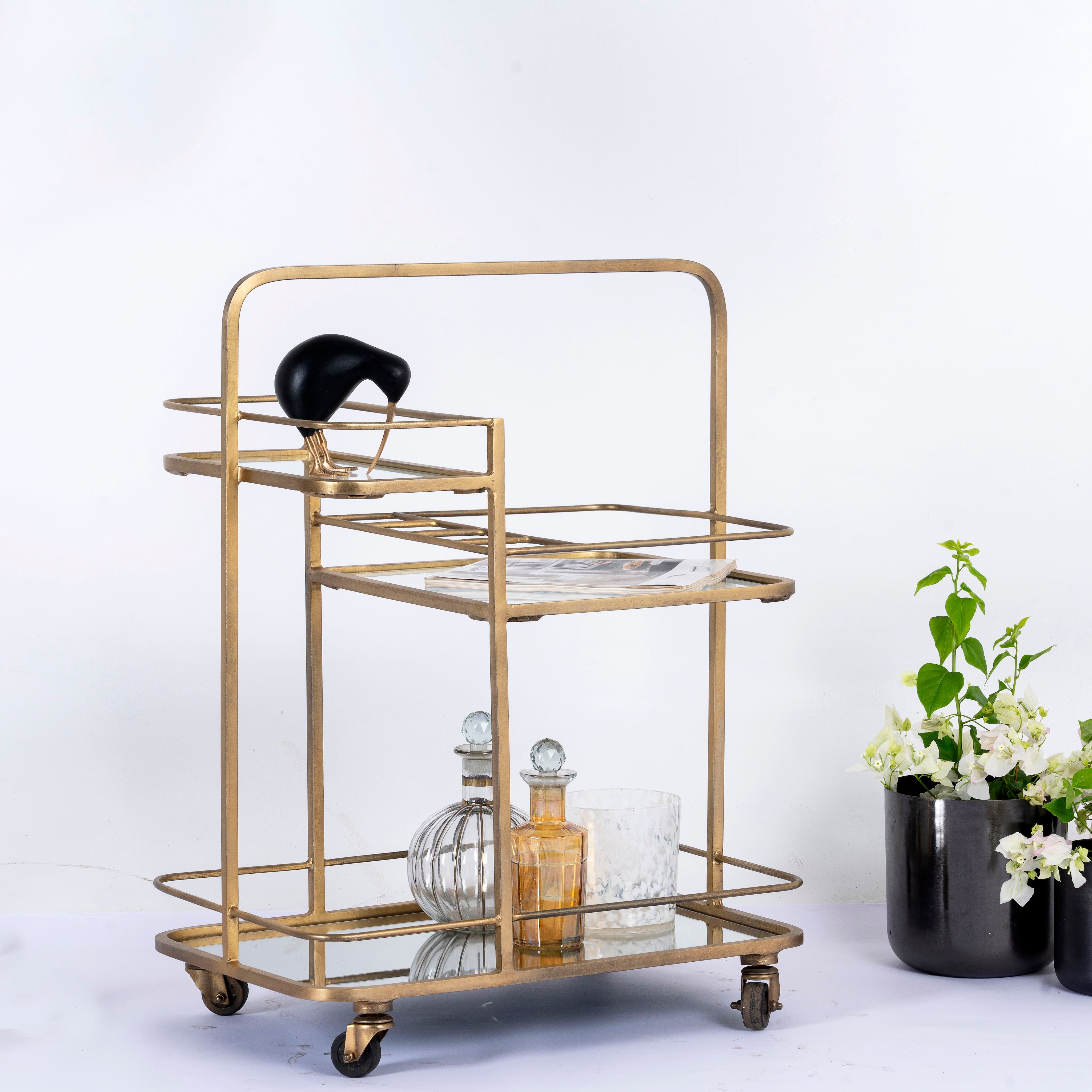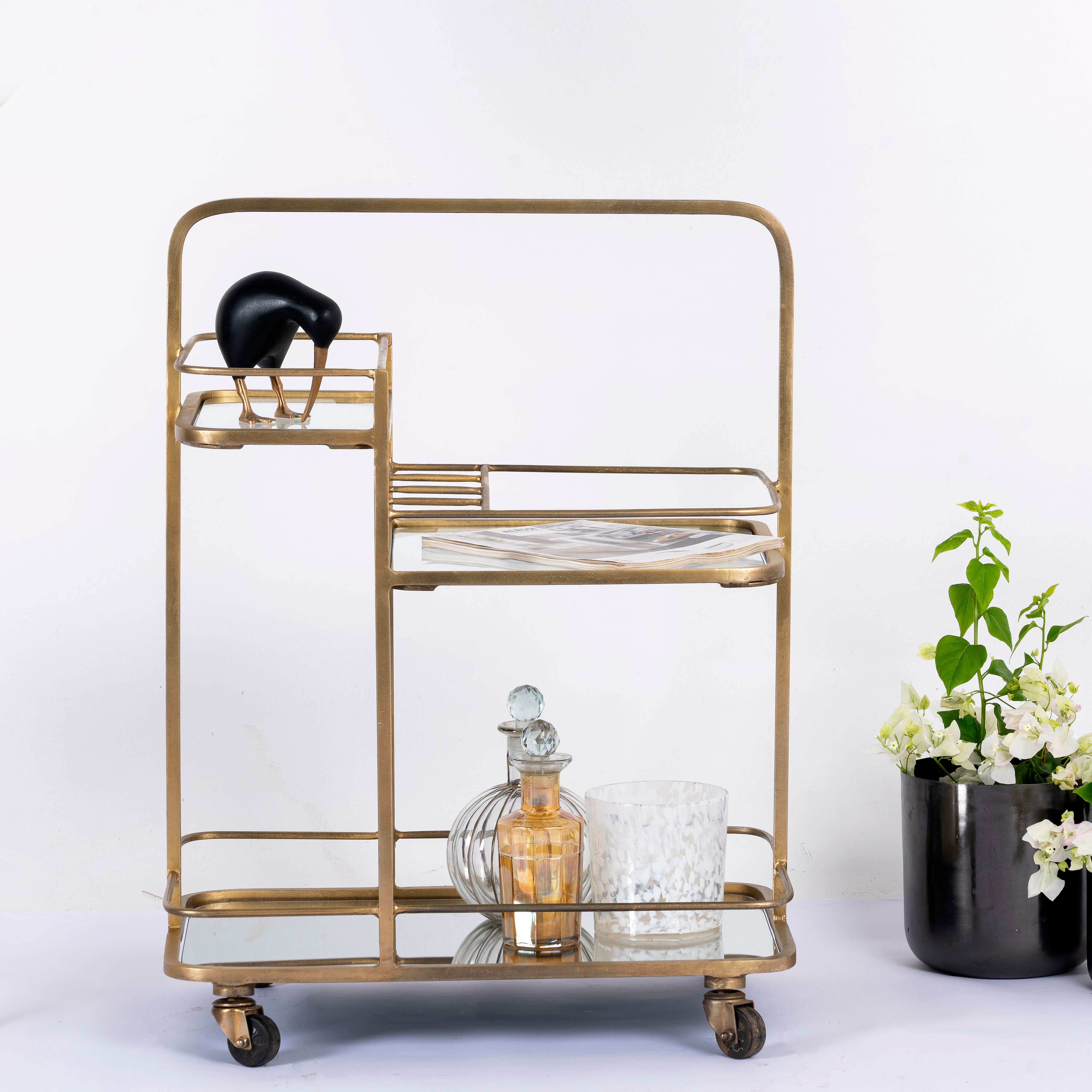 Discover the unique serving trolley Tarun with a frame made of brass-coated iron and glass and mirror surfaces. This elegant bar cart perfectly combines functionality and aesthetics to enrich your space.