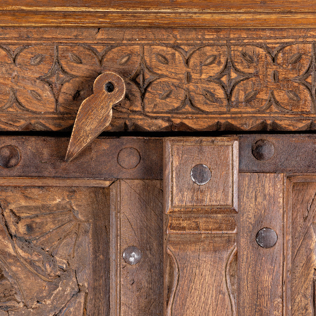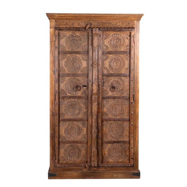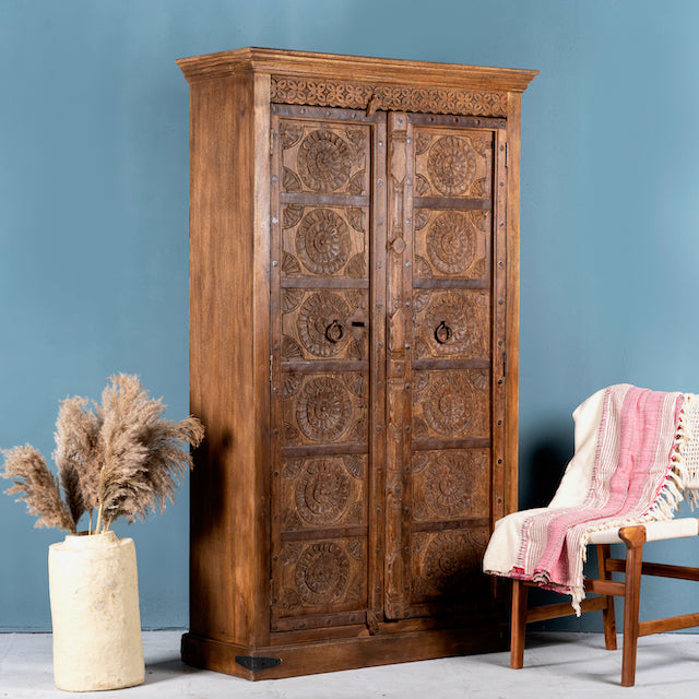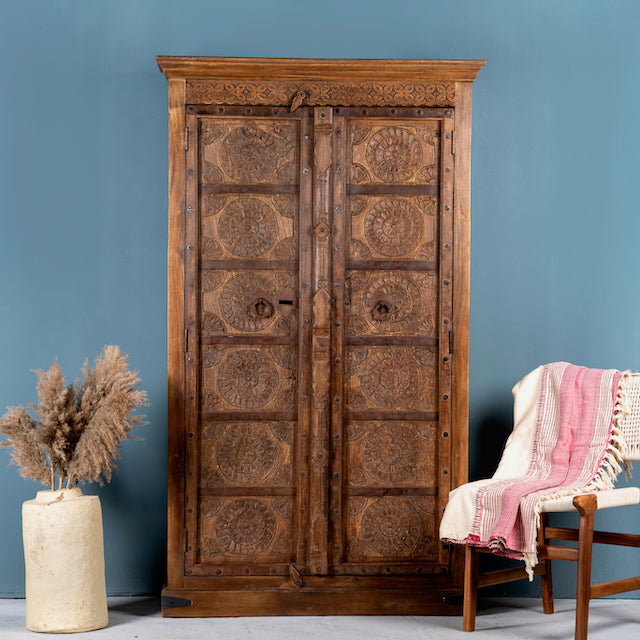 Experience the timeless beauty and exquisite charm of our Indian cabinet Kangra crafted from old, recycled teak doors. Each door tells its own story, generously adorned with intricately hand-carved floral patterns that reflect a rich cultural tradition.