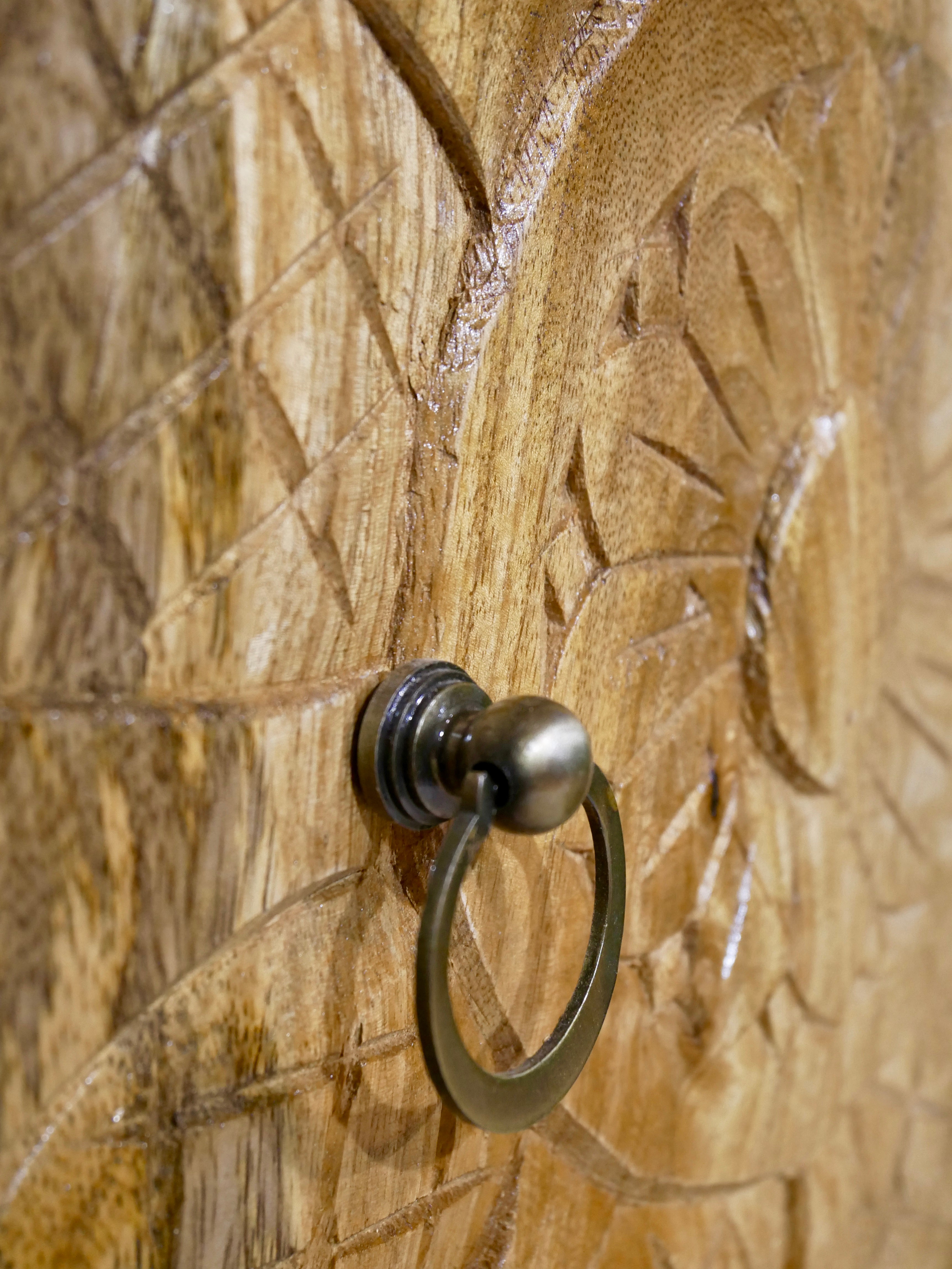 Beautifully handcrafted from solid mango wood, this cabinet showcases the durability and unique grain variation that define high-quality mango wood furniture. Its double doors are richly adorned with hand-carved floral motifs, each pattern uniquely shaped by skilled artisans to create a one-of-a-kind look that radiates personality.