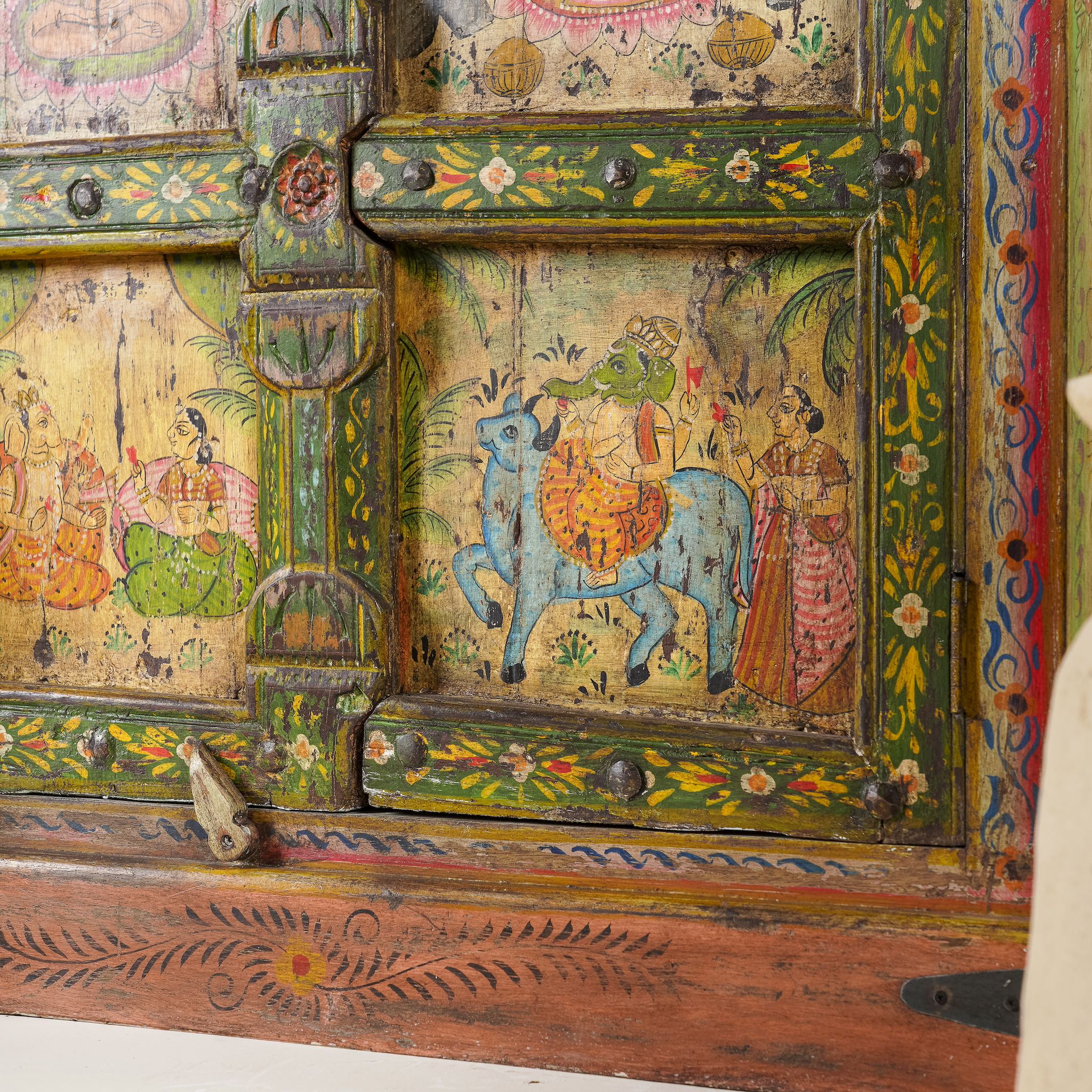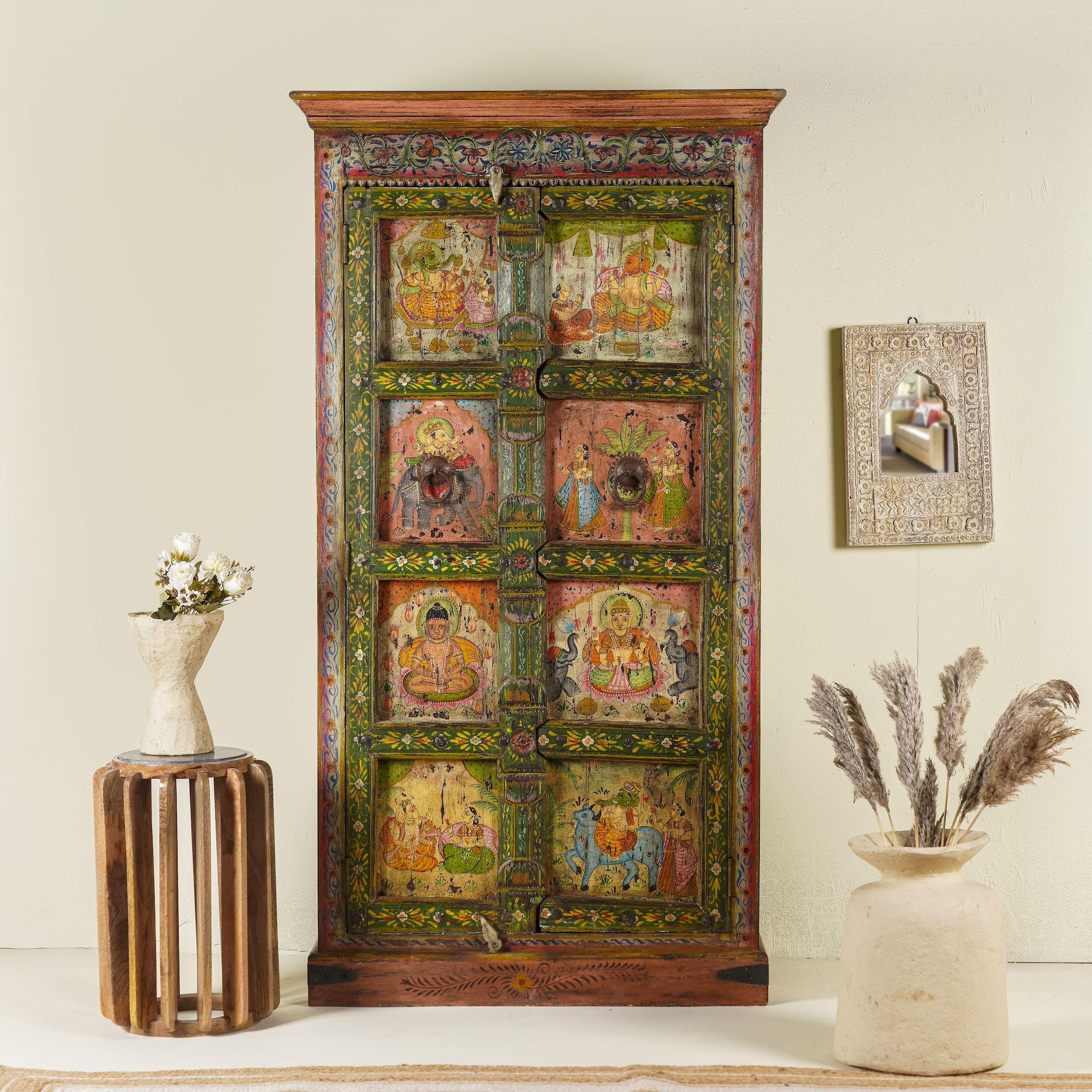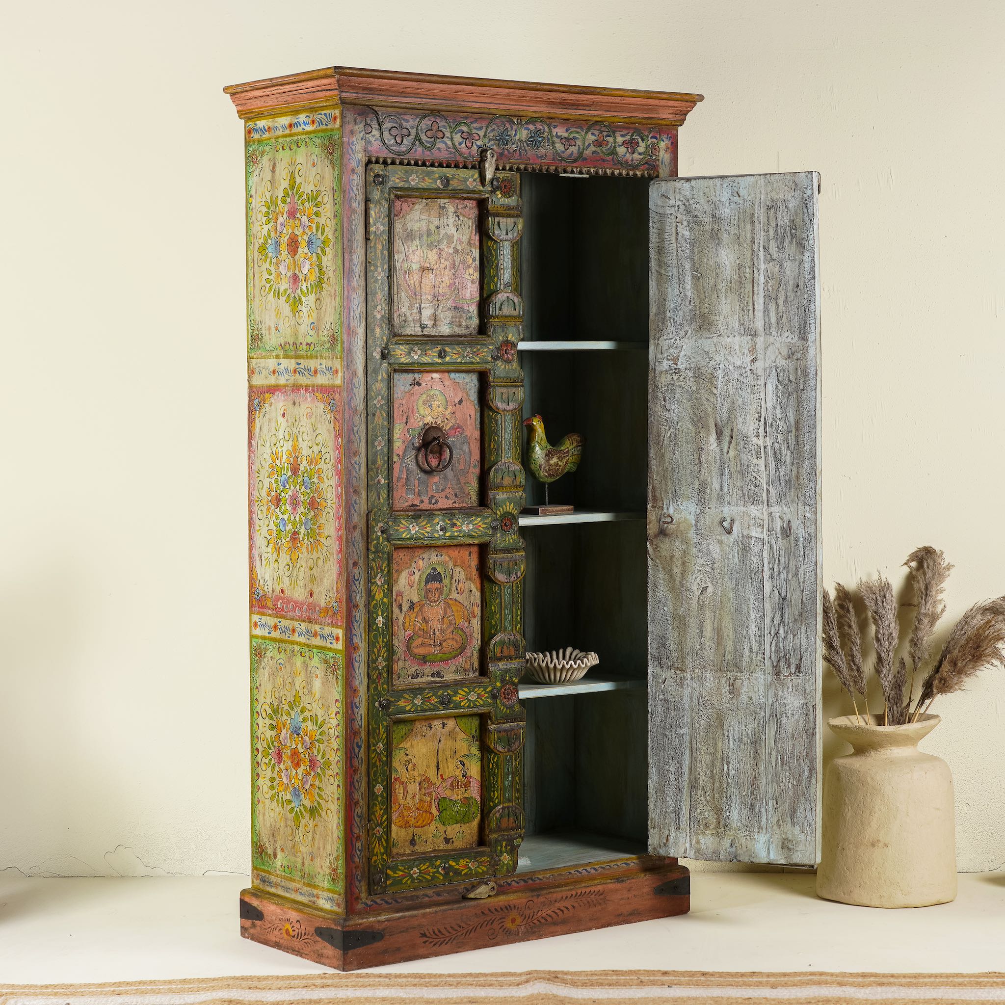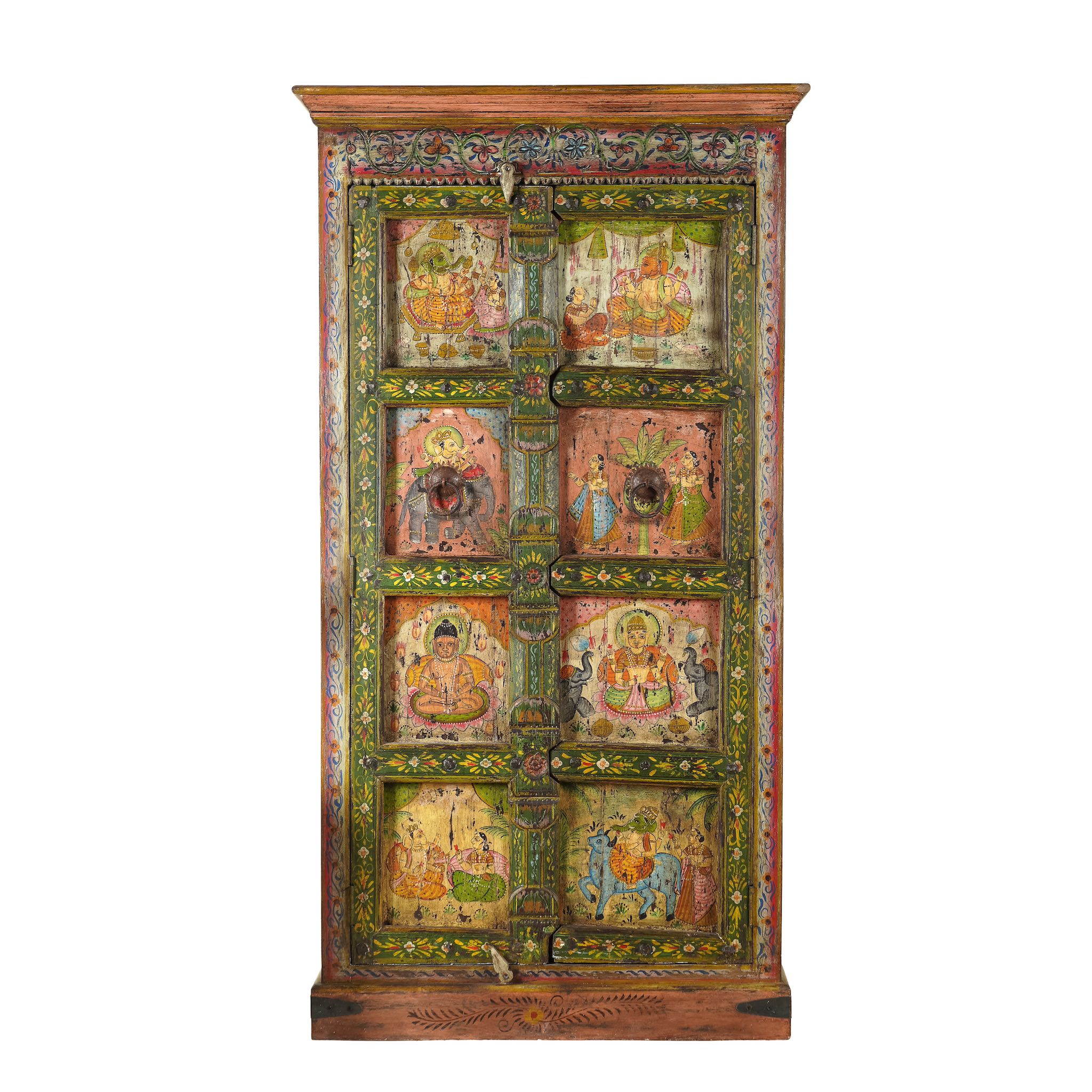 Introduce a piece of history into your home with this antique refurbished teak wood cabinet. Lovingly restored and finely hand-painted, it showcases intricate artwork that exudes vintage charm and timeless elegance.