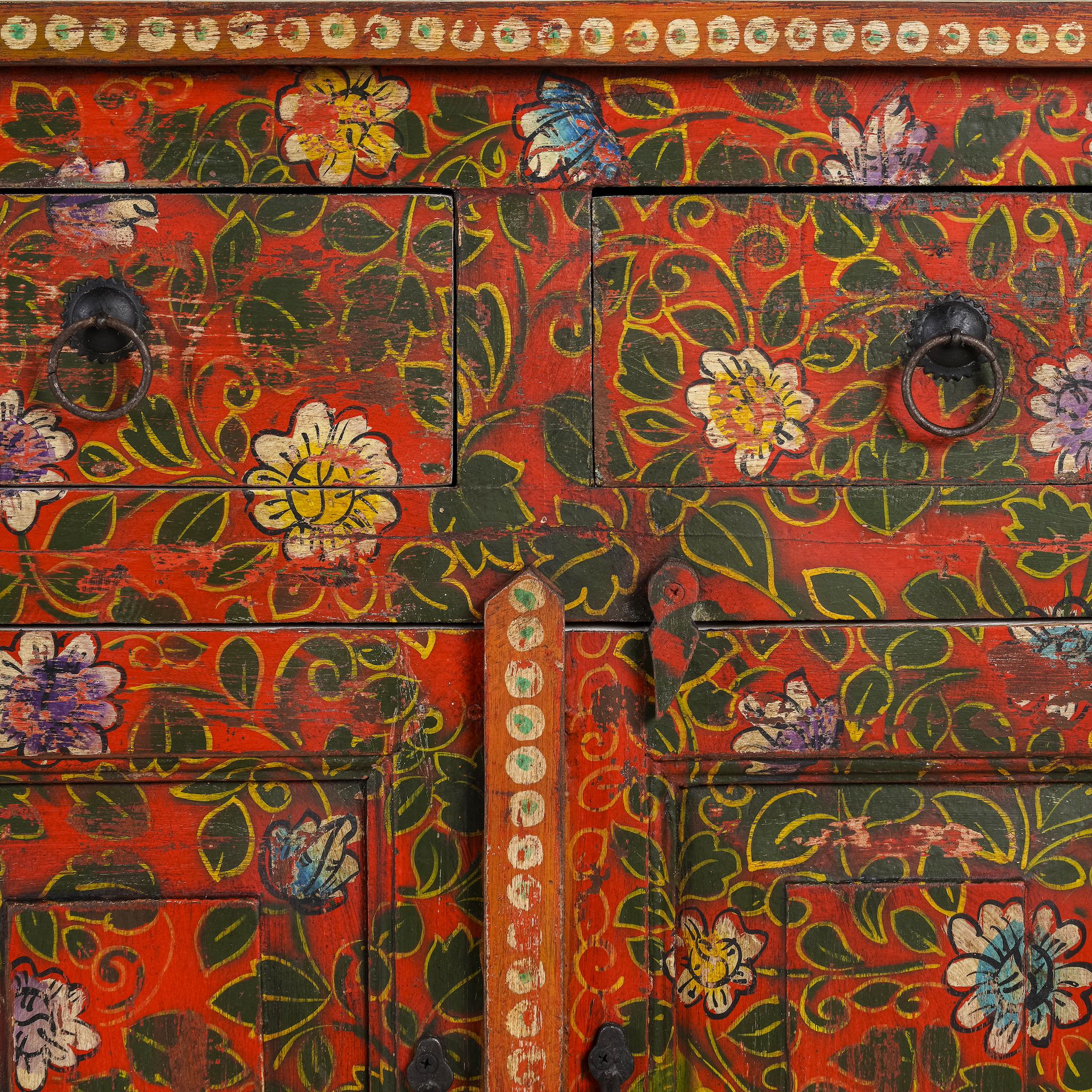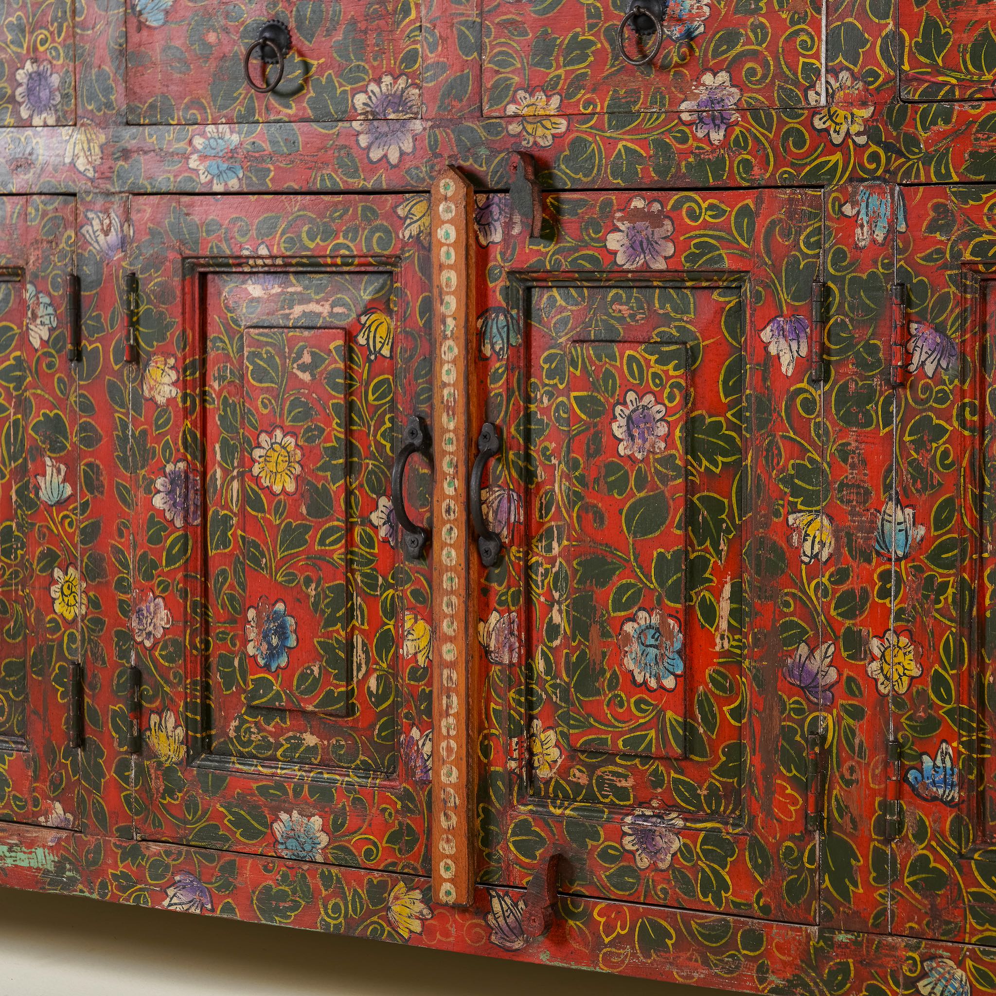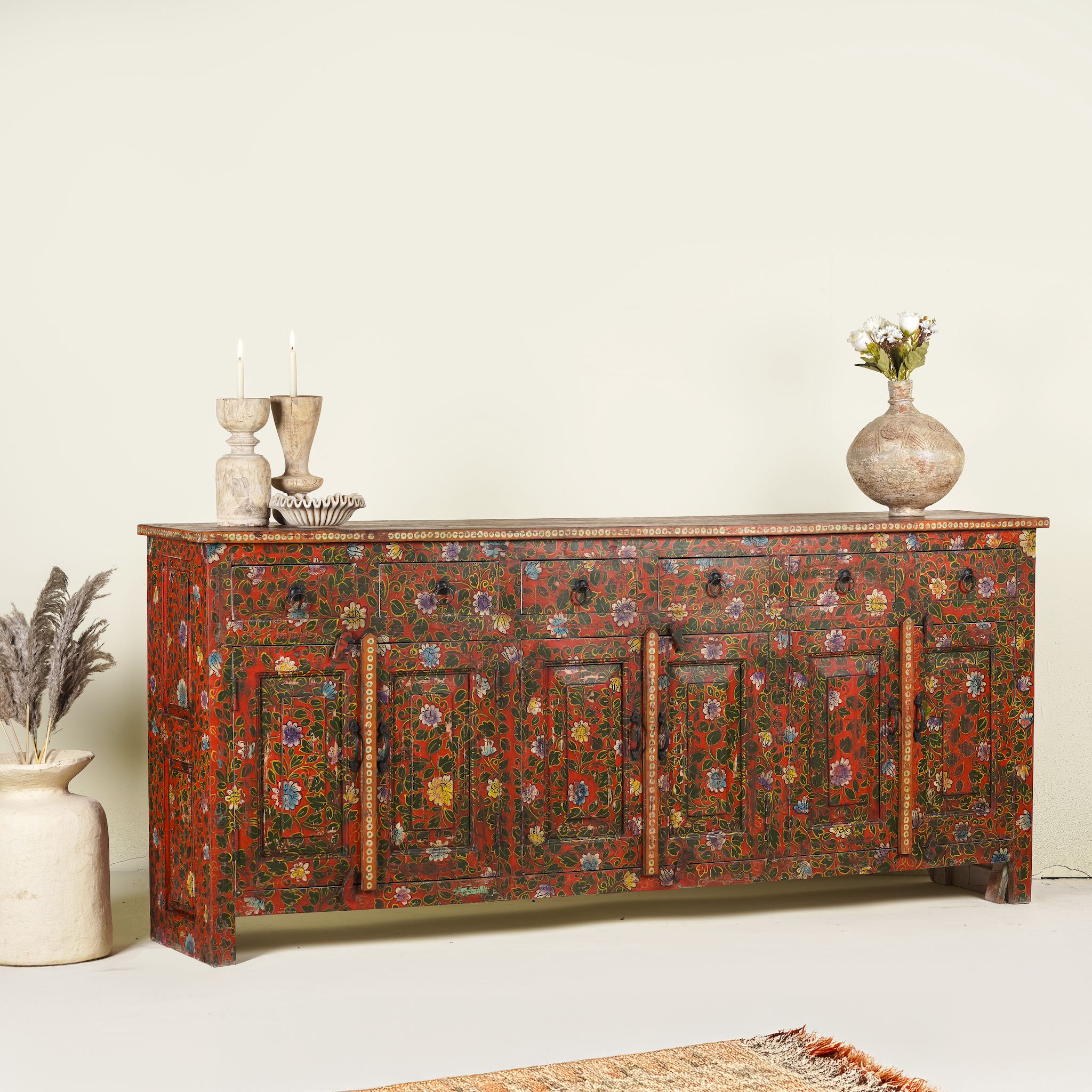Make a bold statement with this exquisite hand-painted sideboard crafted from reclaimed wood. Adorned with intricate floral designs, this unique piece brings an explosion of color and artistry to your interior while highlighting sustainable craftsmanship.