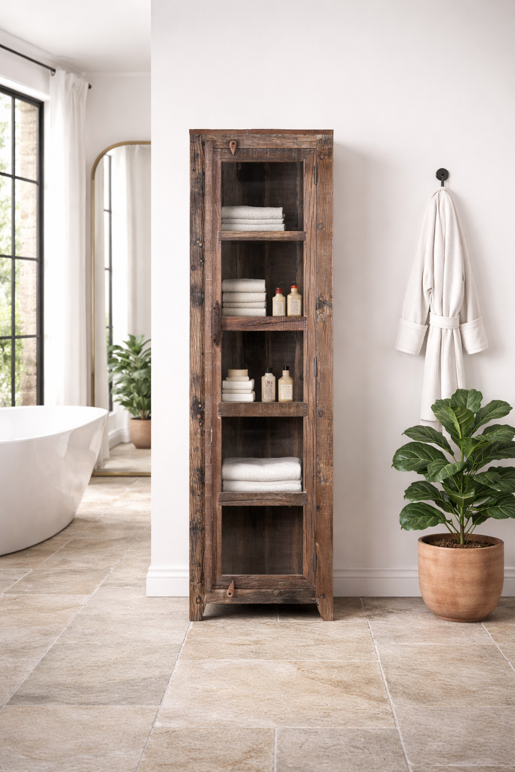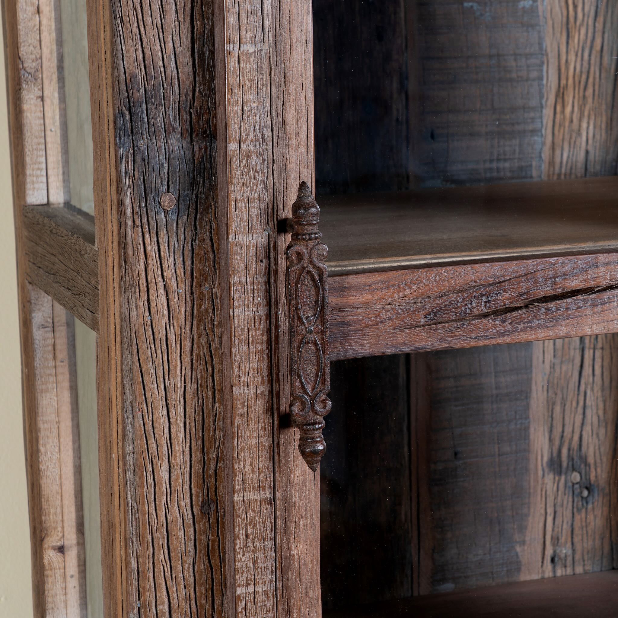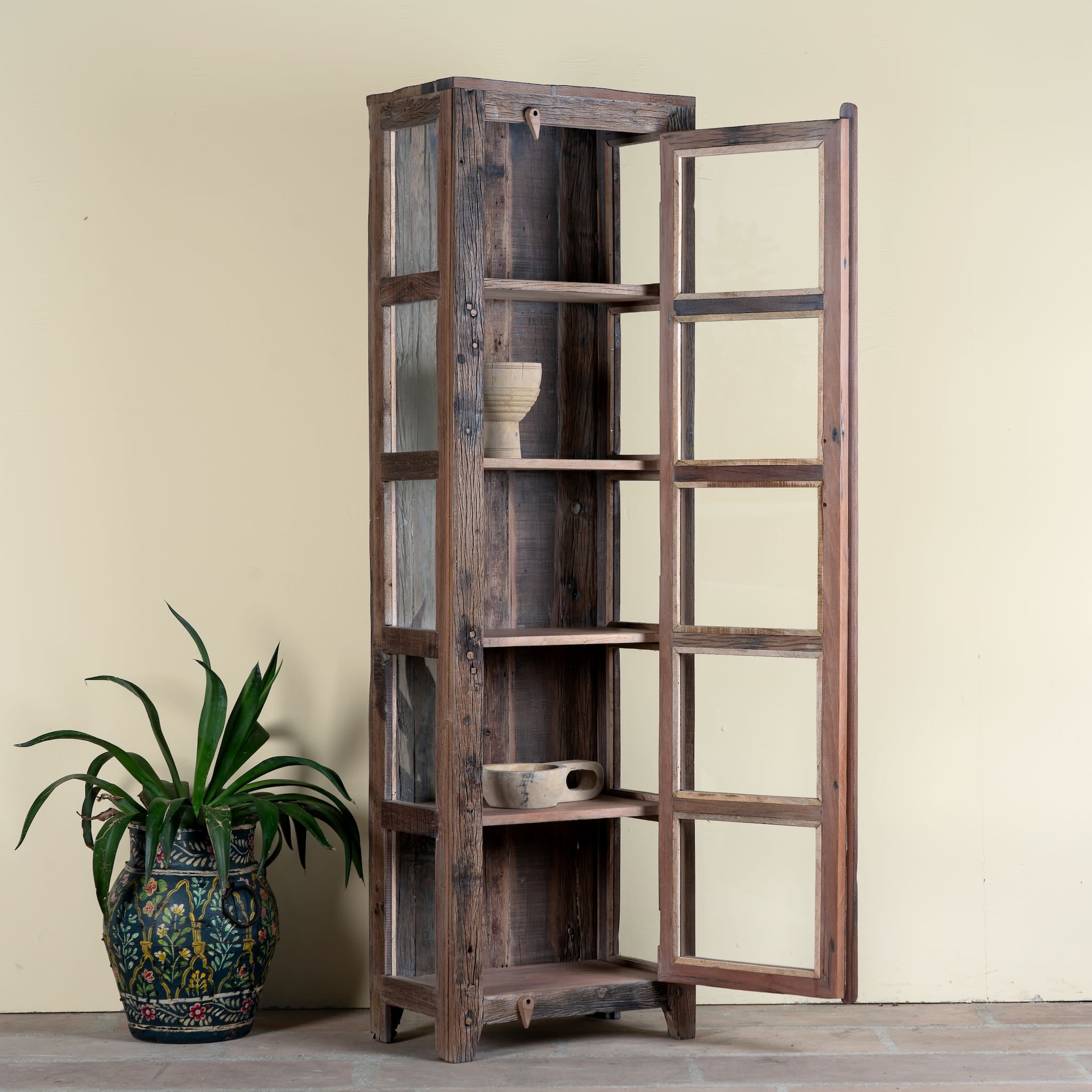 Its clean-lined frame highlights the natural grain and aged patina of reclaimed timber, while the glass-paneled door offers a subtle display for books, ceramics, or keepsakes. Ayona’s simplicity allows the unique textures of the wood to shine through, making it a versatile addition to both modern and traditional living spaces.
