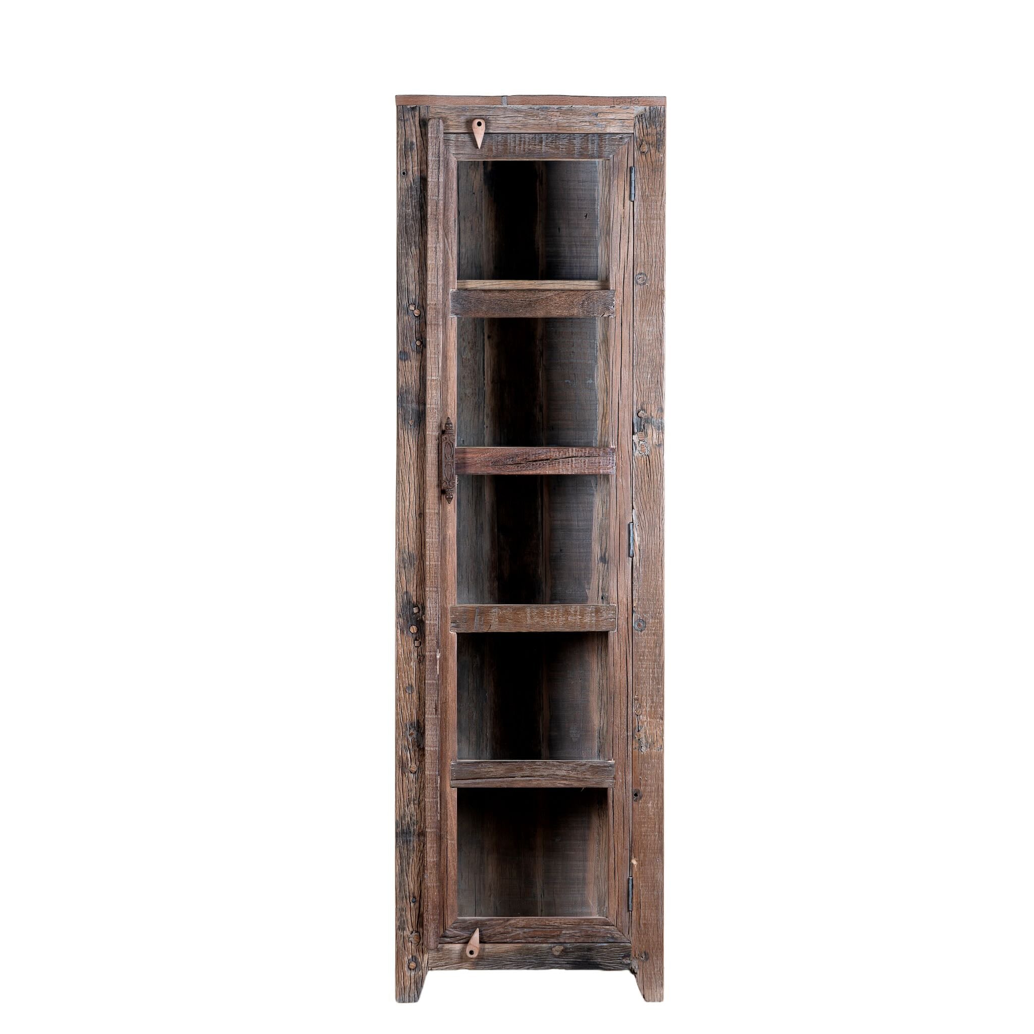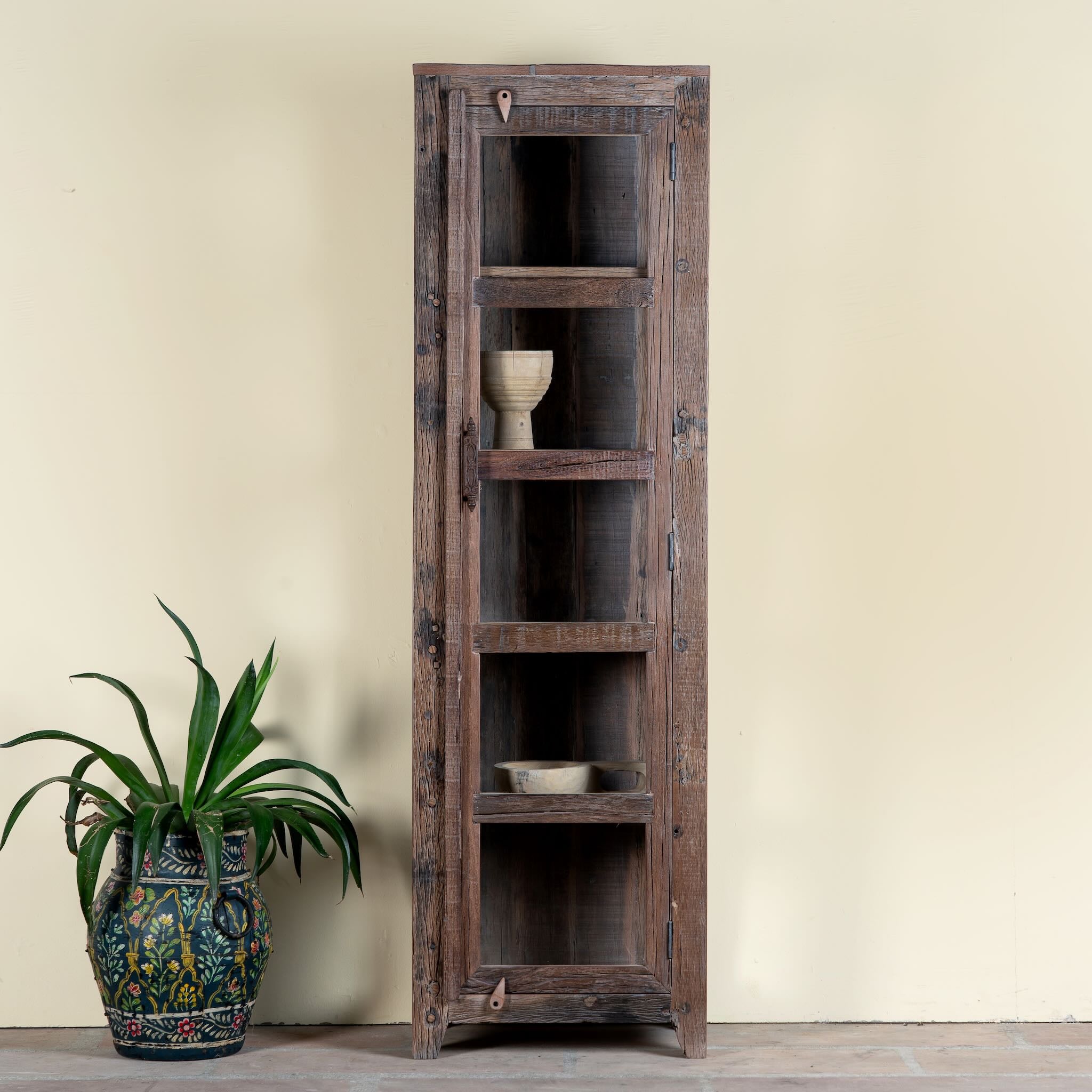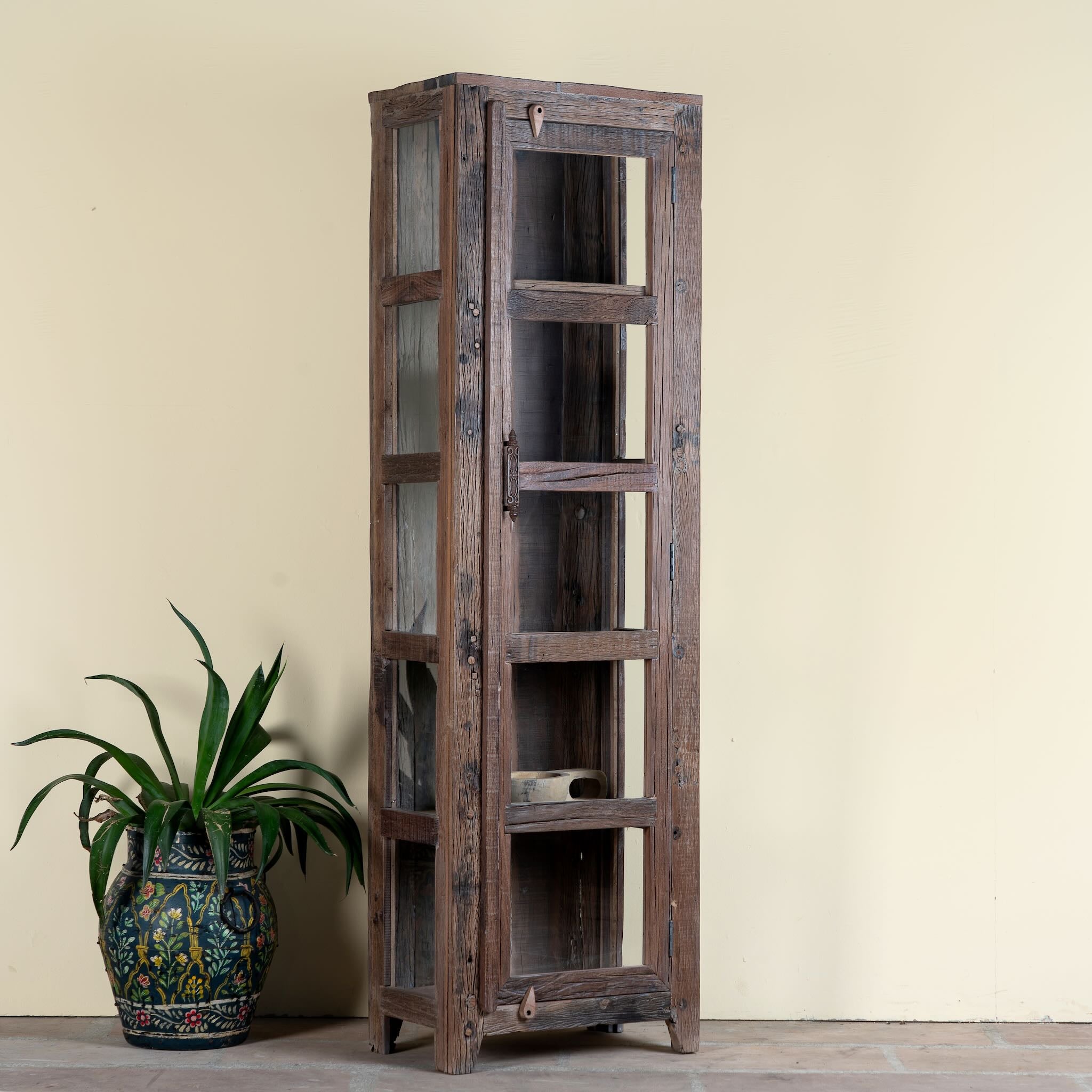 Its clean-lined frame highlights the natural grain and aged patina of reclaimed timber, while the glass-paneled door offers a subtle display for books, ceramics, or keepsakes. Ayona’s simplicity allows the unique textures of the wood to shine through, making it a versatile addition to both modern and traditional living spaces.