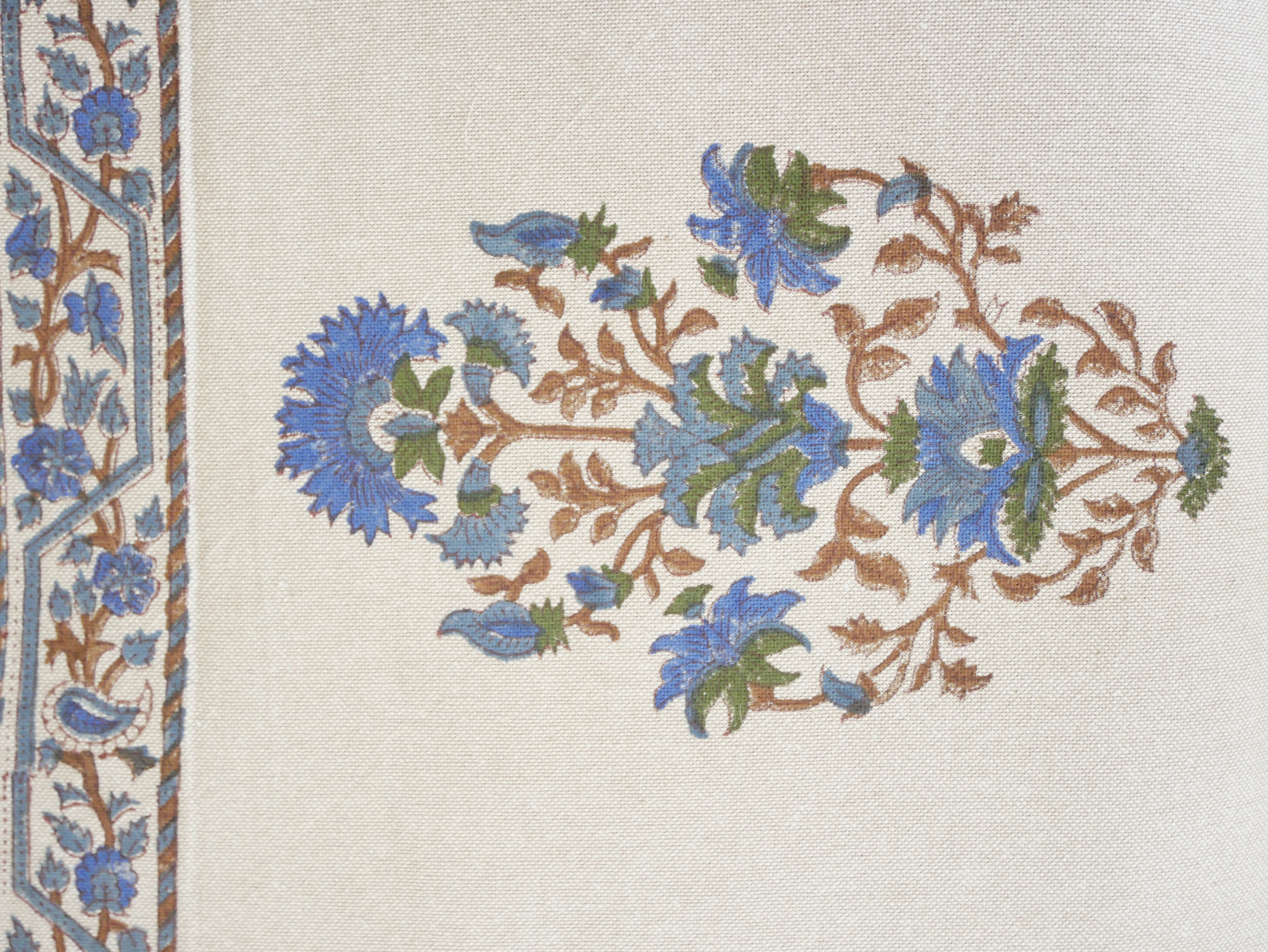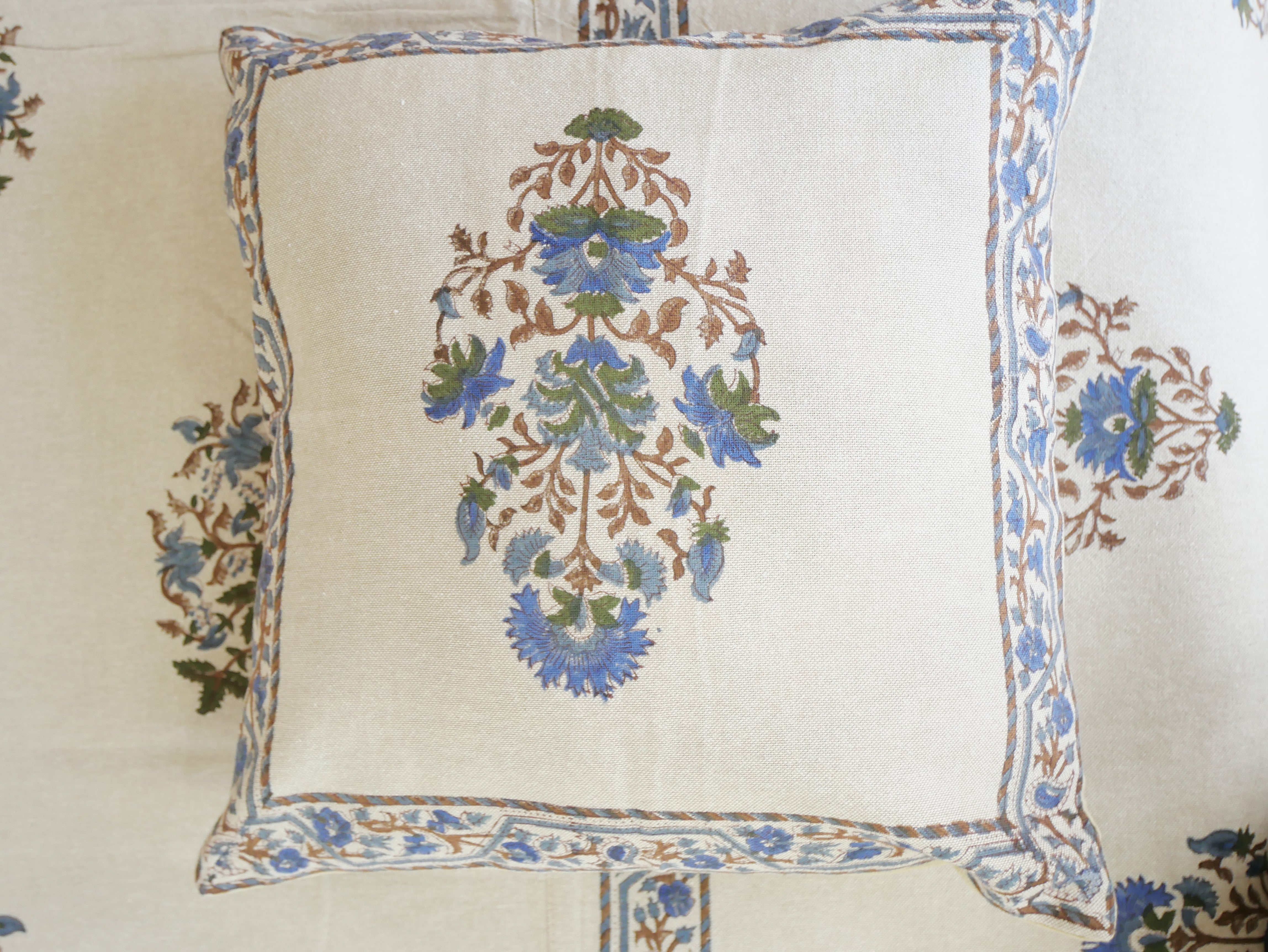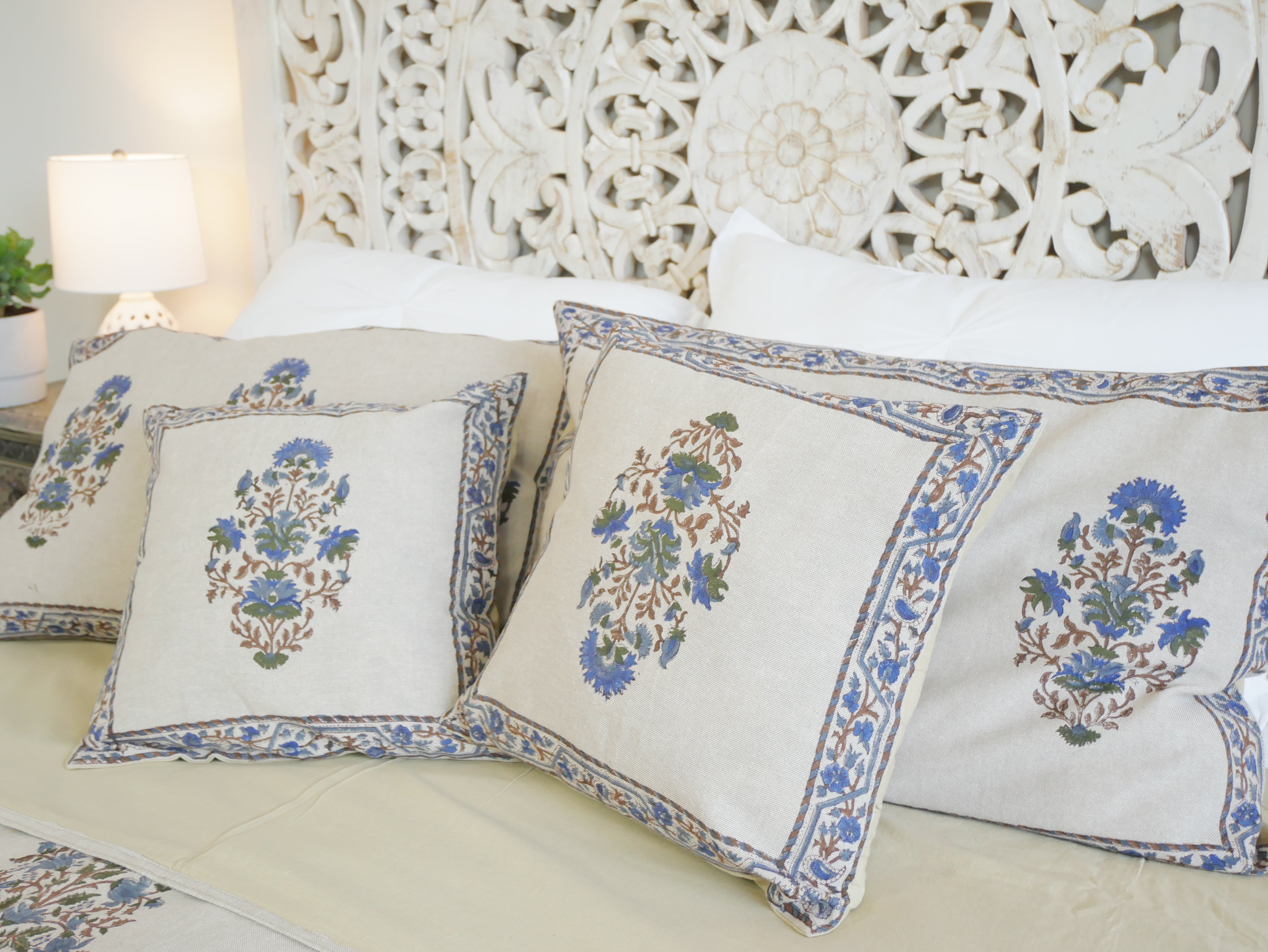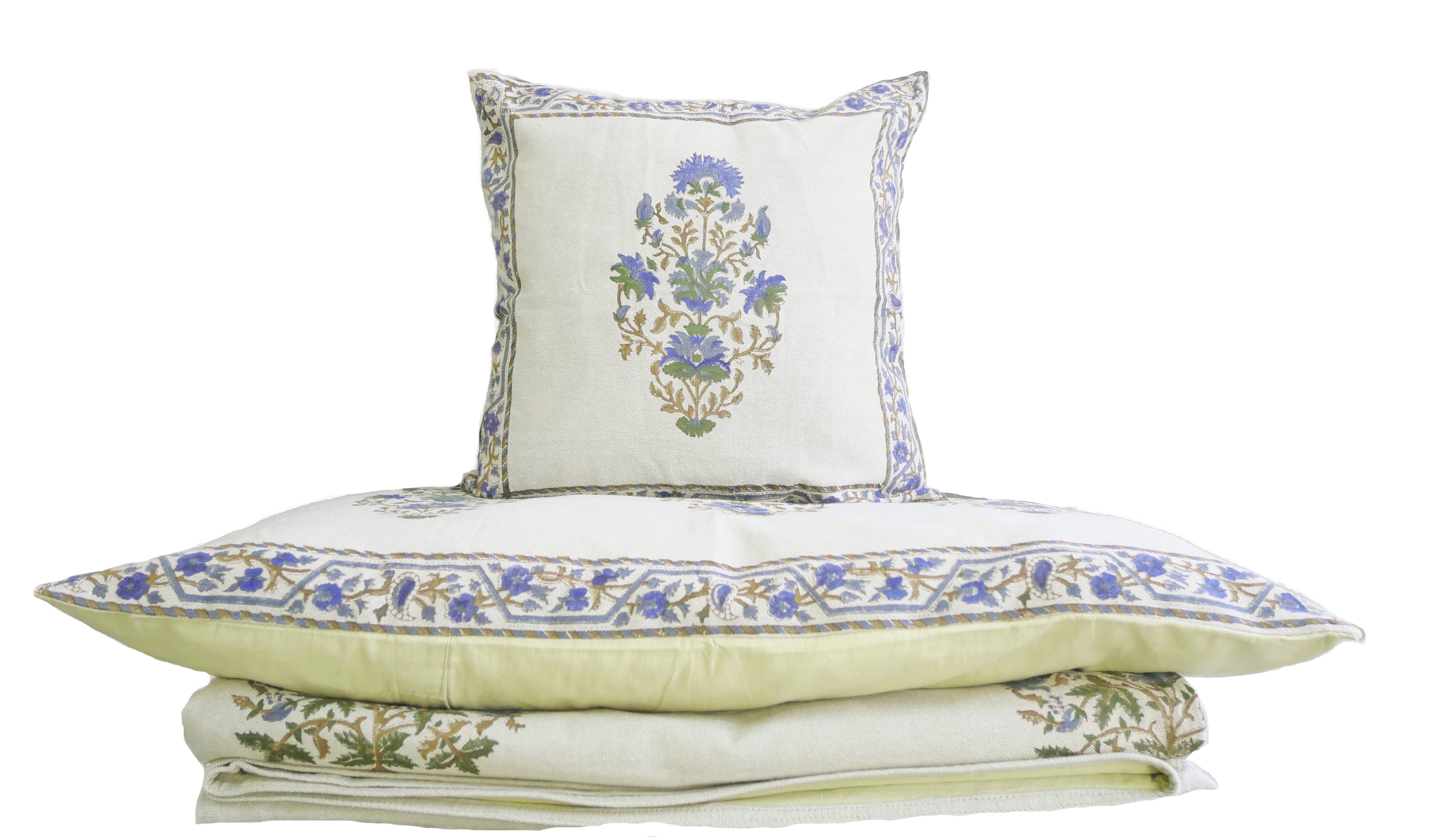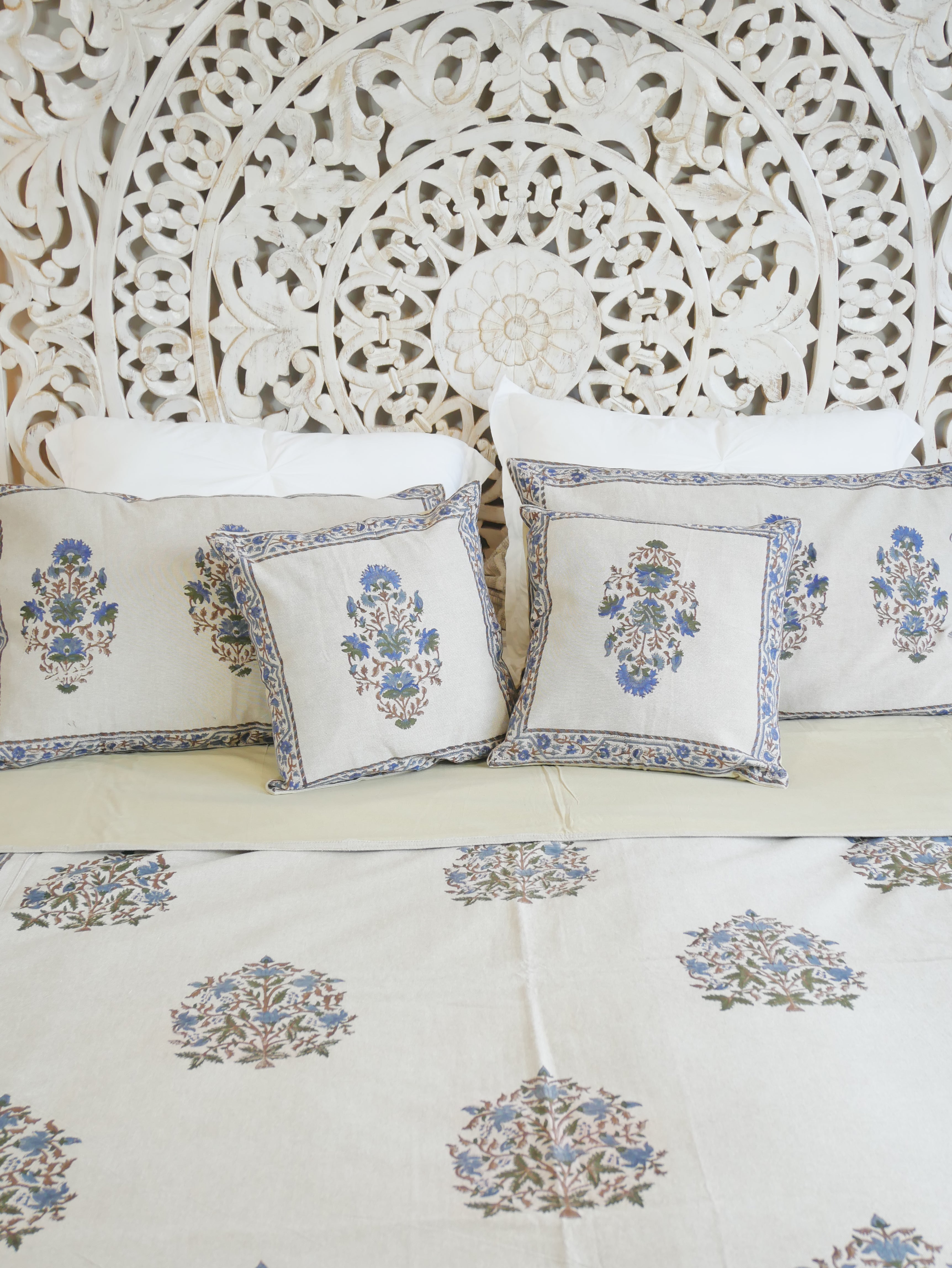 In linen look and made of coarsely woven, unbleached cotton, this beautiful bed cover set comes with 2 large and 2 small pillowcases, richly decorated with typical floral block print patterns from Rajasthan.