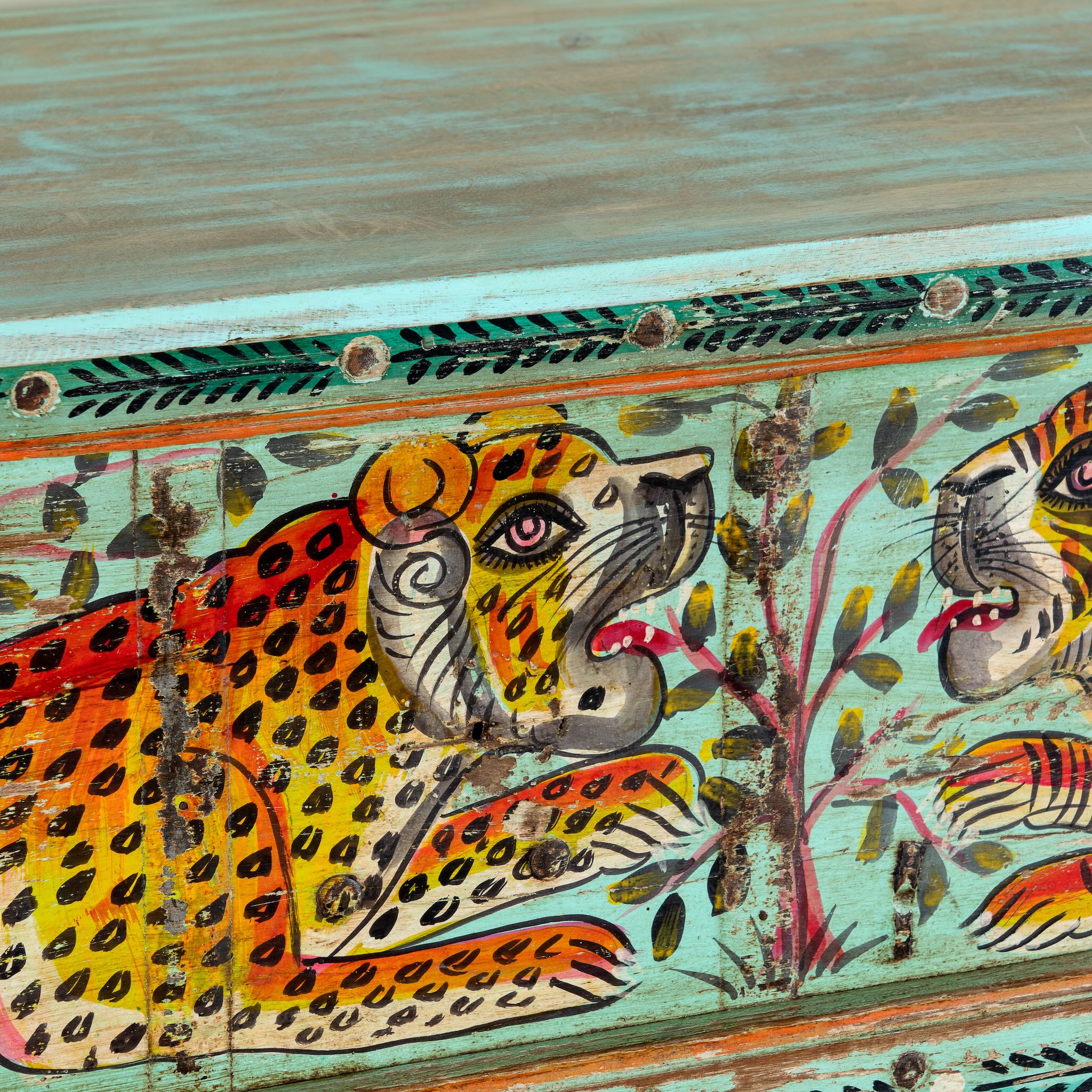 Design: Hand-painted tiger and leopard motif with carved legs and tribal-inspired details
