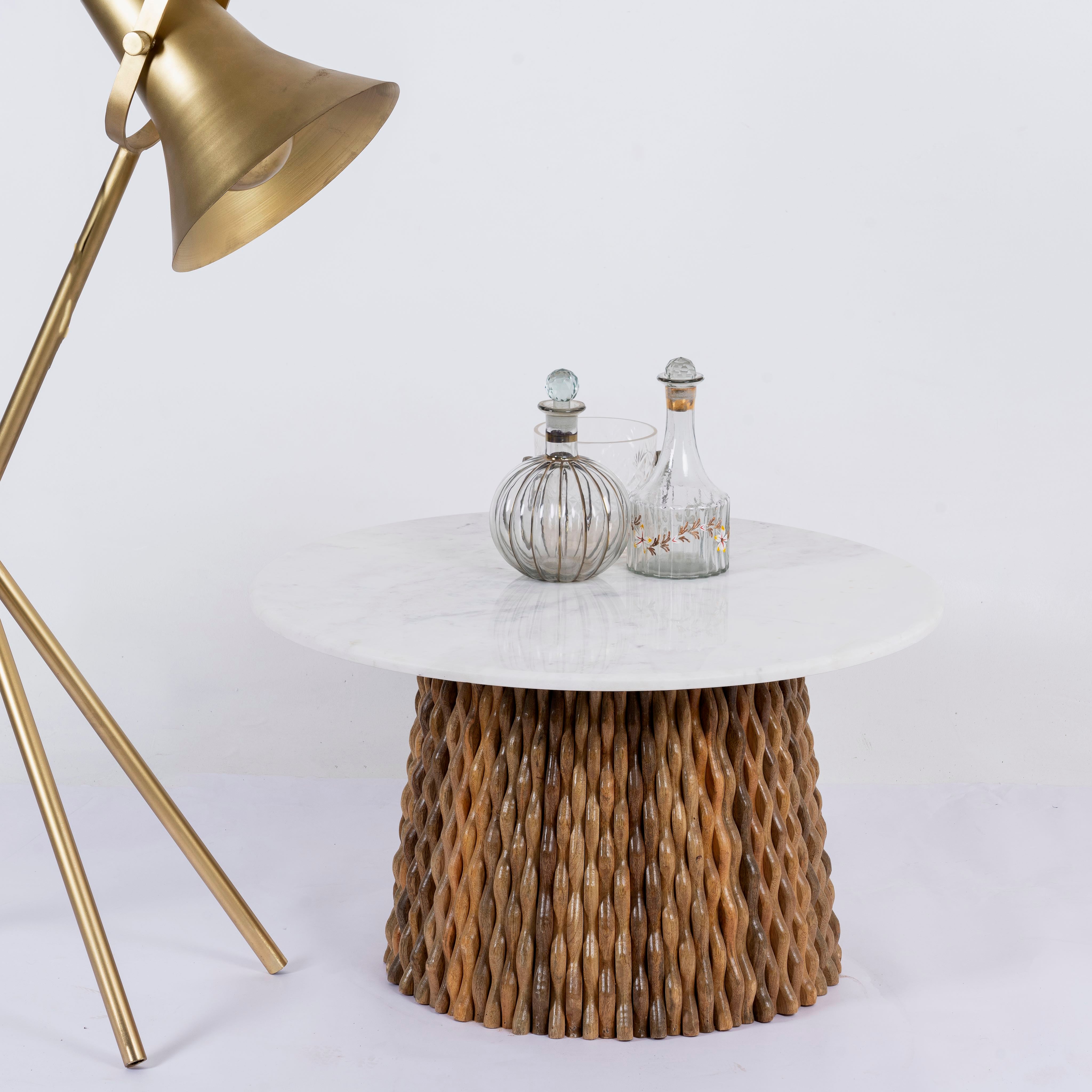 The round tabletop is made from polished natural marble, offering a cool, sleek contrast to the rich warmth of the mango wood base. Expertly handcrafted, the wooden base is composed of individually cut mango wood strips, meticulously arranged in a sculptural, strip-pattern design that highlights the artisan's skill and attention to detail.
