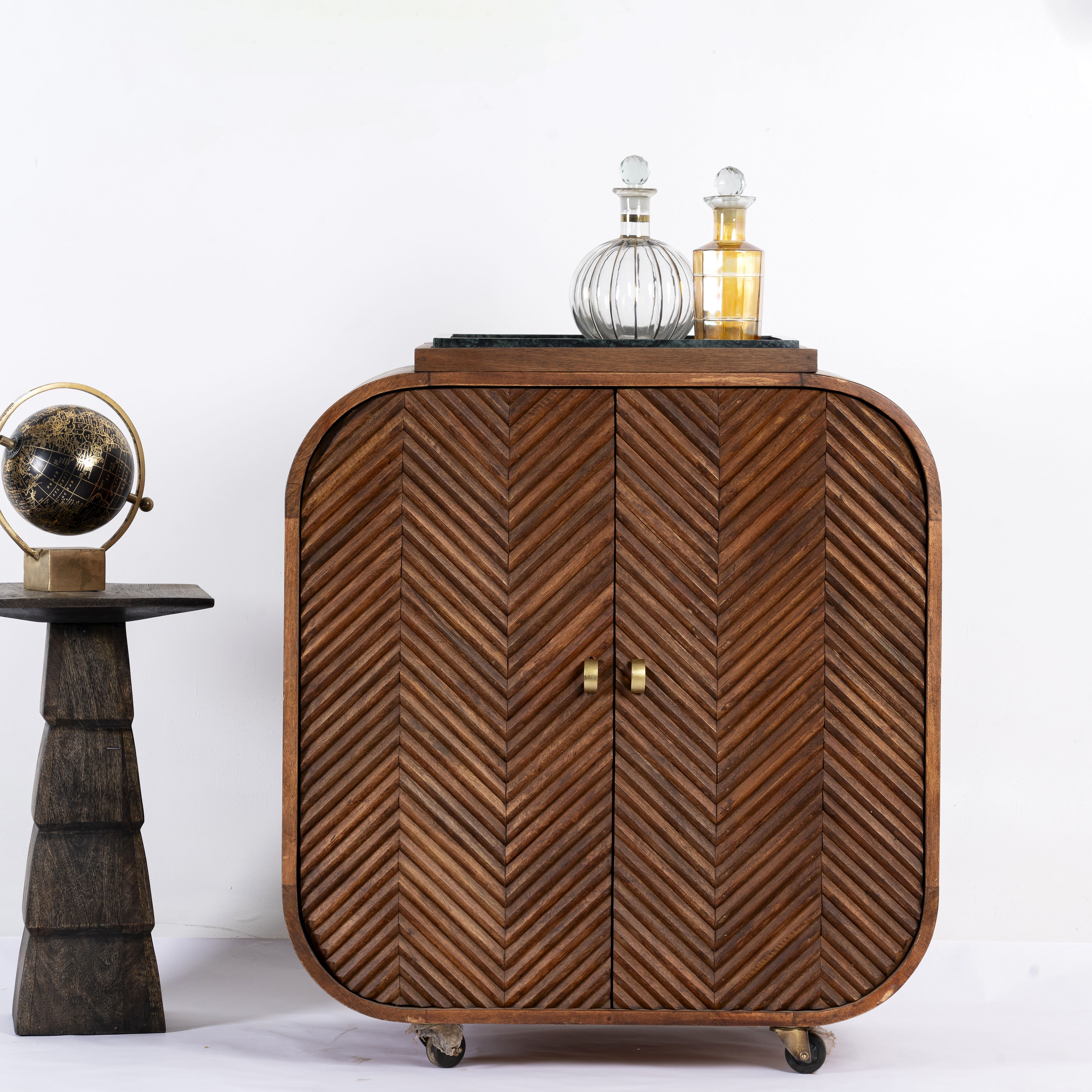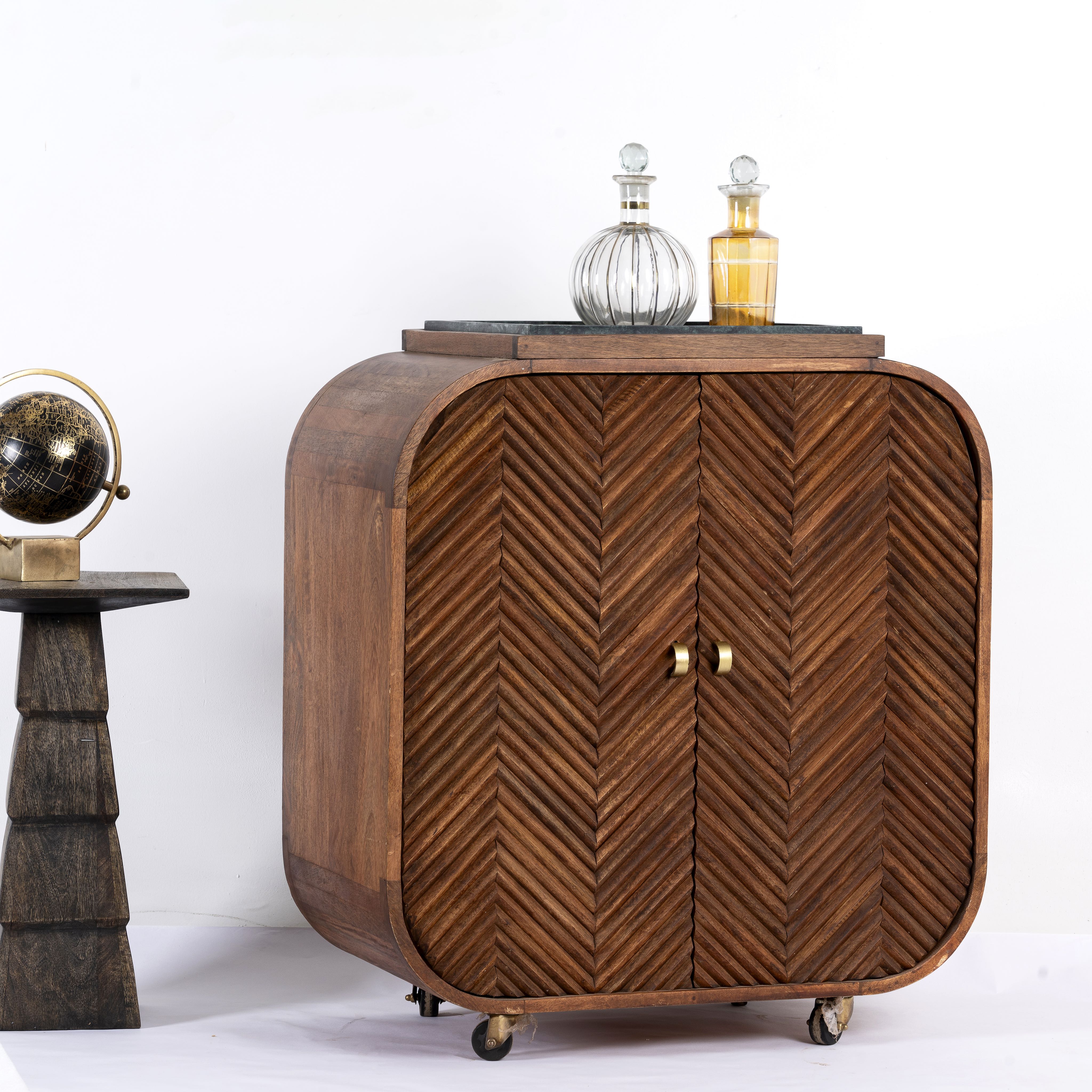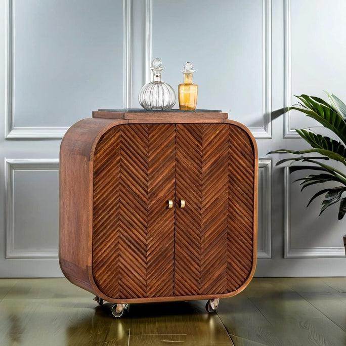 This stylish bar cart Anaadhi is meticulously crafted from mango wood, featuring a distinctive chevron-patterned wooden inlay. It combines functionality with elegance, boasting a grey marble tray and brass-coated handles and wheels that elevate its aesthetic appeal.