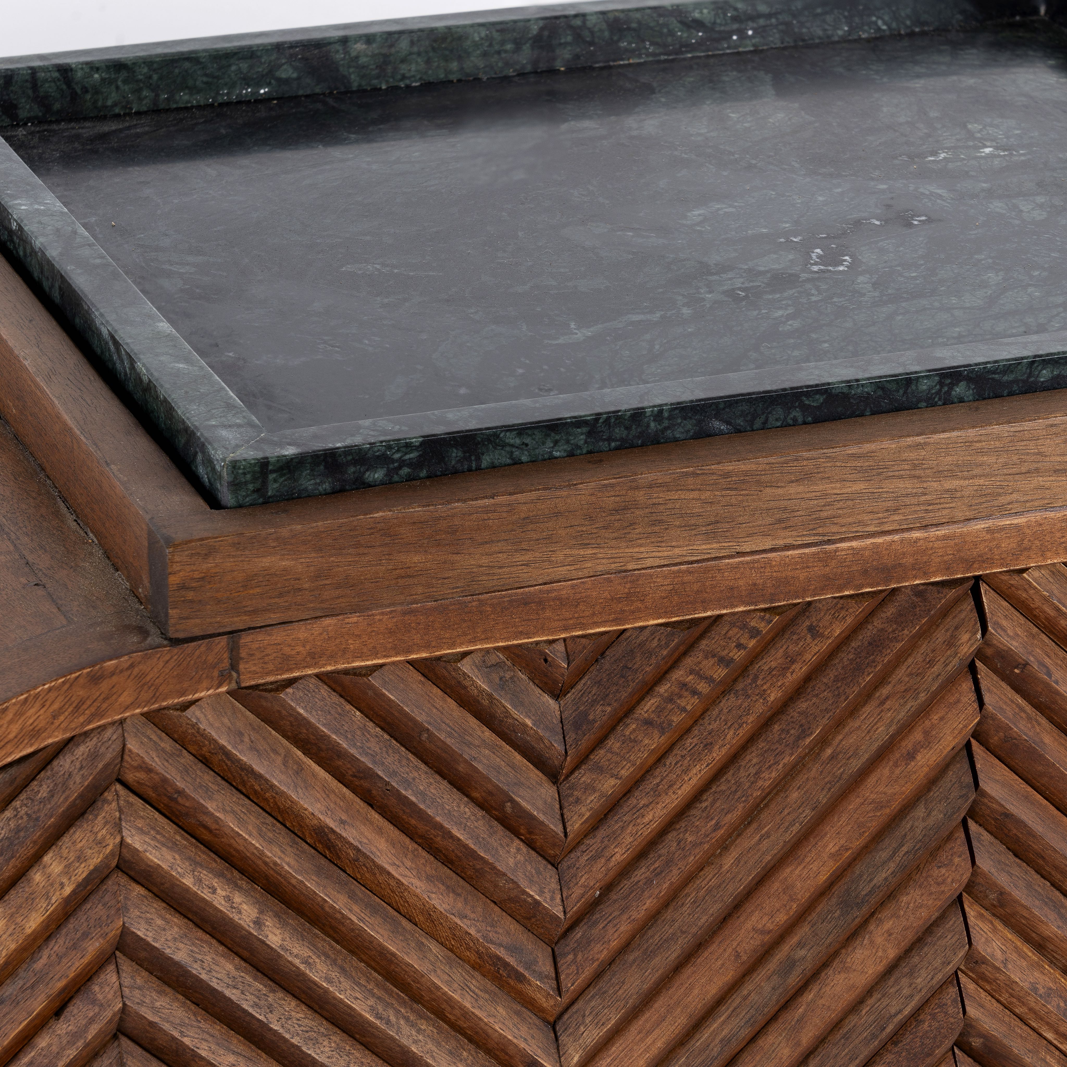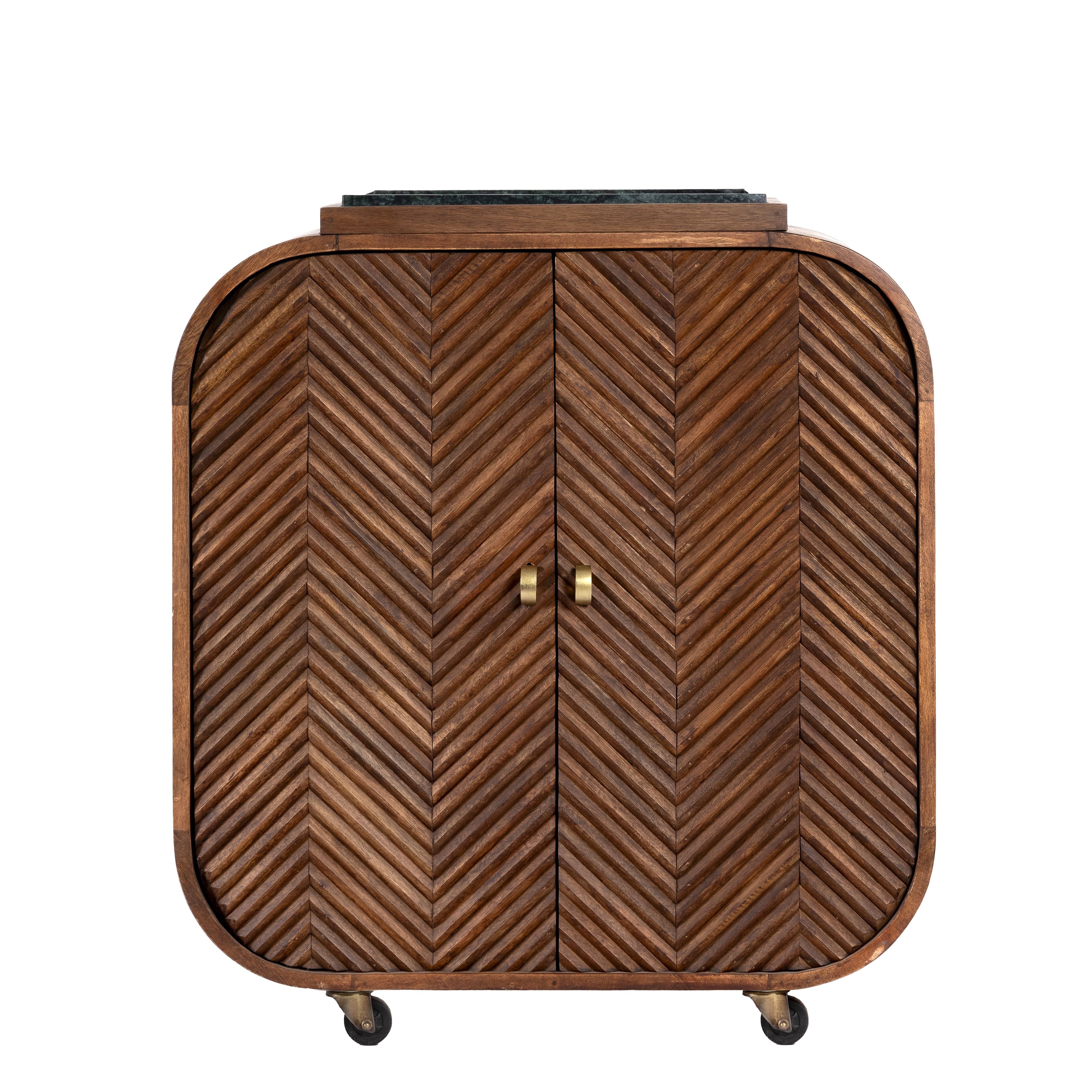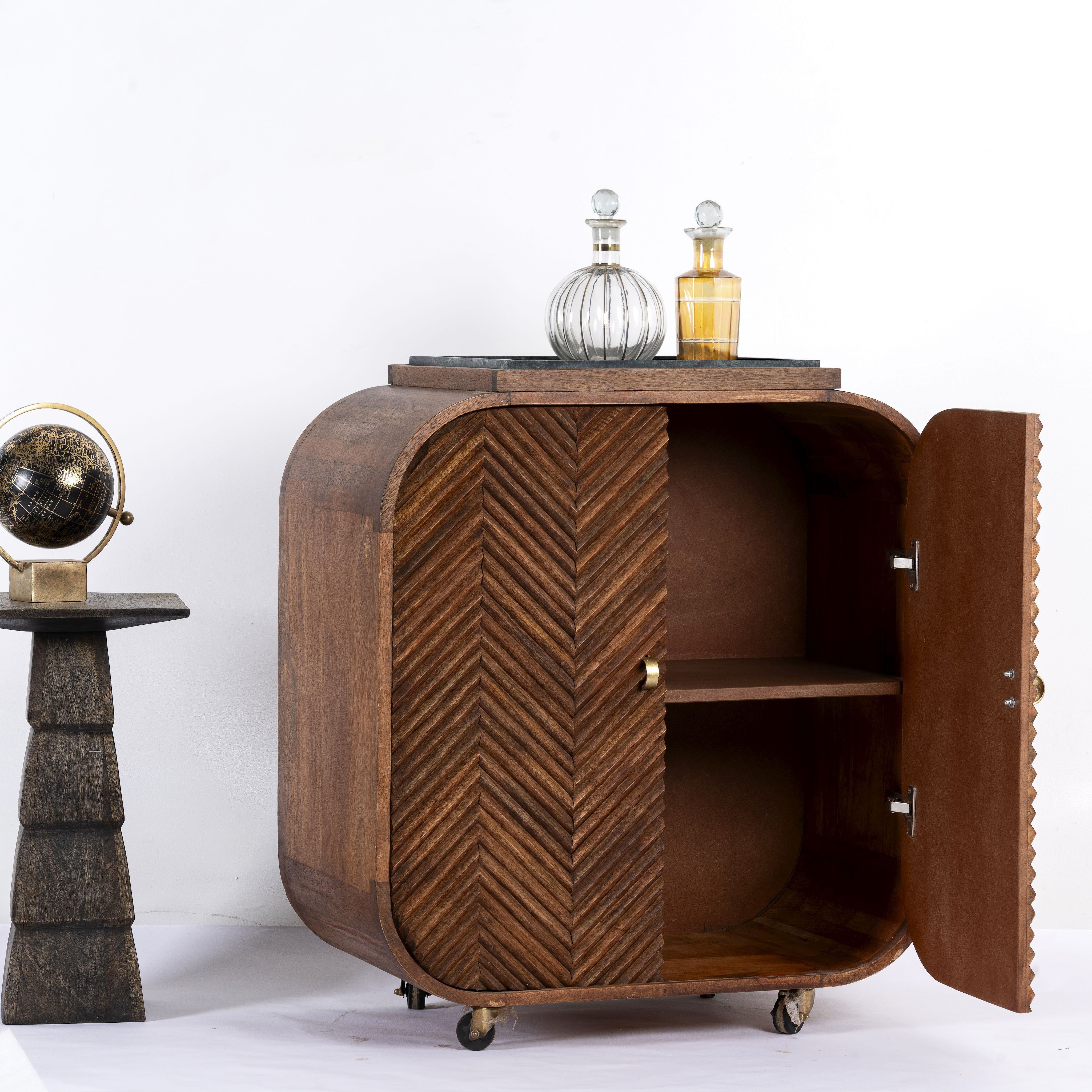 This stylish bar cart Anaadhi is meticulously crafted from mango wood, featuring a distinctive chevron-patterned wooden inlay. It combines functionality with elegance, boasting a grey marble tray and brass-coated handles and wheels that elevate its aesthetic appeal.