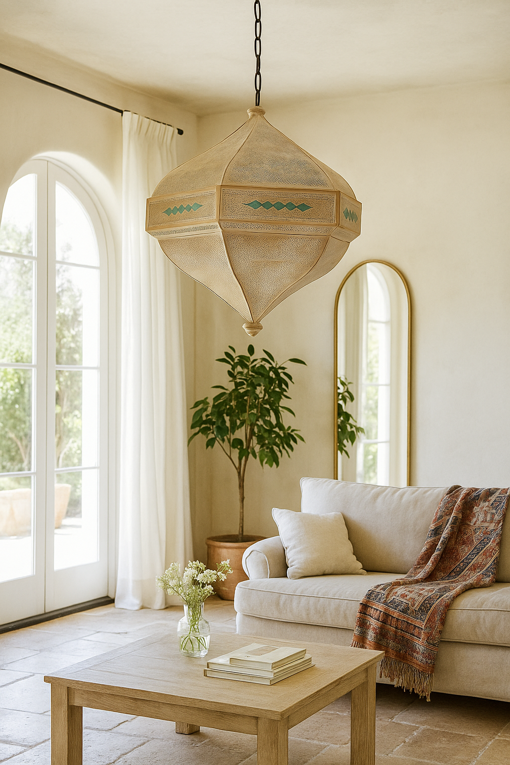 The sand-coloured patina and subtle turquoise accents lend Lahar a vintage yet contemporary charm. Its finely perforated surface creates intricate shadow patterns that dance across the room, delivering both elegance and atmosphere. A true gem among metal pendant lights, Lahar brings softness and sophistication to your interior.