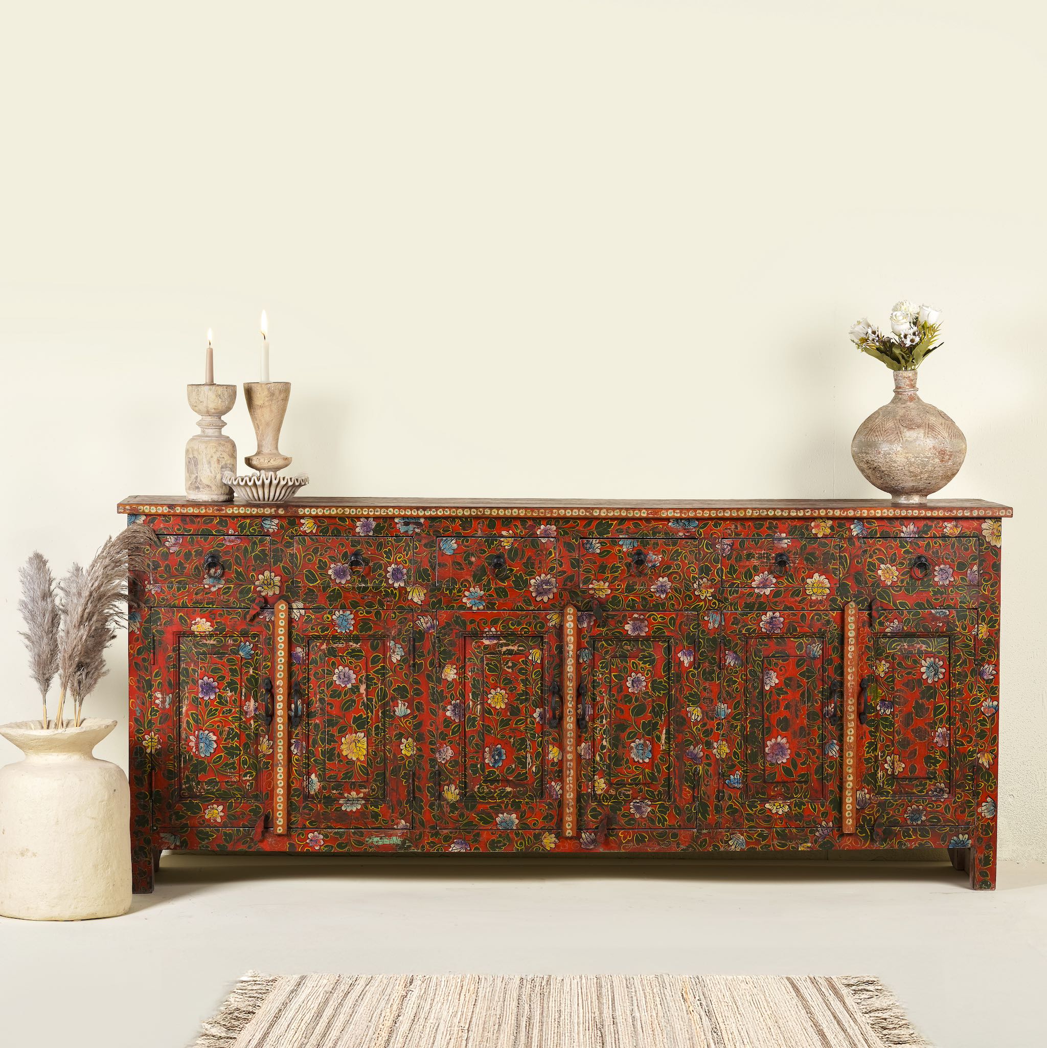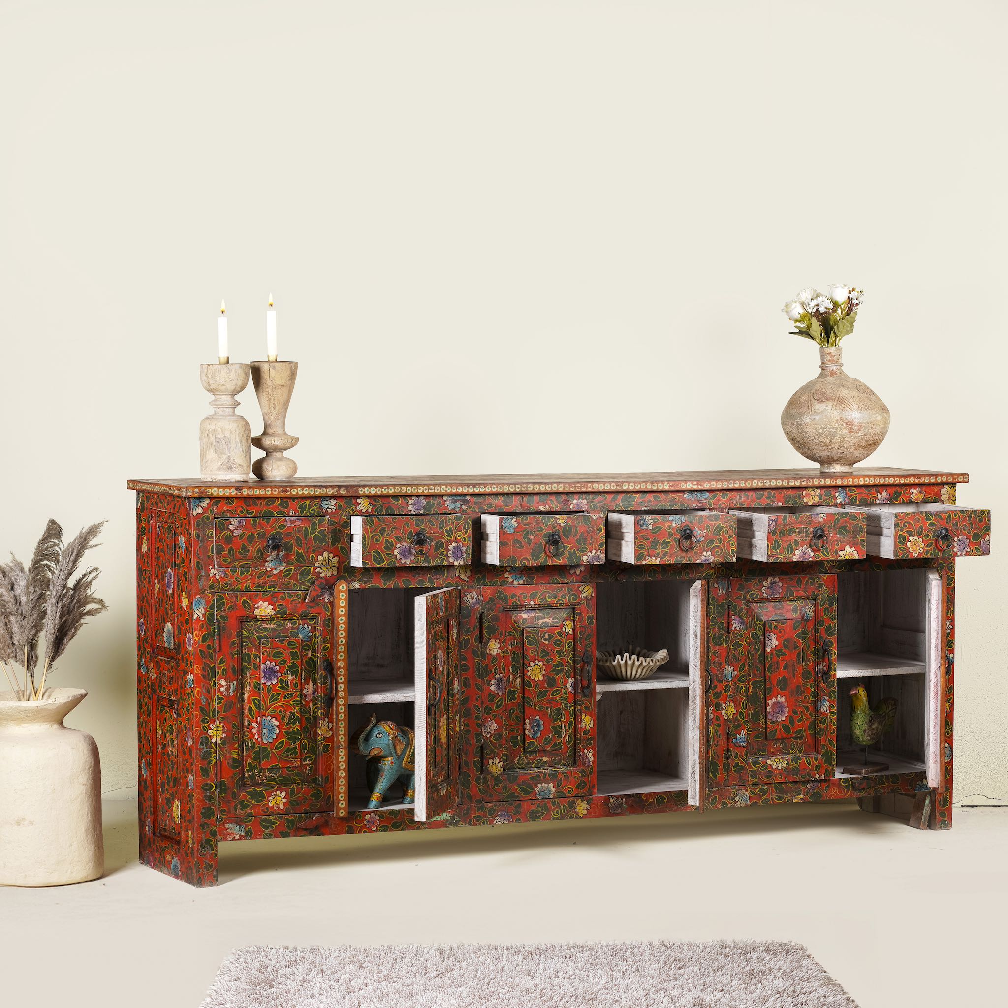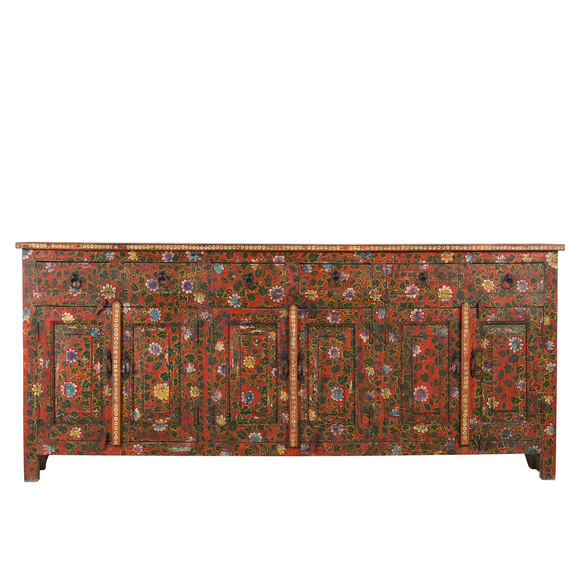Every inch of this cabinet is adorned with elaborate, hand-painted floral motifs, celebrating traditional craftsmanship and timeless design. The vivid colours and meticulous detailing transform the piece into a functional work of art, perfect for those who seek decor that tells a story.